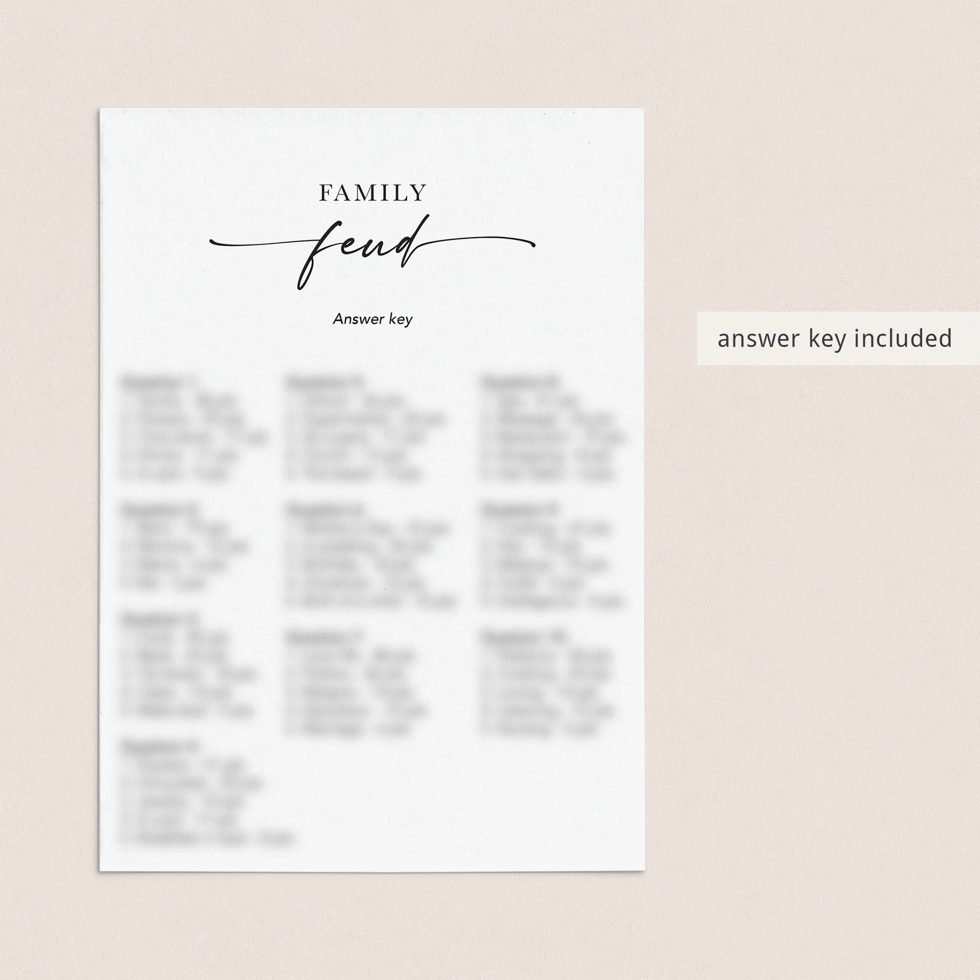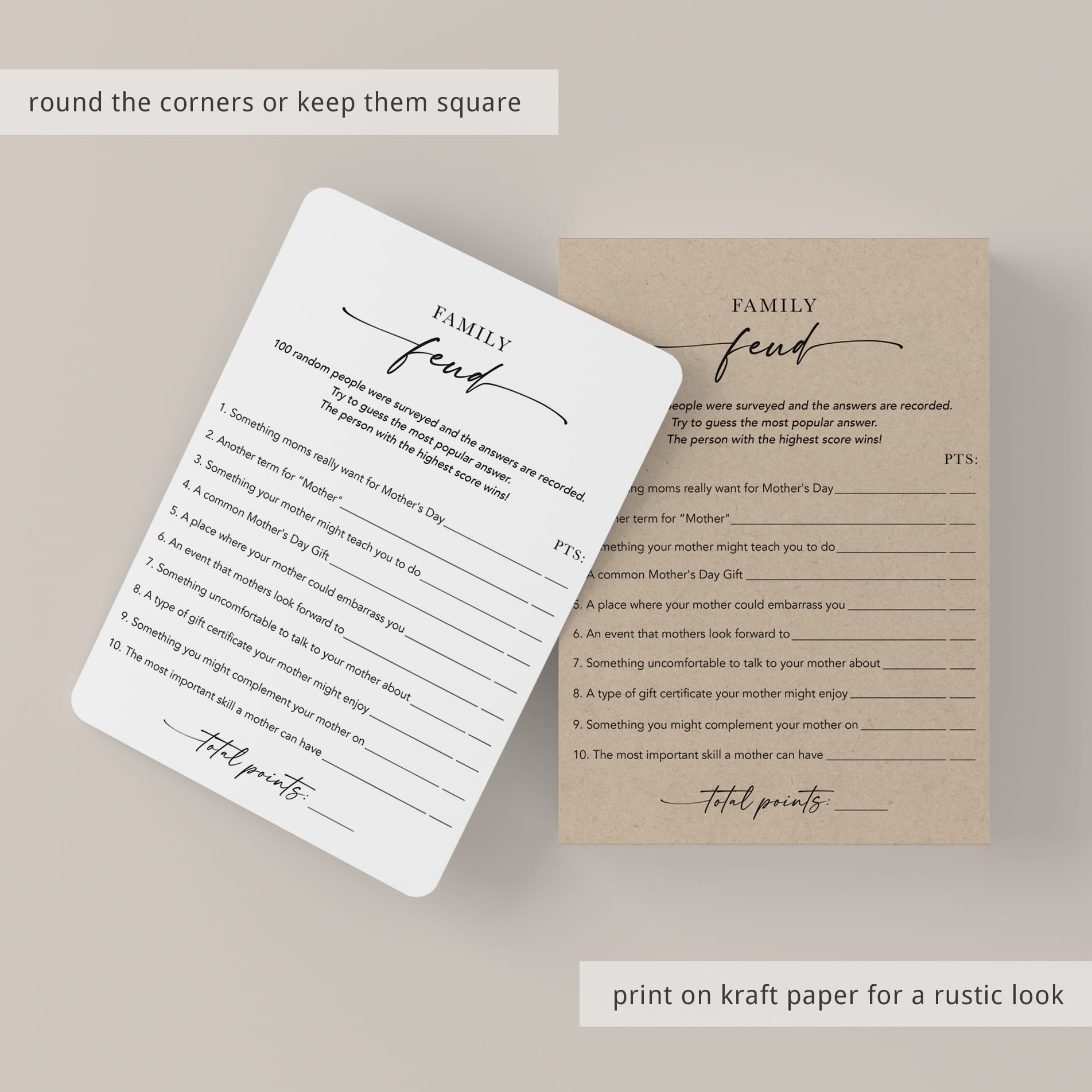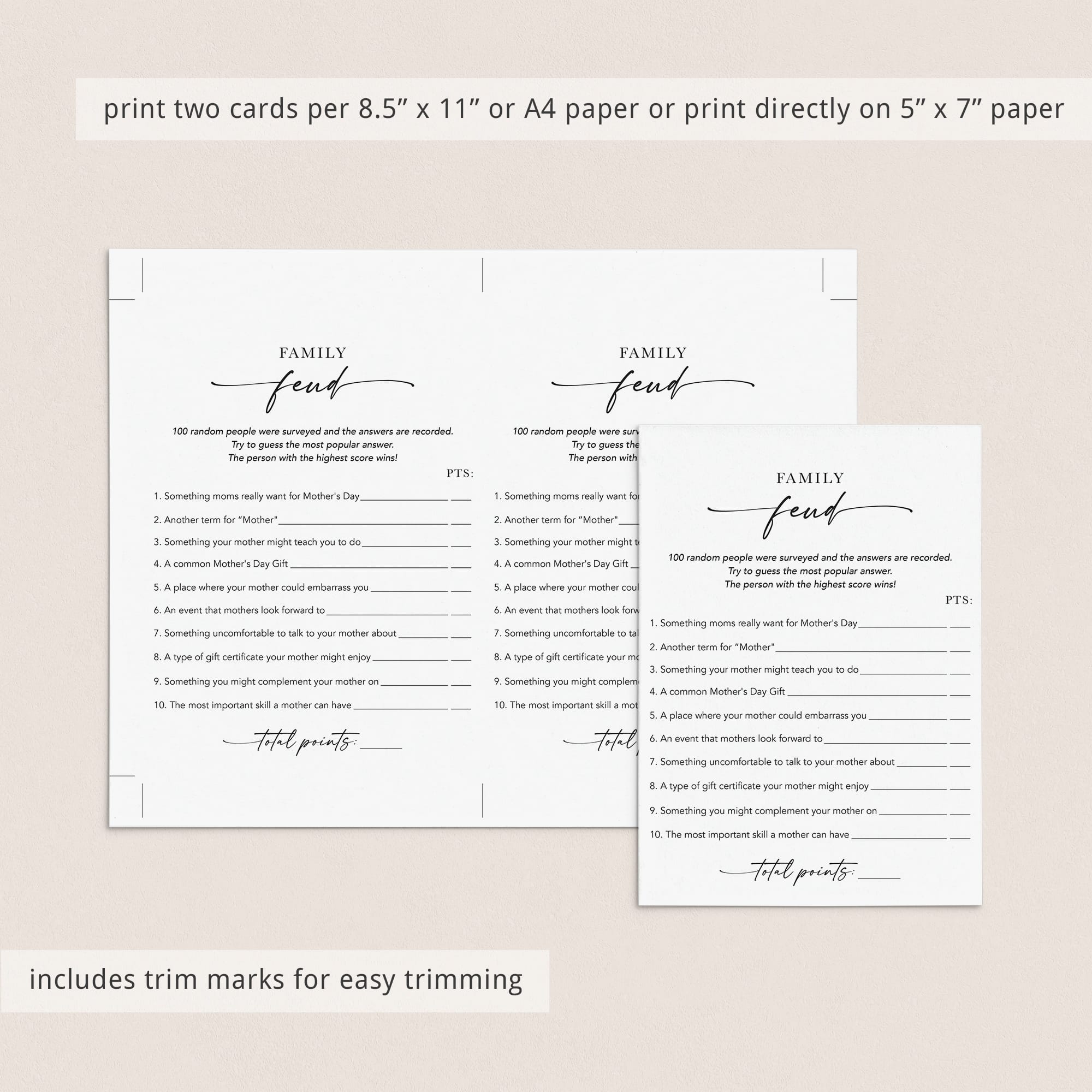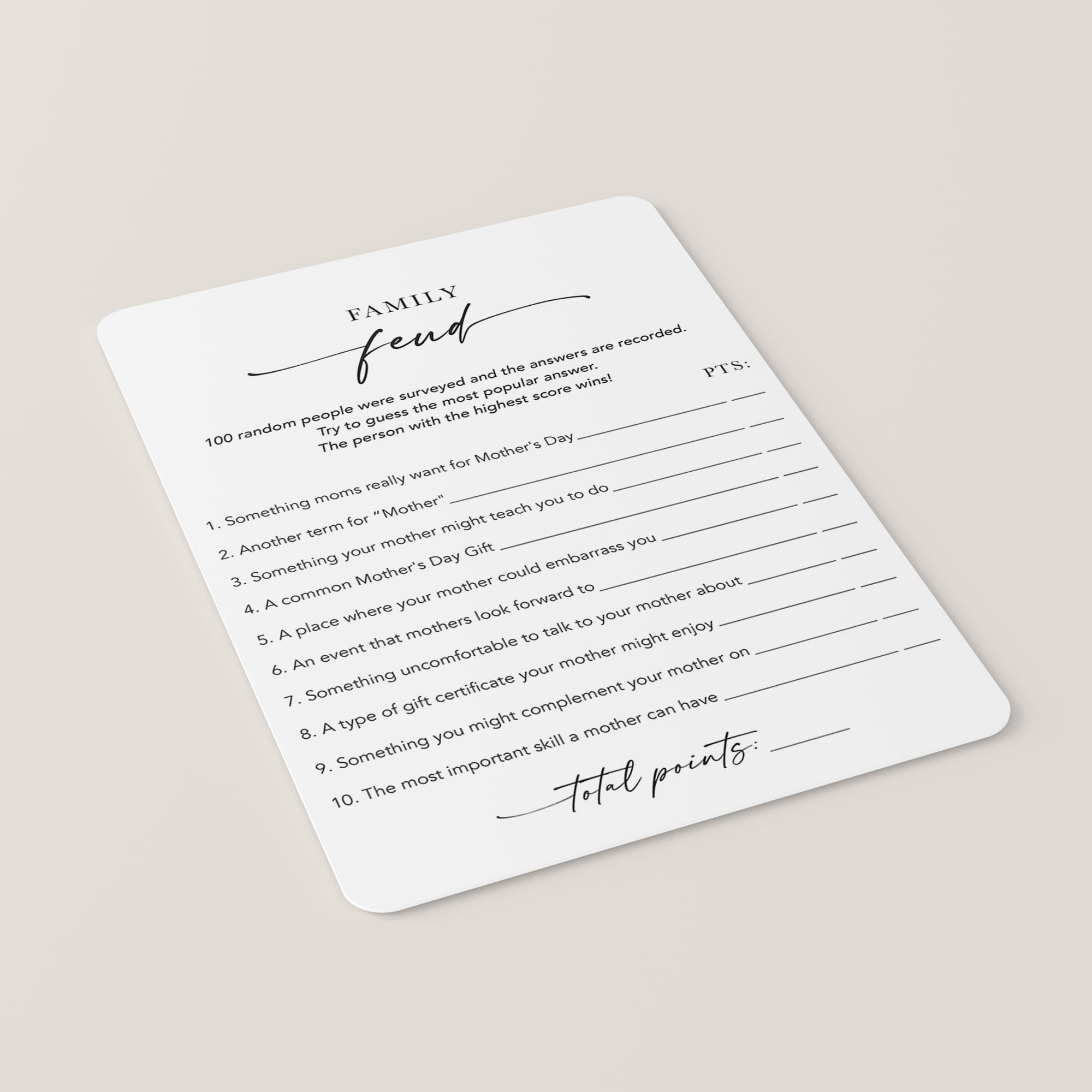 Are you looking for a fun Mother's Day game to play with family and friends? Play Family Feud the Mother's Day Edition with this elegant game card with modern script font.