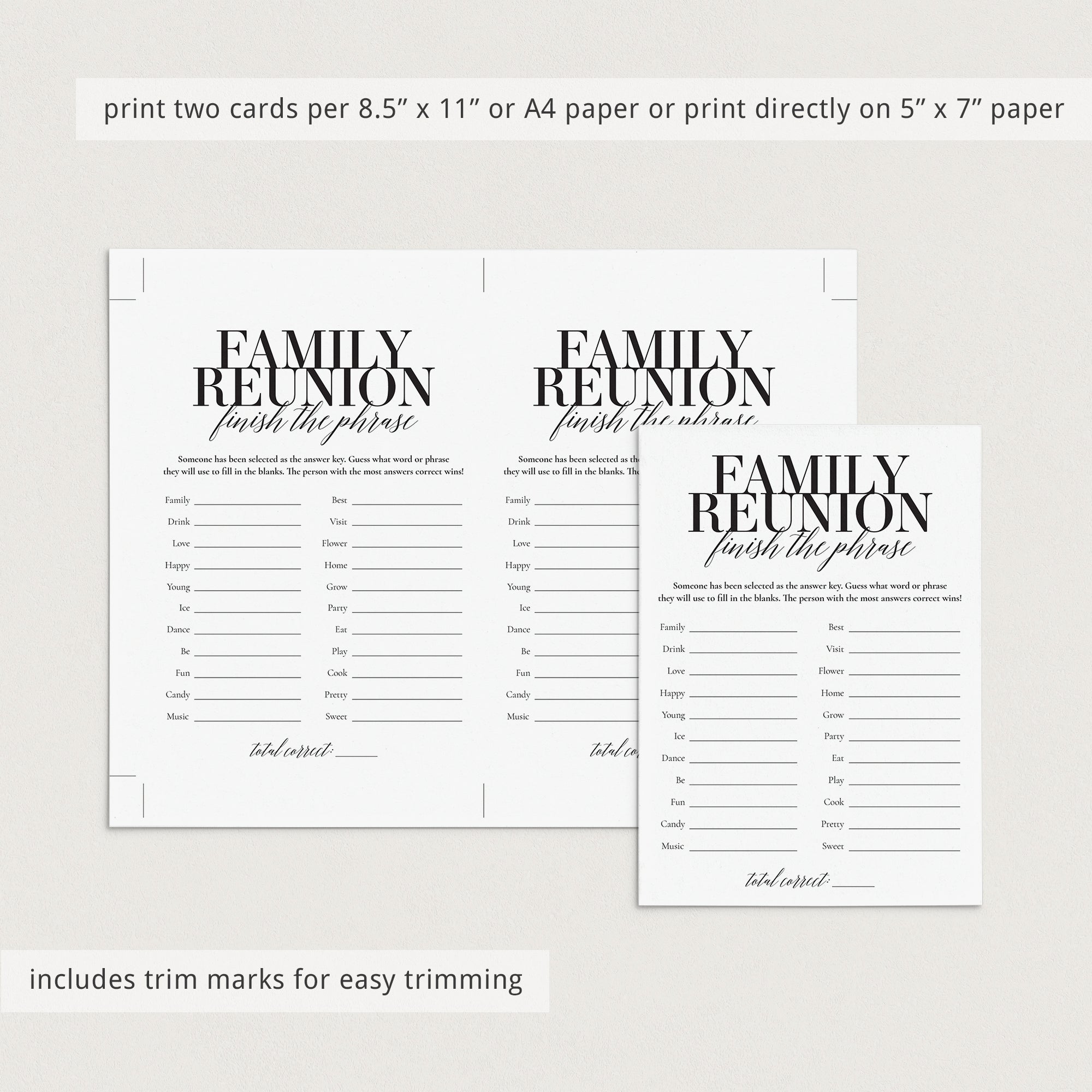 Are you looking for a last minute icebreaker game for your family reunion party? Play Finish The Phrase with these modern black and white game cards. It's a great game to play with a large group of relatives.