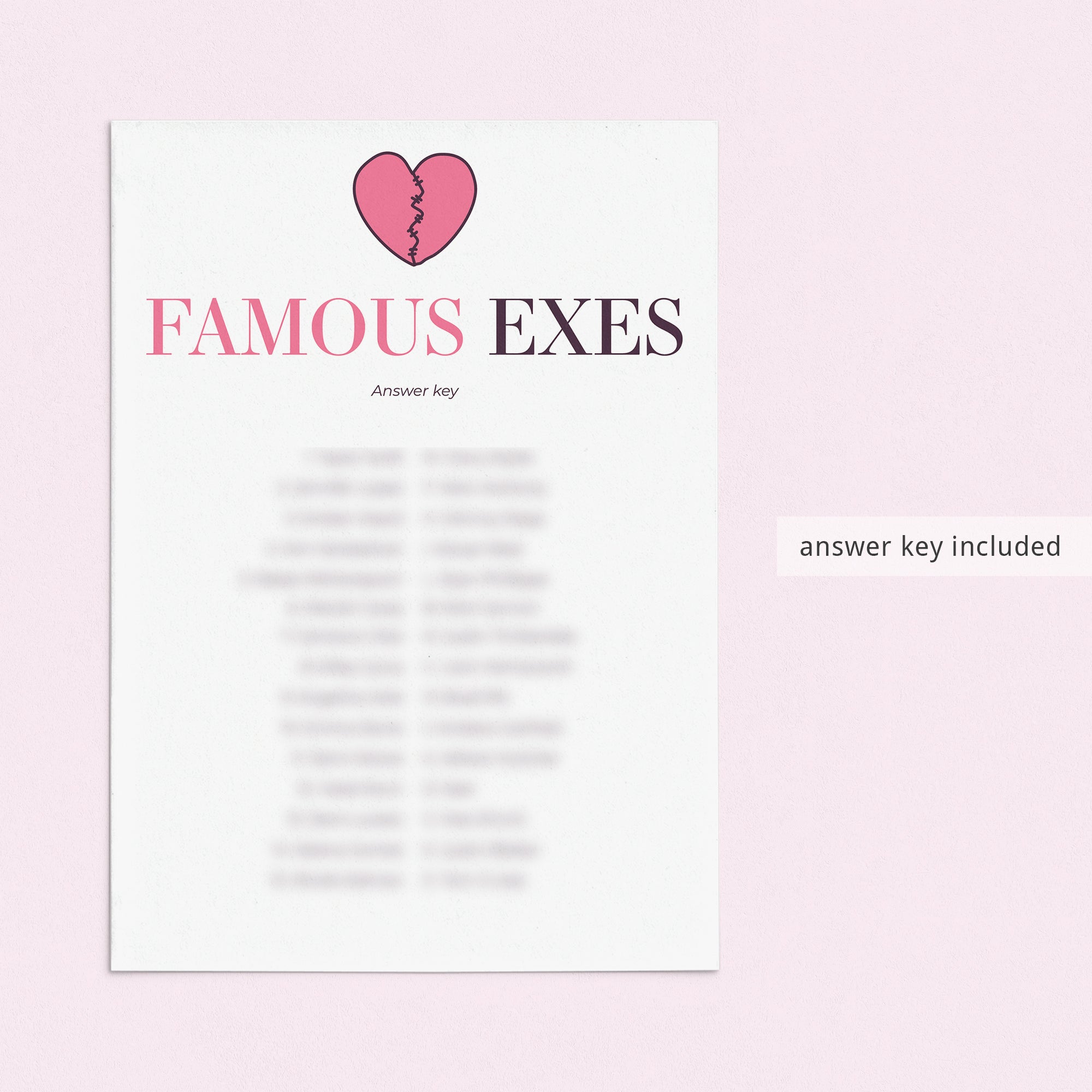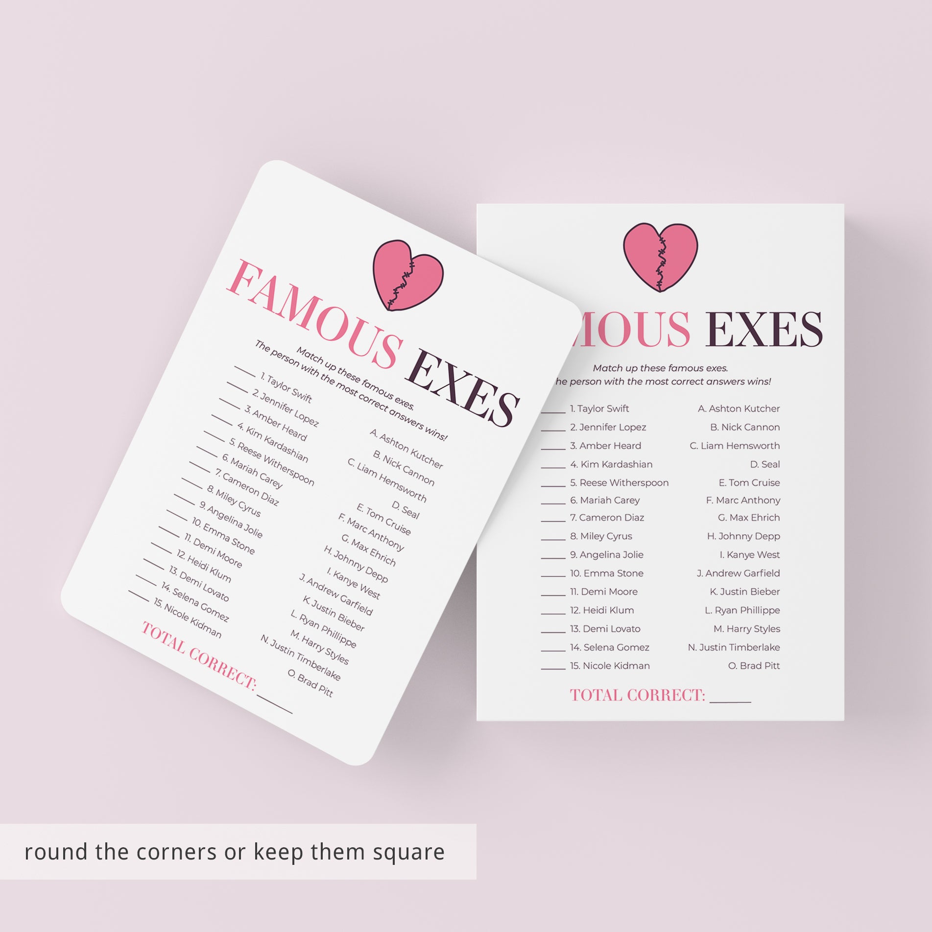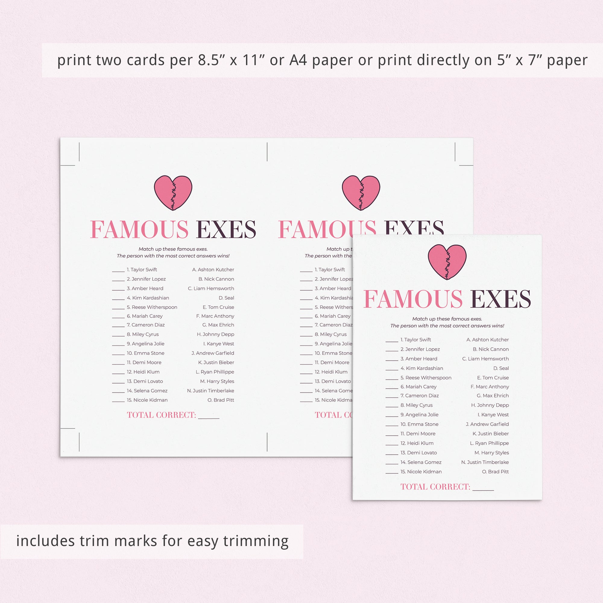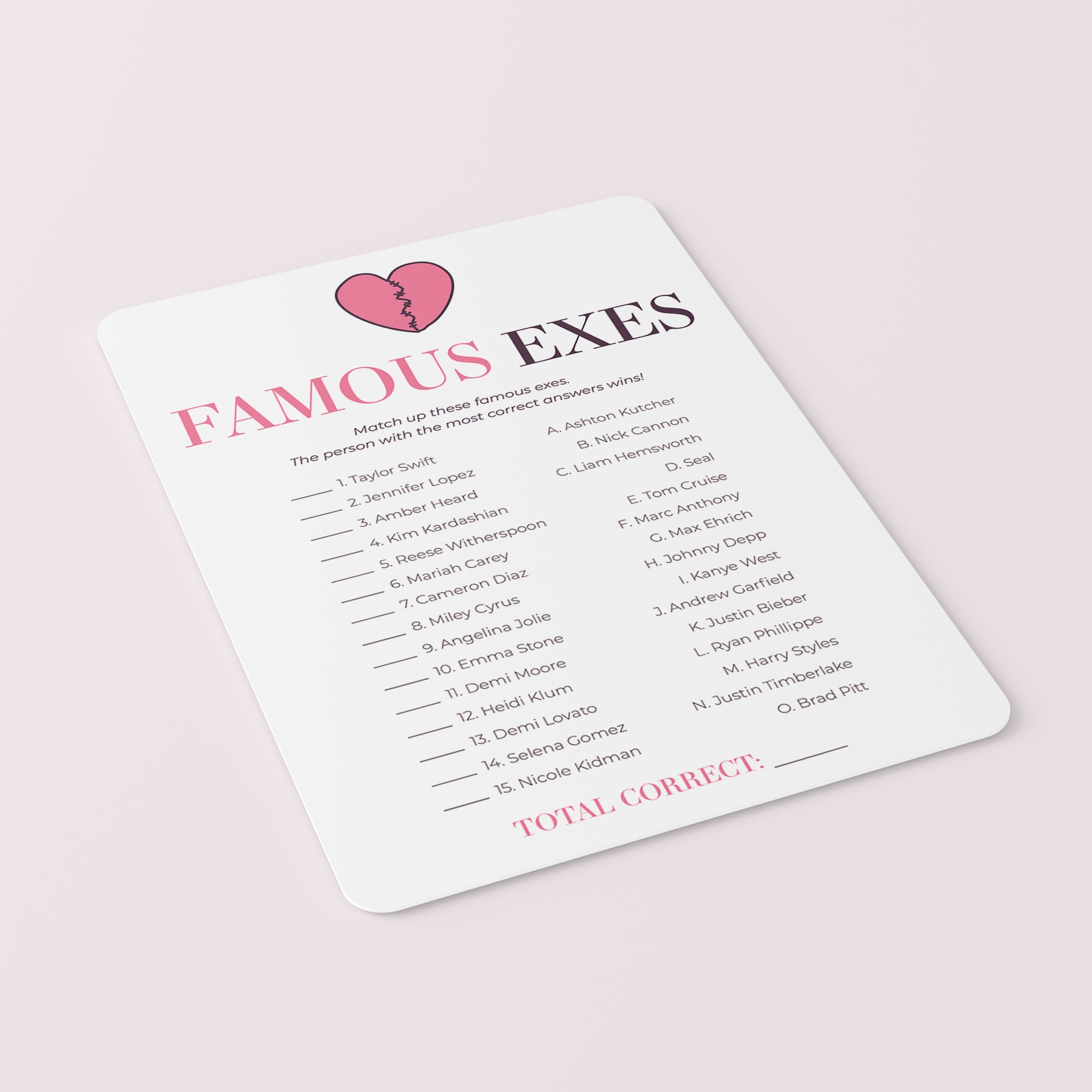 The game is very easy to play. Hand out this famous exes match up game to your guests. Have them match the celebrity exes. The person with the most correct answers wins. An answer key is included.