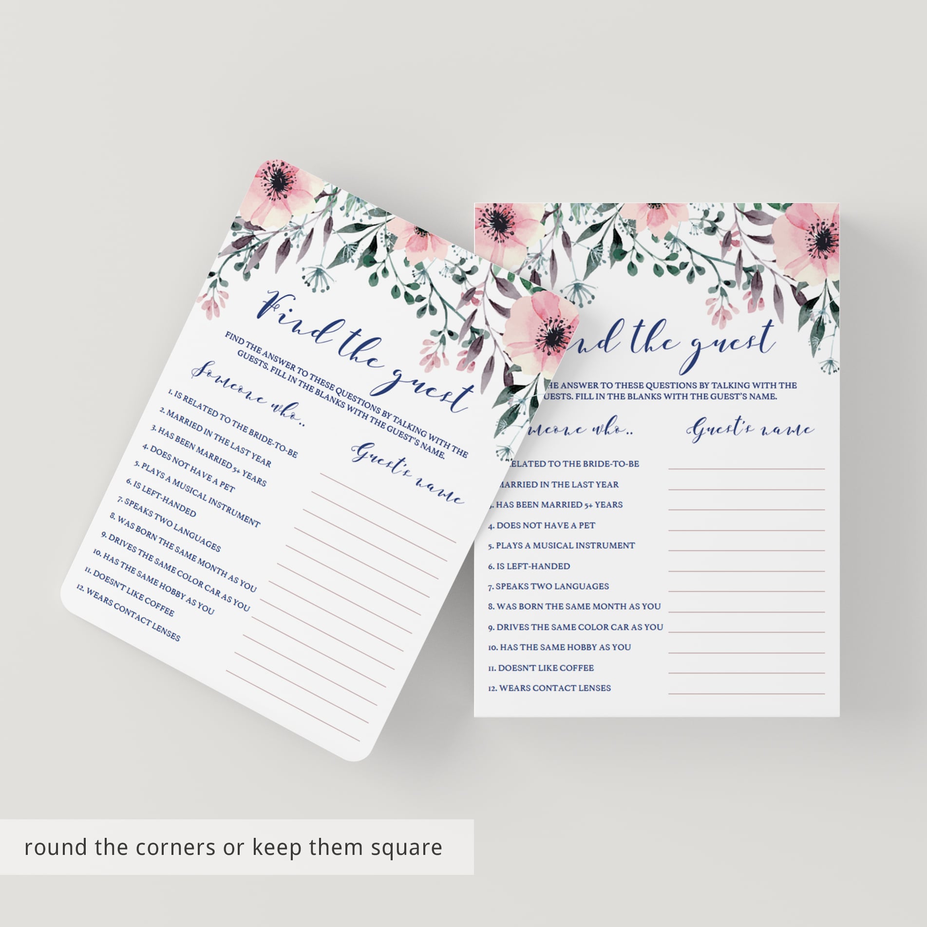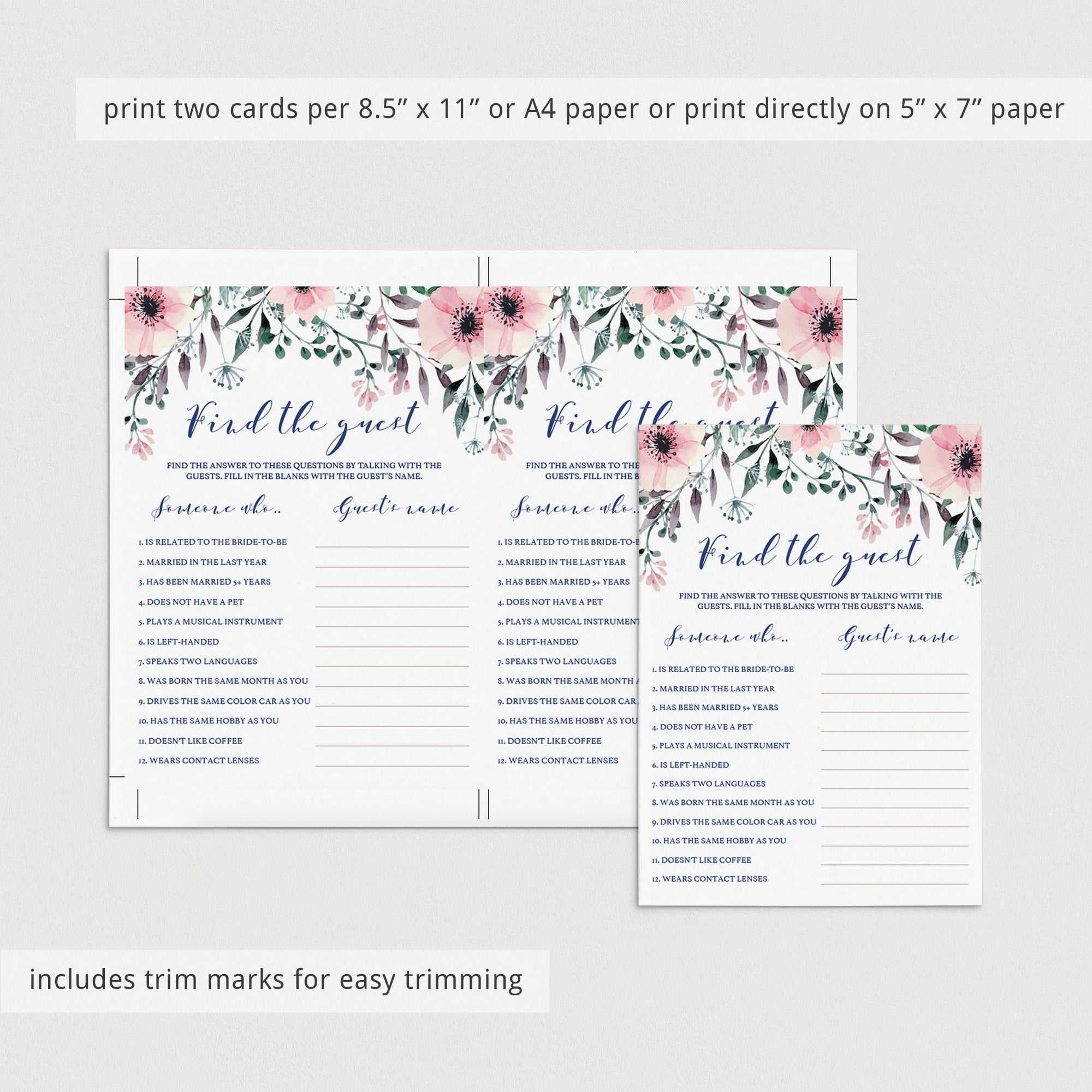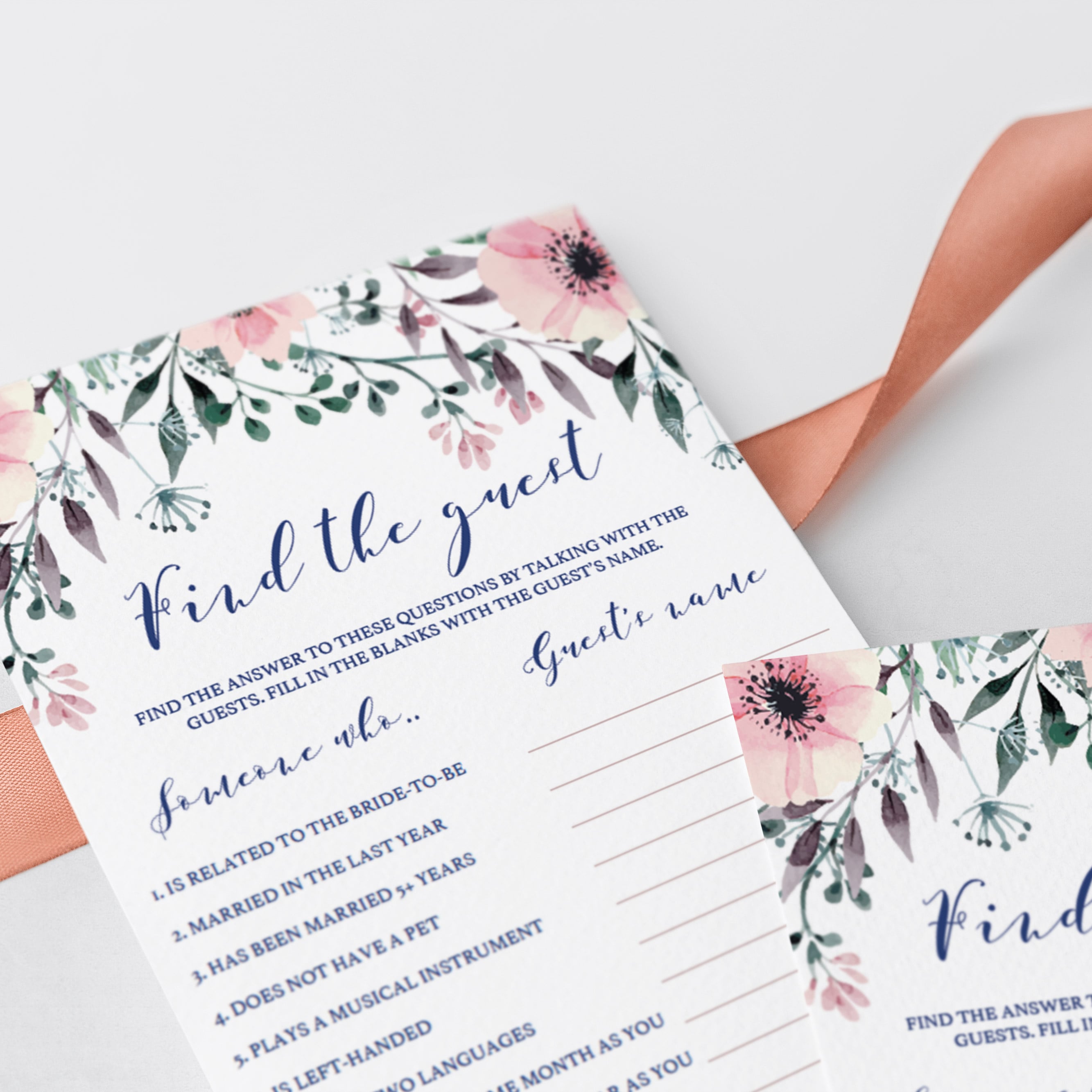 Ensure that your bridal shower guests mingle with this fun Find the Guest bridal shower game. It's the perfect way to break the ice! Add your own information and let your guests find the person that matches the description. The game cards with lush pink flowers and greenery are great for a floral wedding shower.