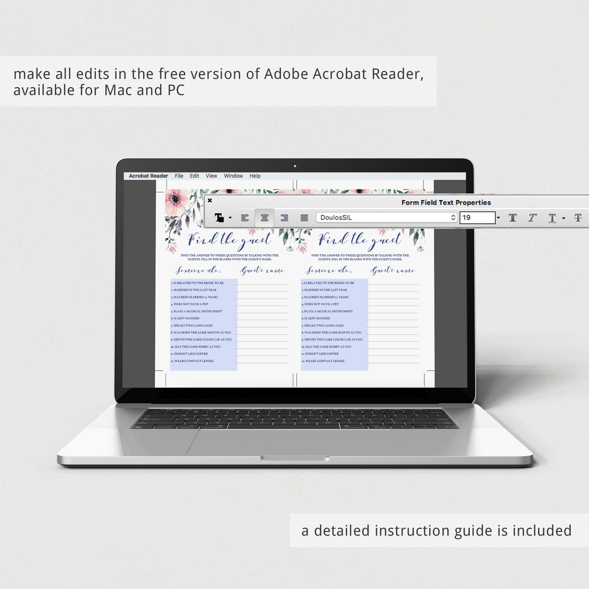 This bridal shower game template is editable in Adobe Acrobat Reader (free download). After downloading the file, fill in your details and print in just minutes.