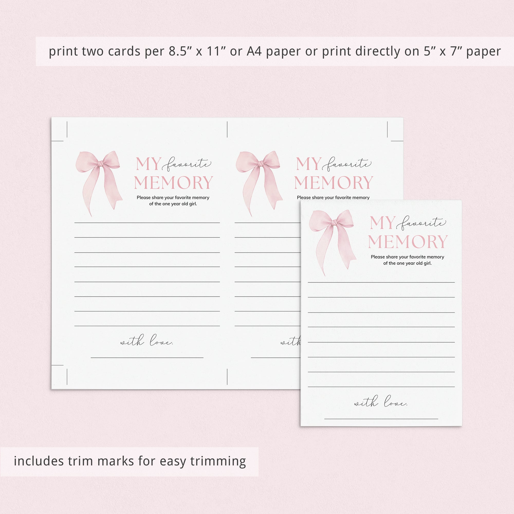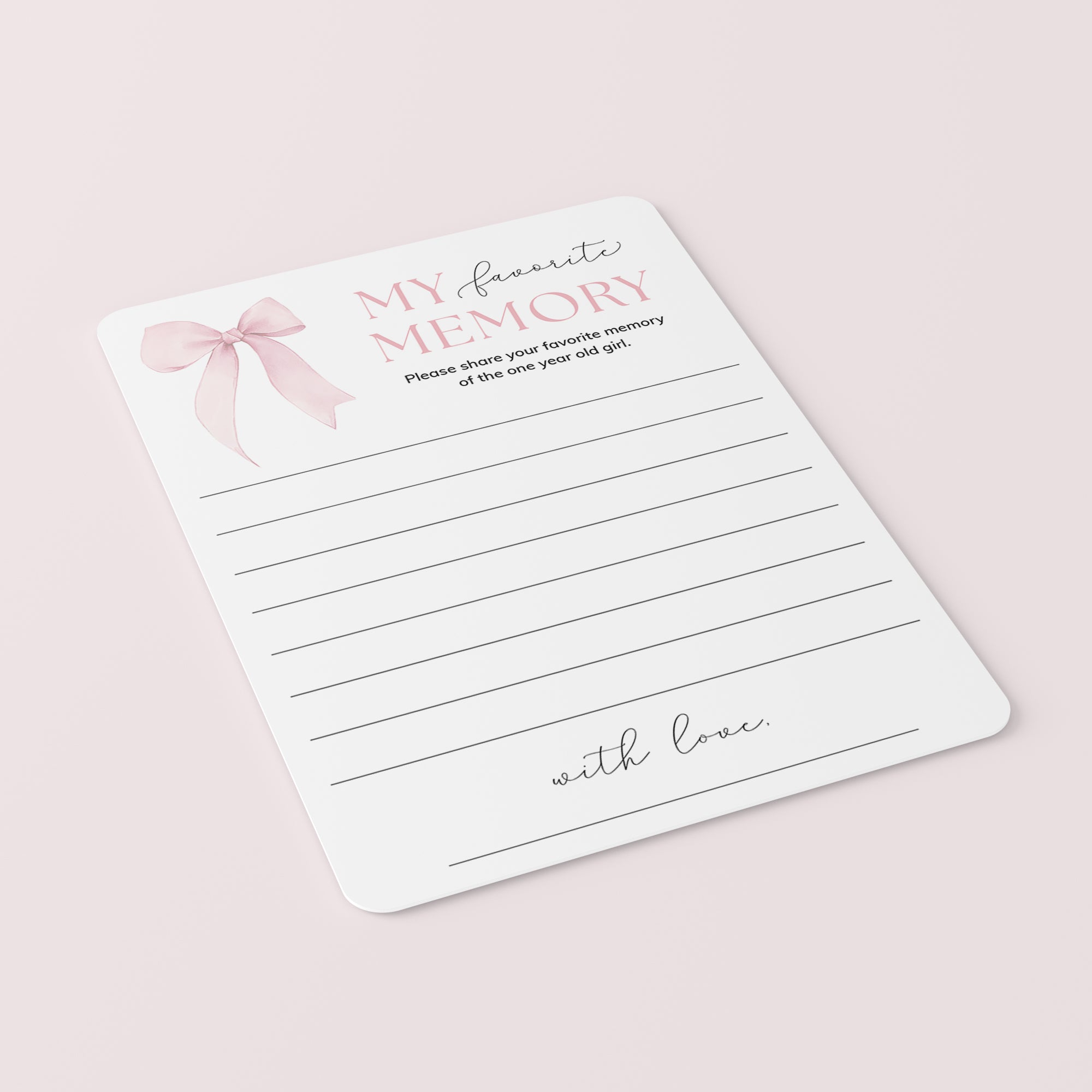 Are you looking for a memorable ice breaker game and keepsake for your girl's first birthday party? Have your guests share their Favorite Memory of The One Year Old Girl with these gorgeous birthday memory cards with watercolor pink bow. It's the perfect addition to any baby girl's first birthday party and it's sure to be a hit!