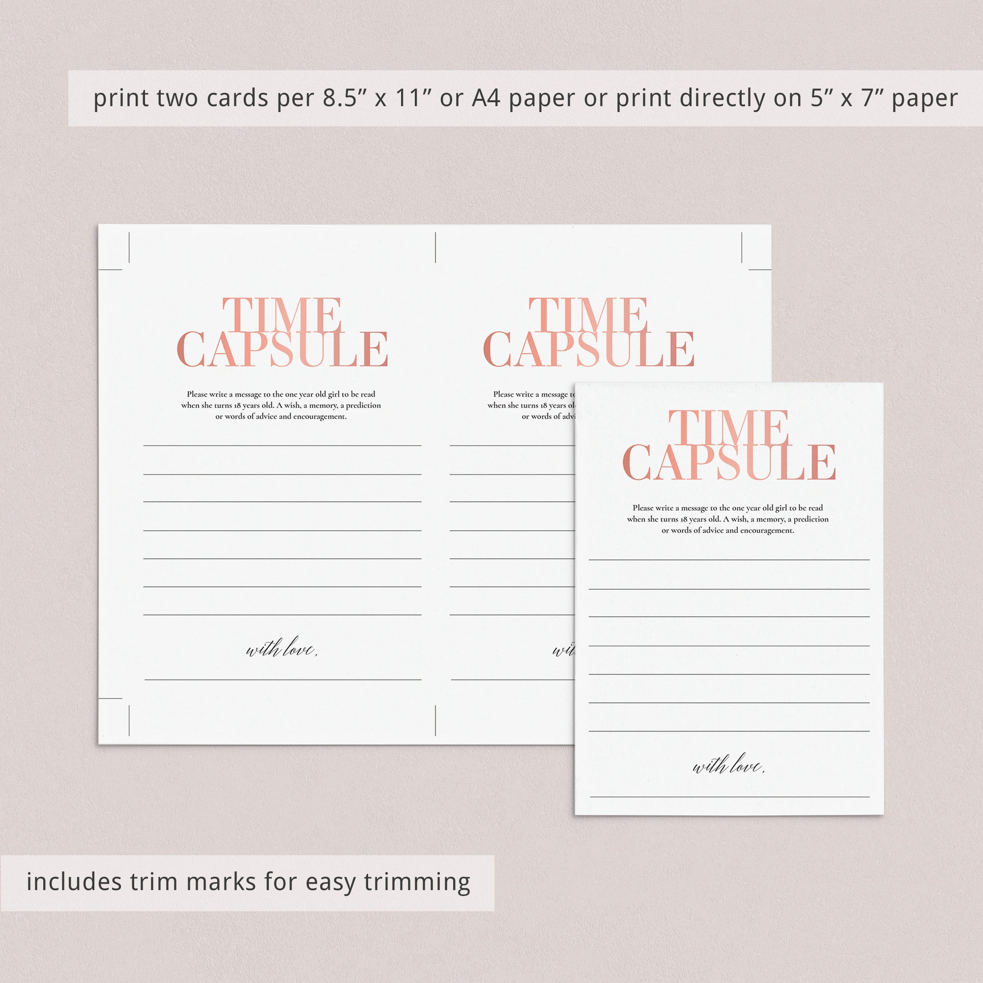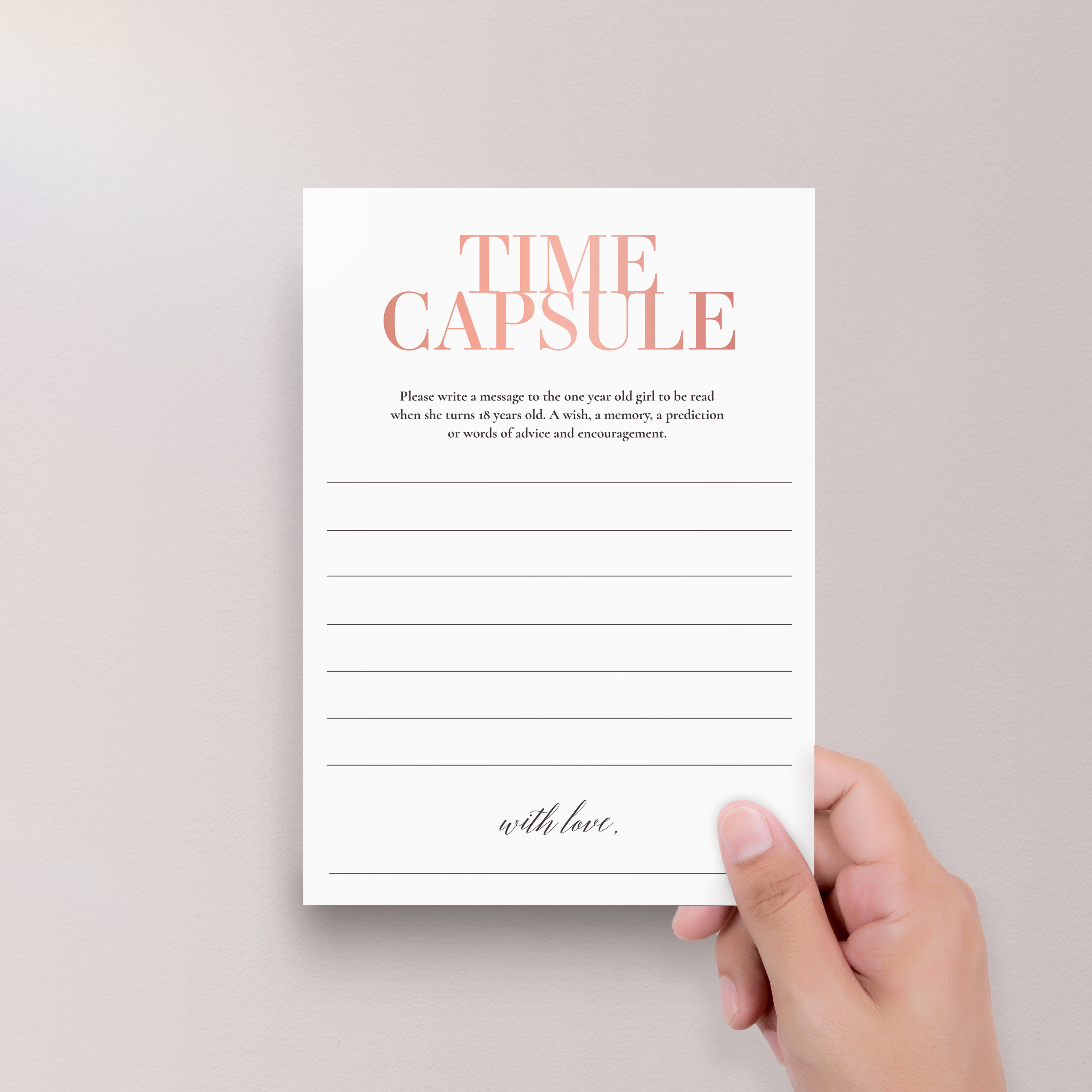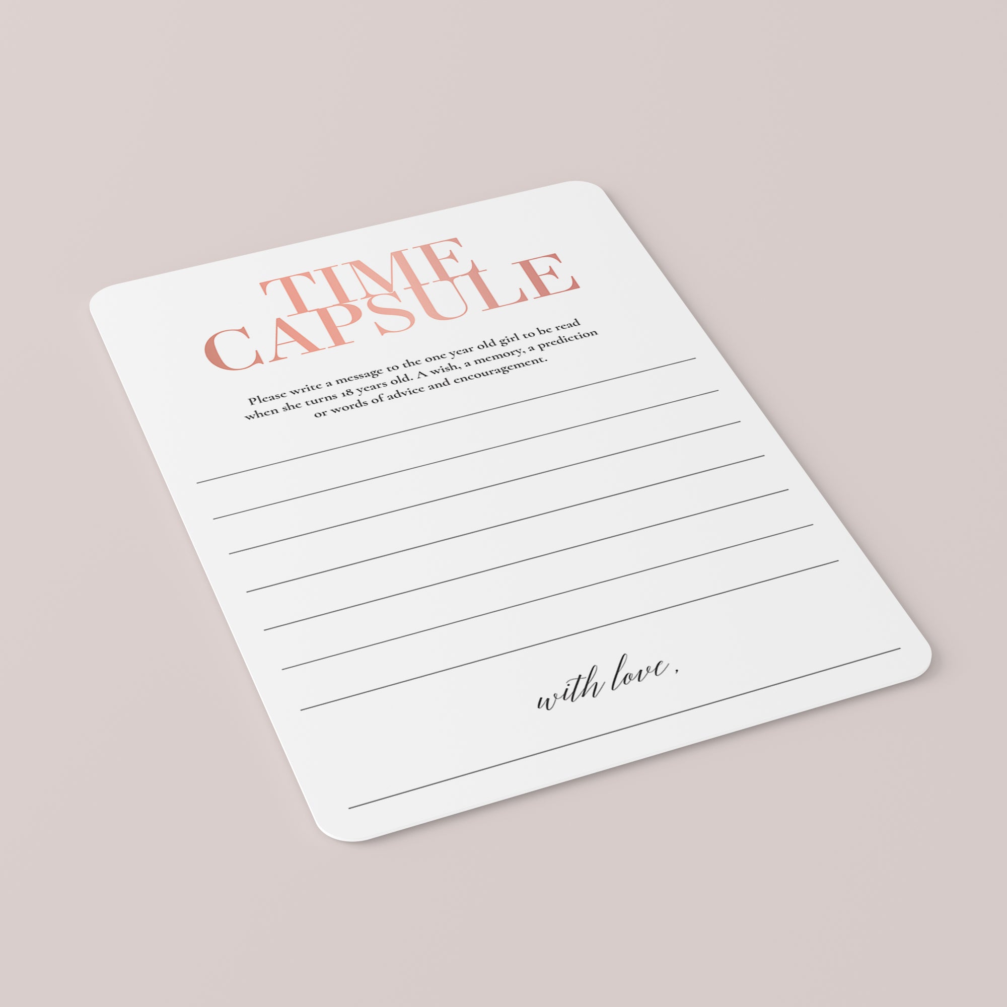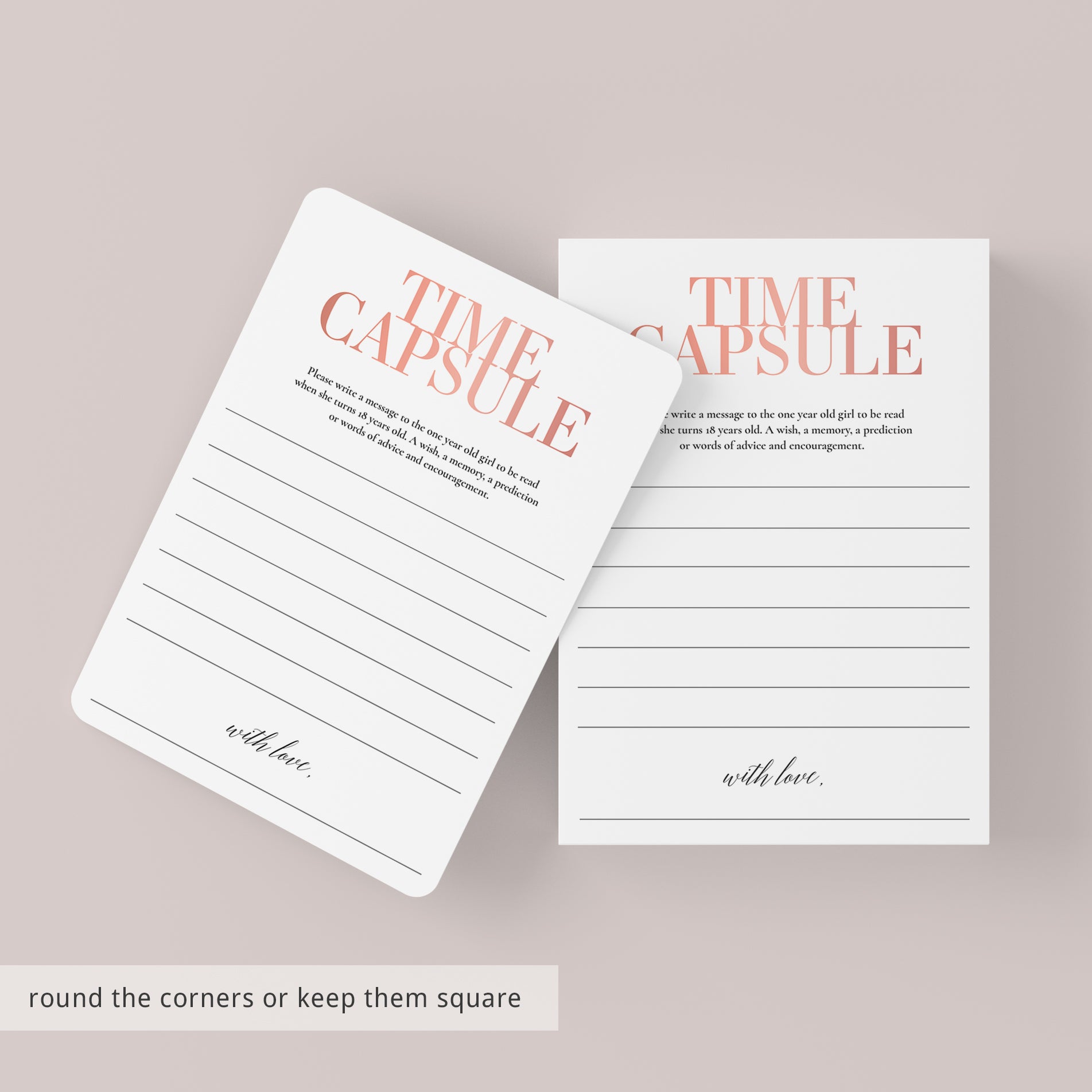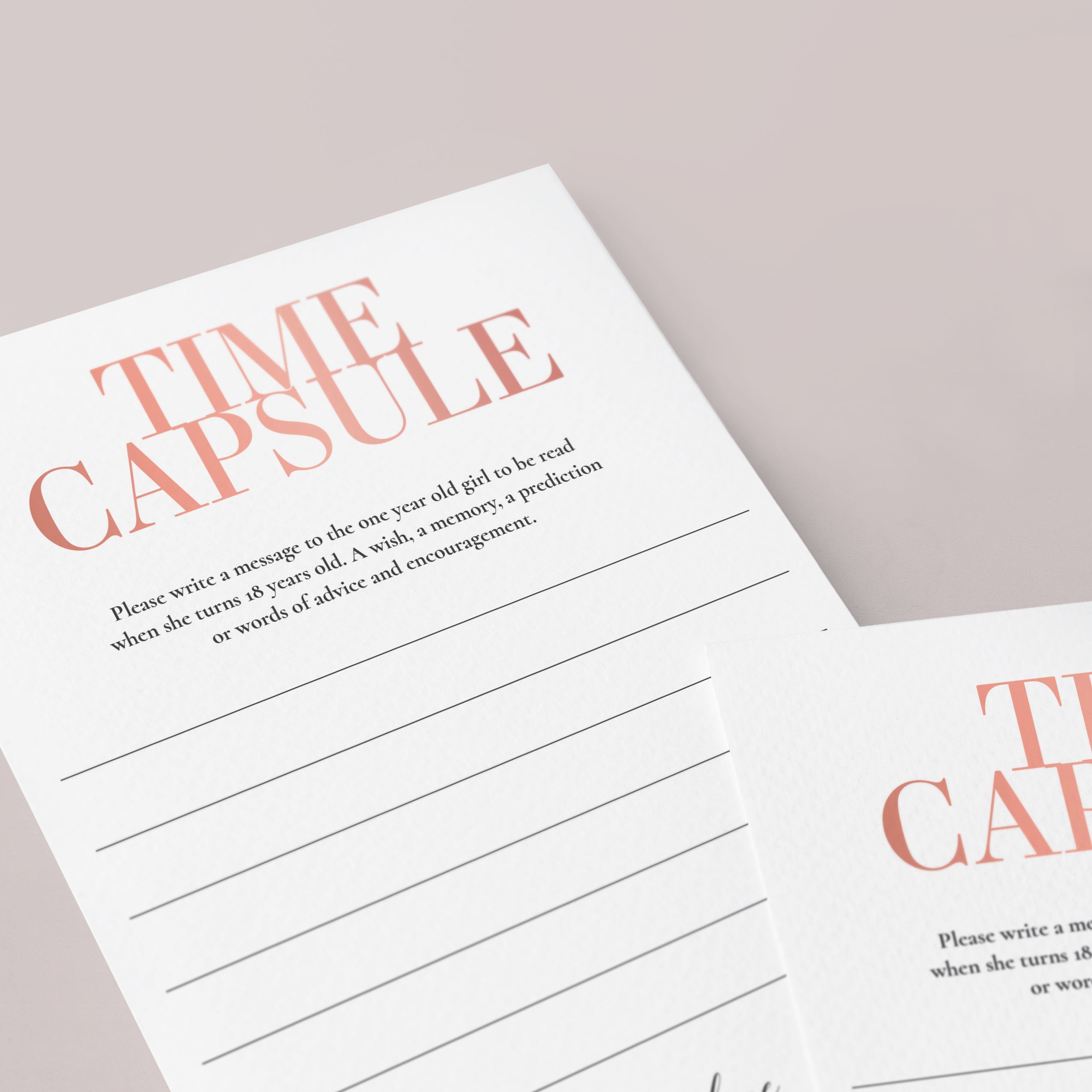 Are you looking for a meaningful keepsake for your baby girls' first birthday party? Have your guests leave a special message for your daughter to open on her 18th birthday. These beautiful blush Time Capsule cards will make a sweet and sentimental first birthday activity that makes a lasting keepsake for your little one.