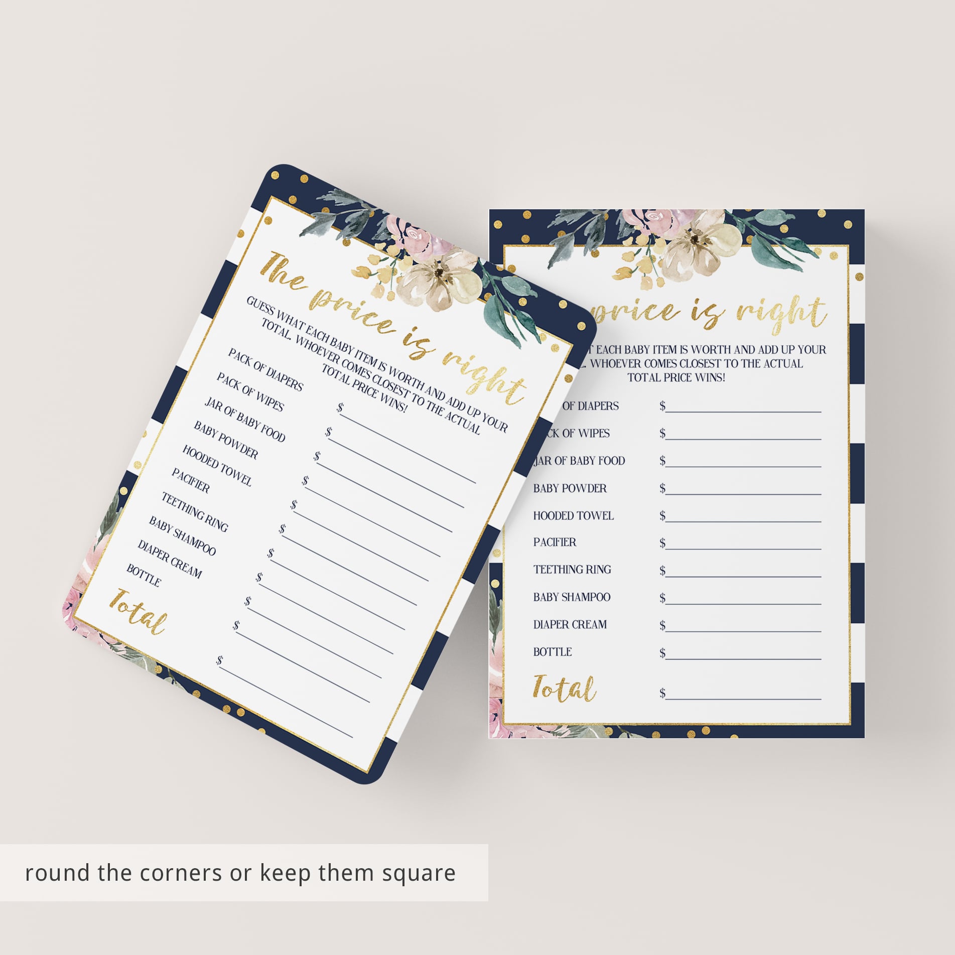Play The Price Is Right with these gorgeous navy, pink and gold baby shower game cards. The beautiful floral cards would be perfect for a gender neutral or girl baby shower and will create an enjoyable moment for all of your guests.