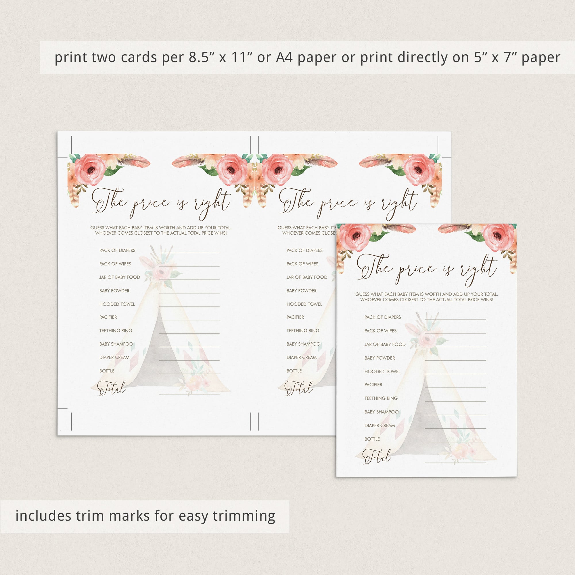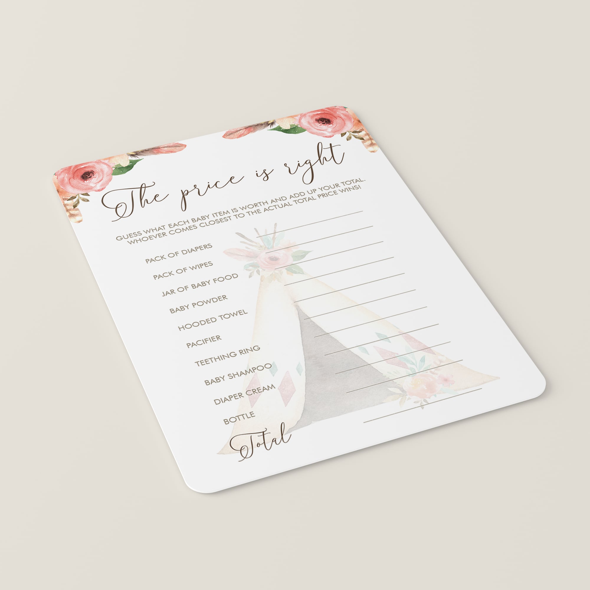 Play "the Price is Right" with this gorgeous tribal baby shower game. The printable cards with watercolor flowers and teepee would be perfect for a girl baby shower and will create an enjoyable moment for all of your guests.