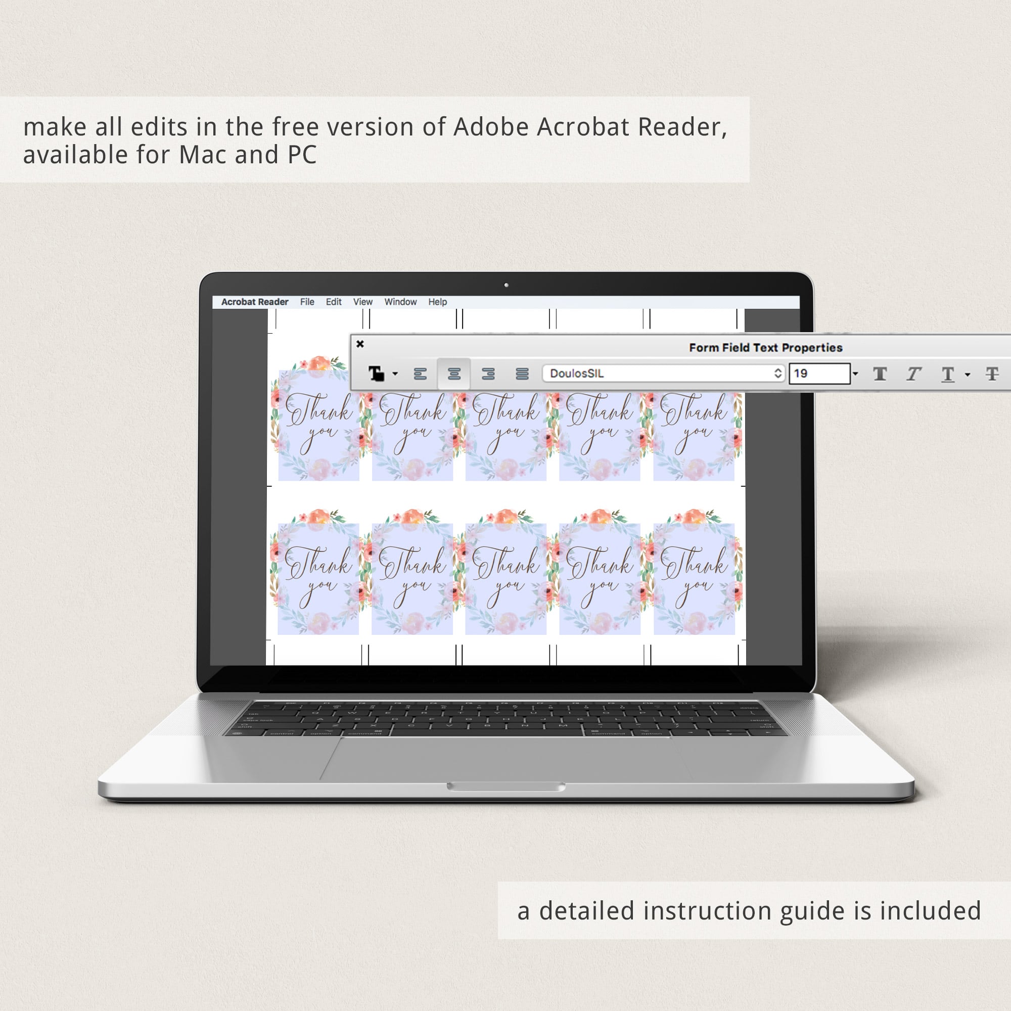 Thank your guests for coming with these gorgeous favor tags with floral wreath. The floral thank you tag is an editable PDF-template. Easily edit the text yourself in the free version of Adobe Acrobat Reader and personalize the favor tag with your own words.
