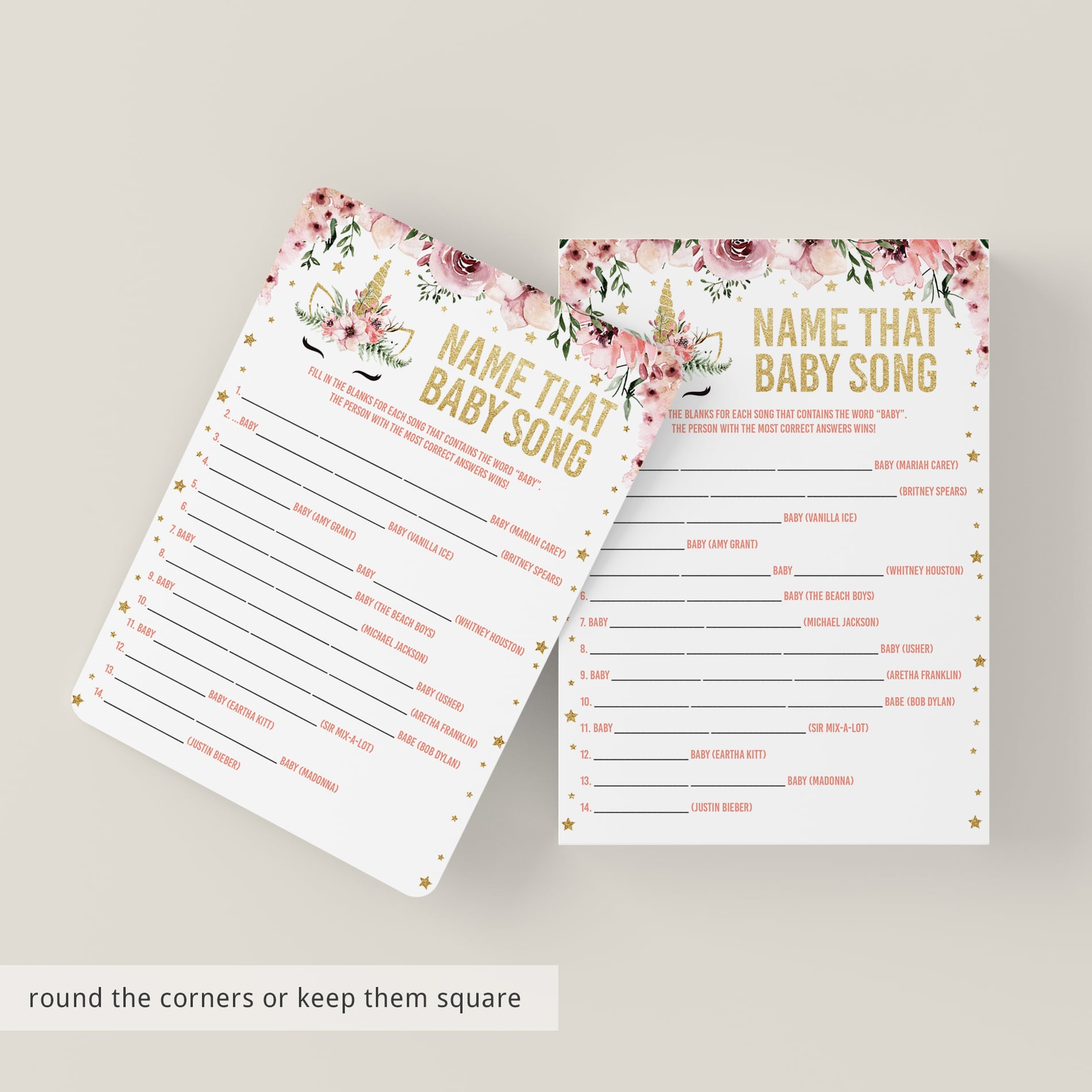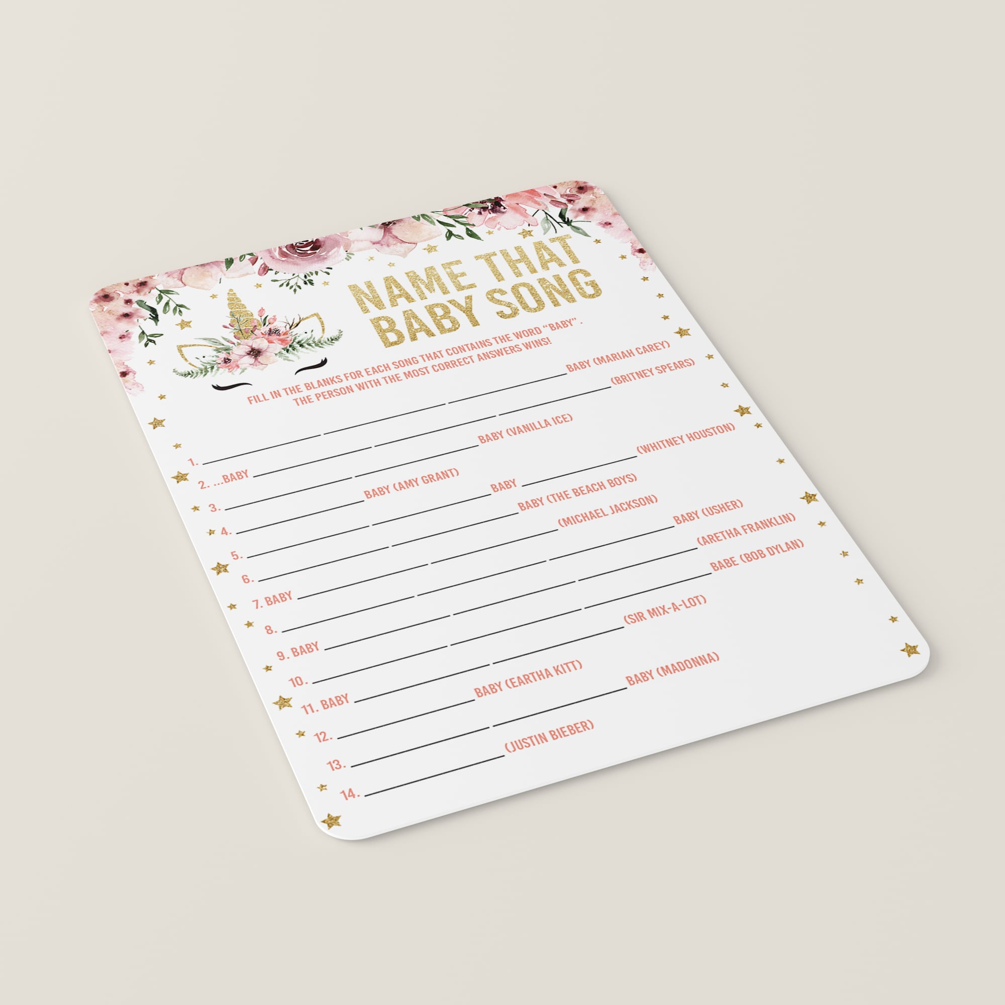 Then let your baby shower guests have fun with this unicorn themed “Name that Baby Song” game.