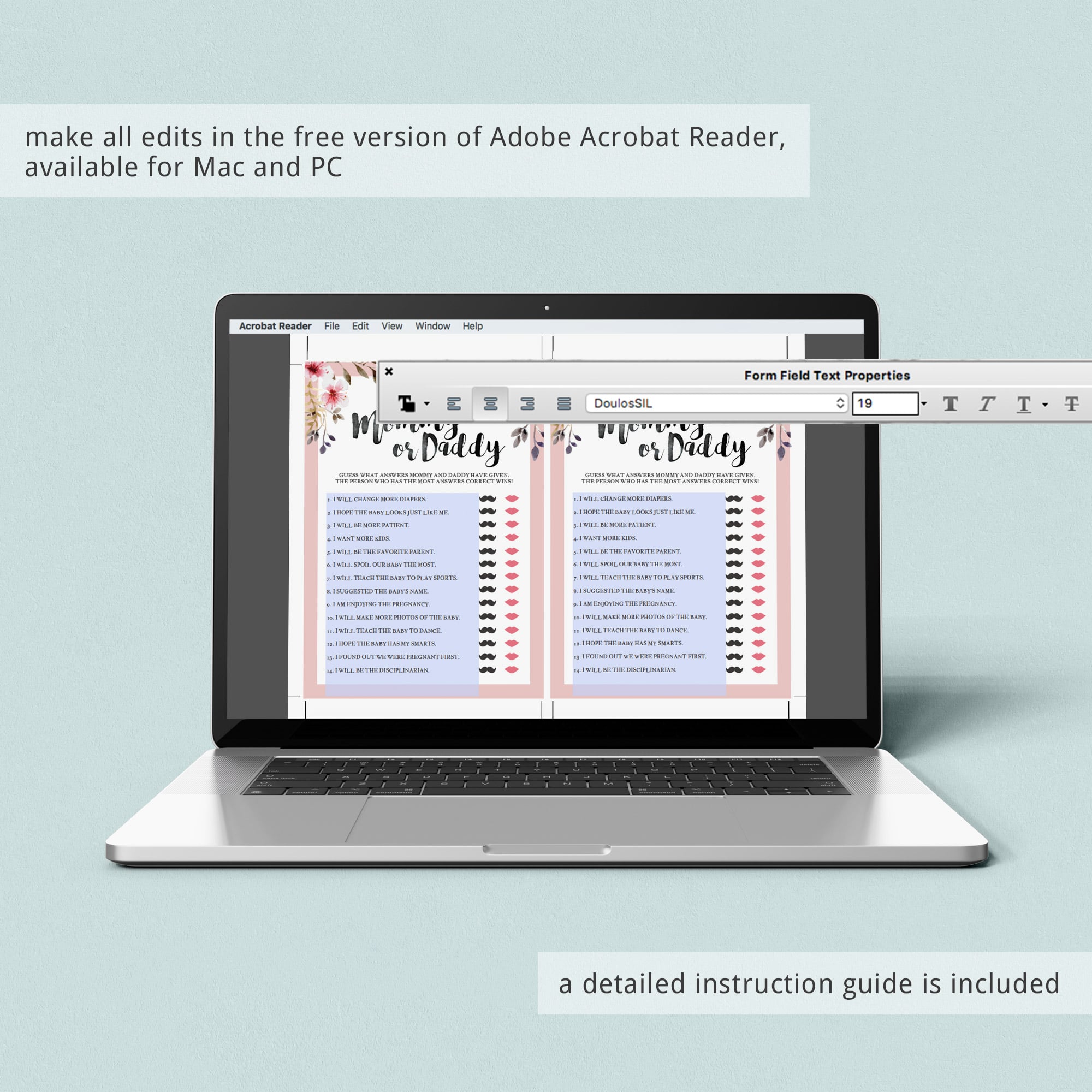 The game Mommy or Daddy is editable in the free version of Adobe Acrobat Reader, so that you can personalize the game (please check the photos to see what parts can be edited).