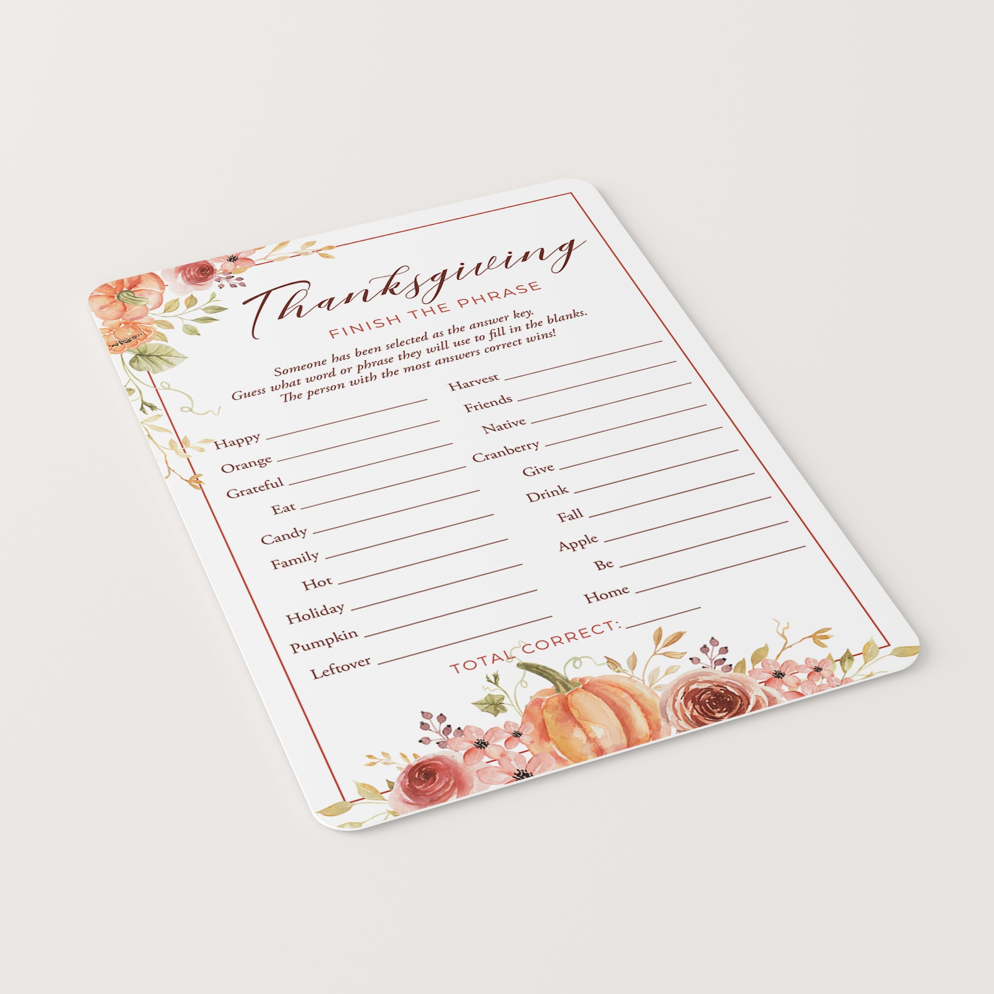 Finish The Phrase is a great ice breaker game for your Thanksgiving party and very easy to play. This gorgeous floral pumpkin Thanksgiving game is the perfect addition to a Friendsgiving dinner party.