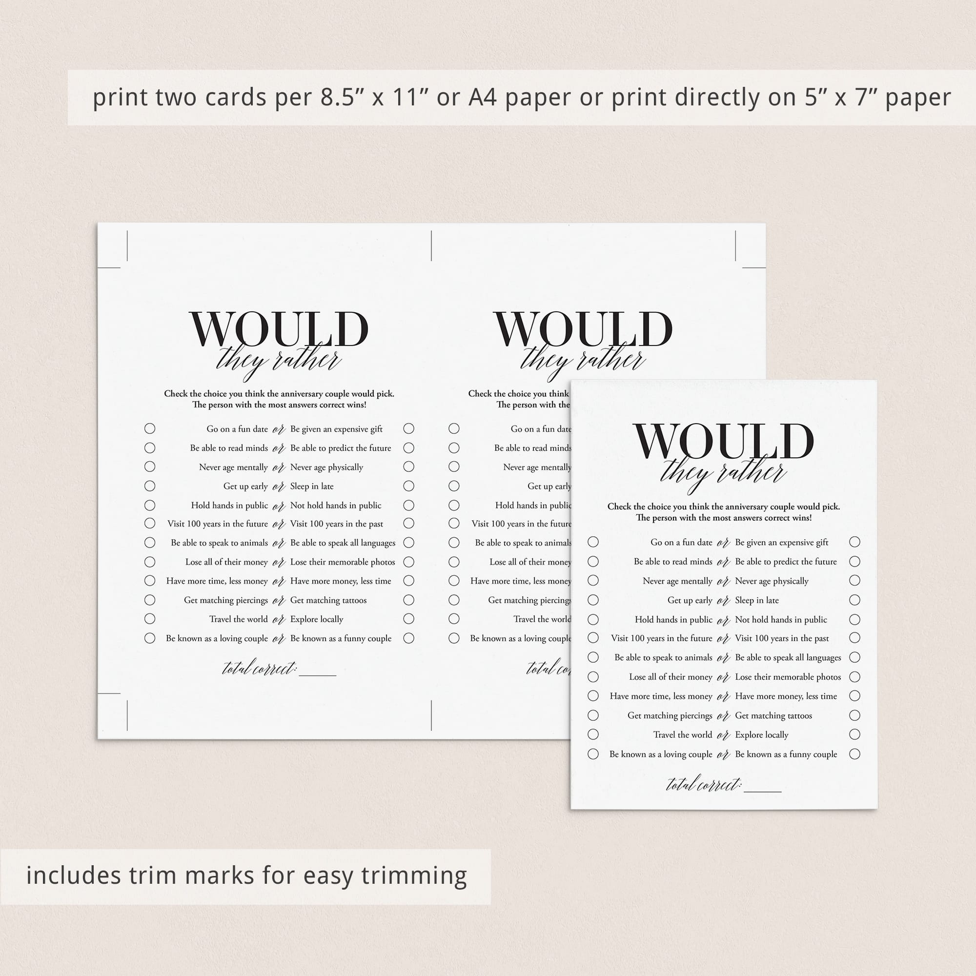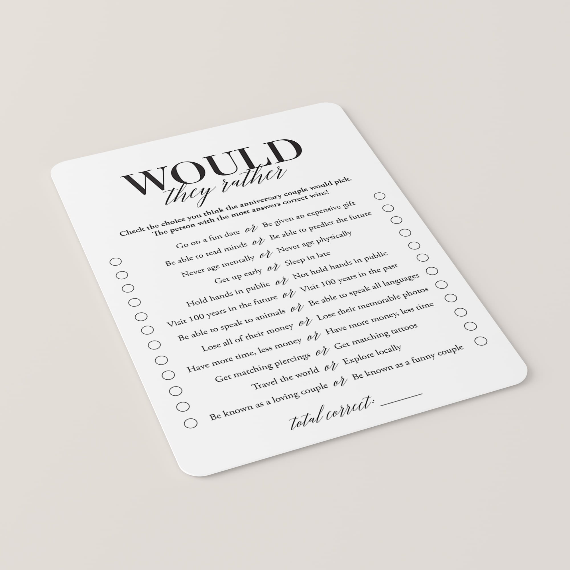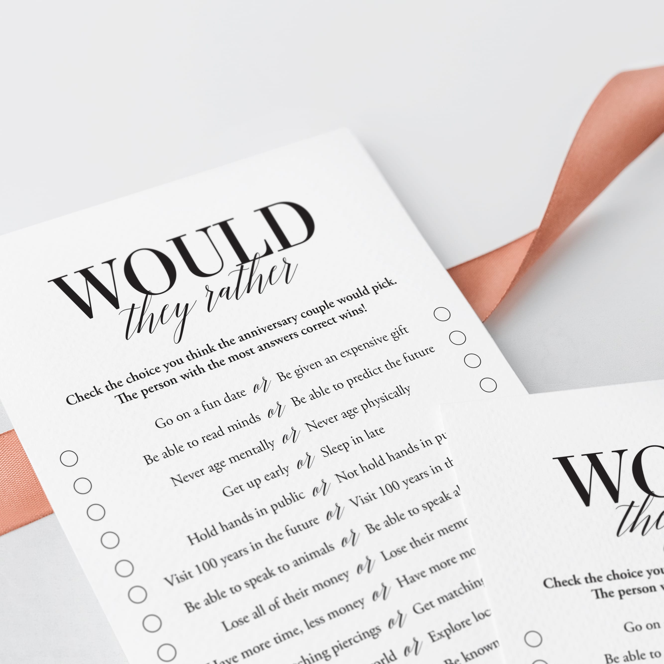 Test your guests how well they know the anniversary couple and play "Would they rather" with this fun anniversary party game. It is a great way to bring disparate people together and to put them all in a party mood. It's the perfect addition to any anniversary party, no matter how many years you are celebrating.