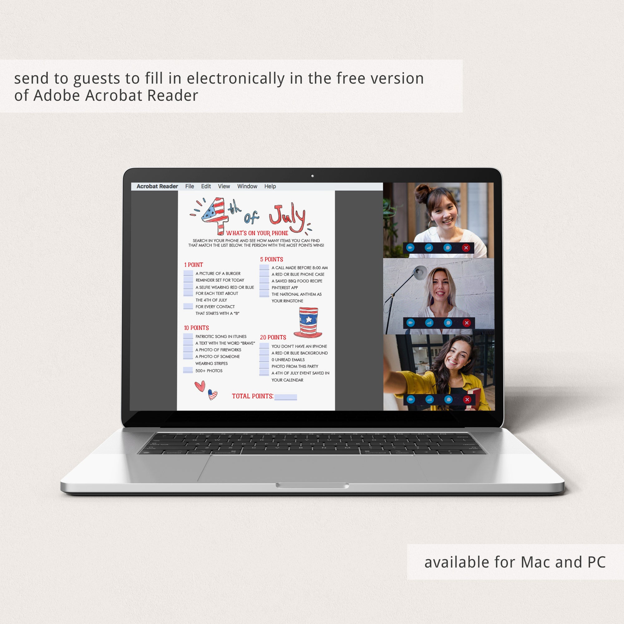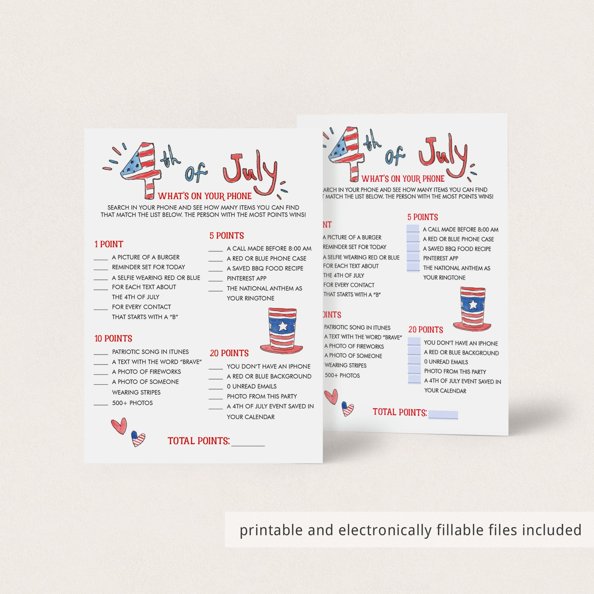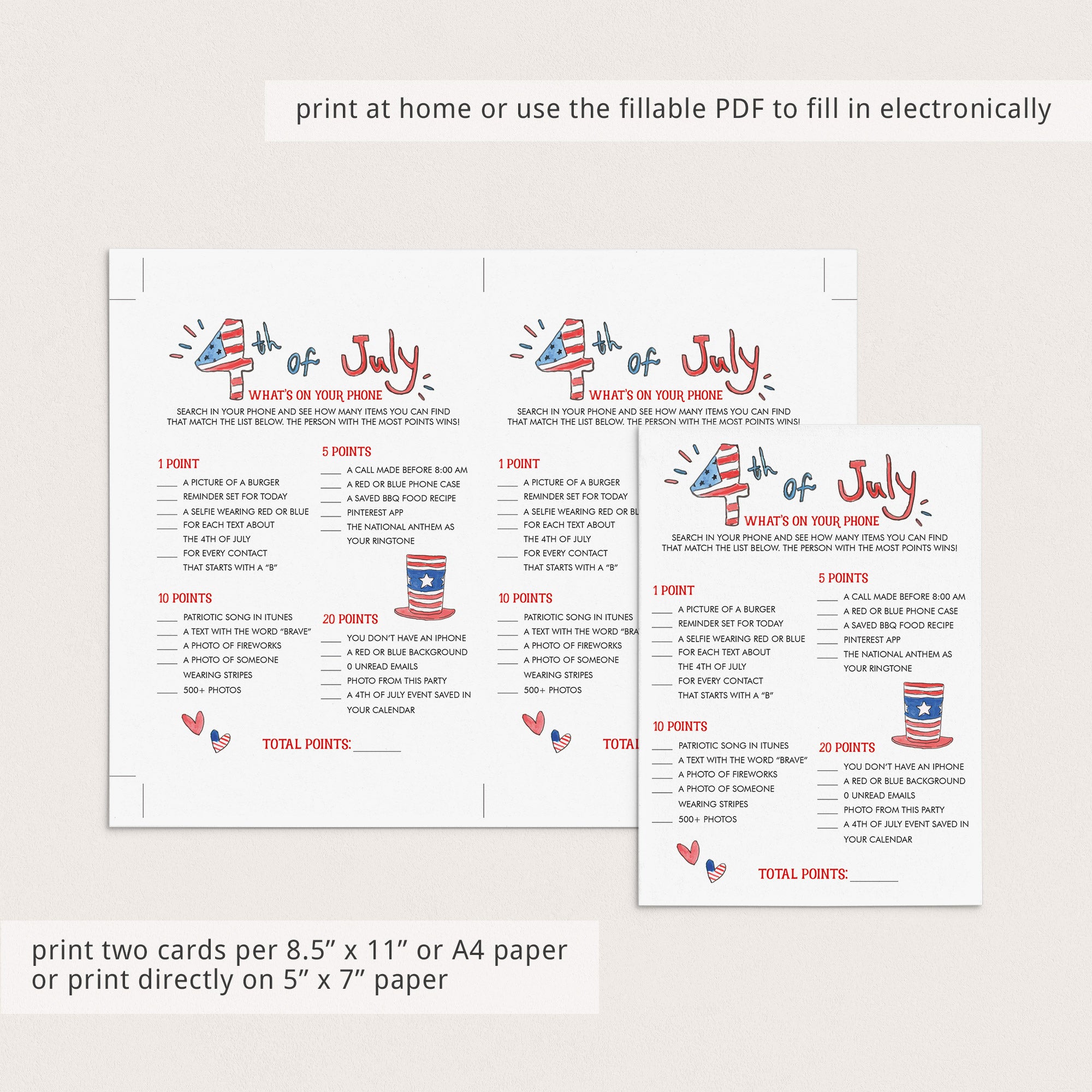 All guests need to play is a smartphone and one of these red, white and blue What's On Your Phone game cards. Printable and electronically fillable PDF templates are included. You can play in-person or on a video conference call app like Zoom or Facebook.