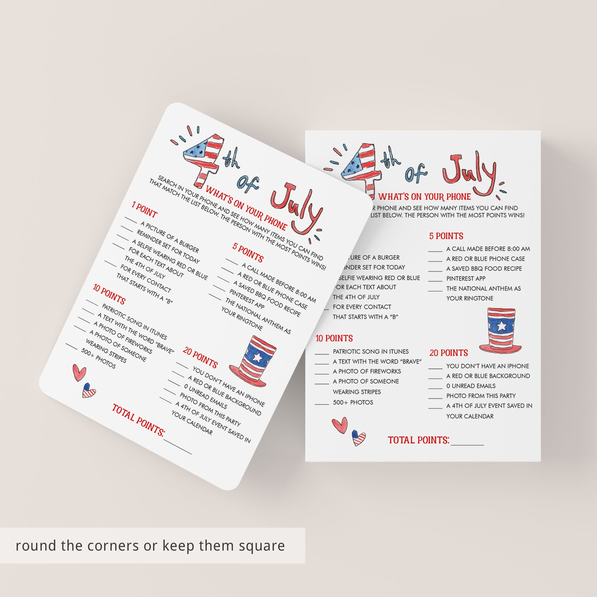 What’s On Your Phone is similar to the What’s In Your Purse game, but instead of searching for the items physically, your friends will just search for the listed items using their phone. They earn points for each item that they have in their phone. Things like having a red or blue phone case, a photo of fireworks, a patriotic song and much, much more. The person with the most points, wins!