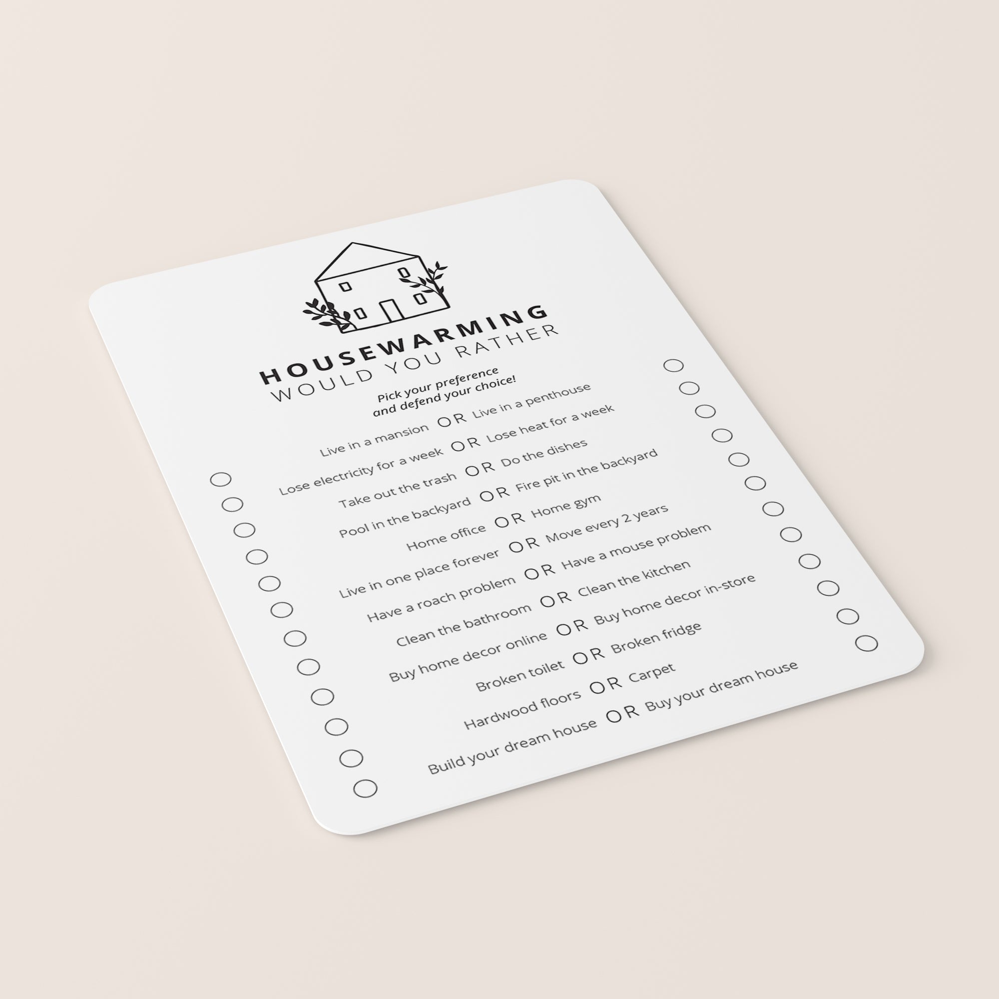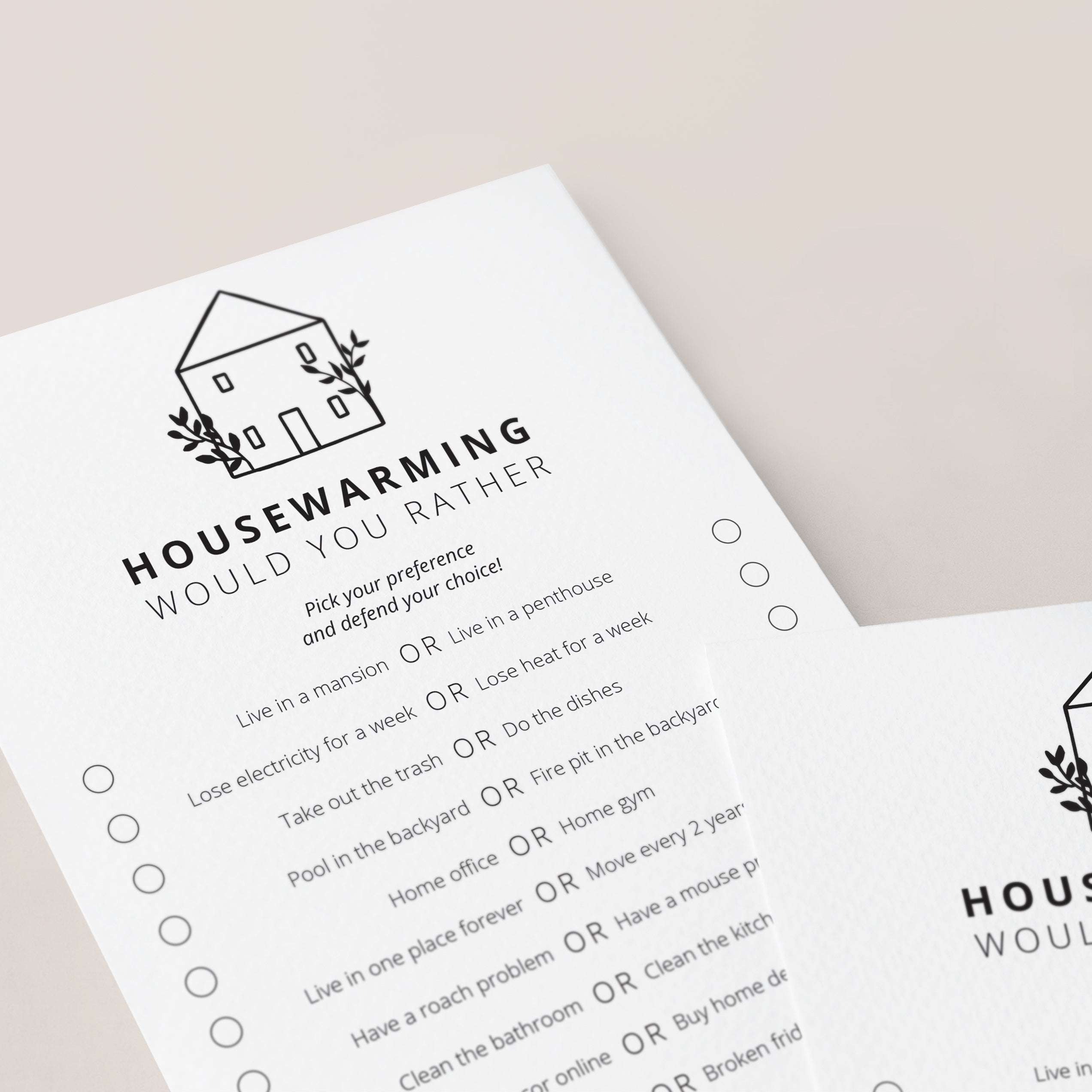 Are you looking for a fun icebreaker game for your housewarming party? Play Would You Rather This or That. It's is a great conversation starter for your party. This modern minimalist game card has 12 This or That questions. Have your guests pick their preferences and defend their choice.