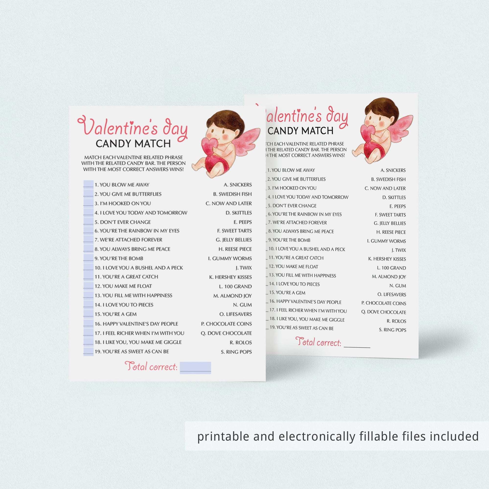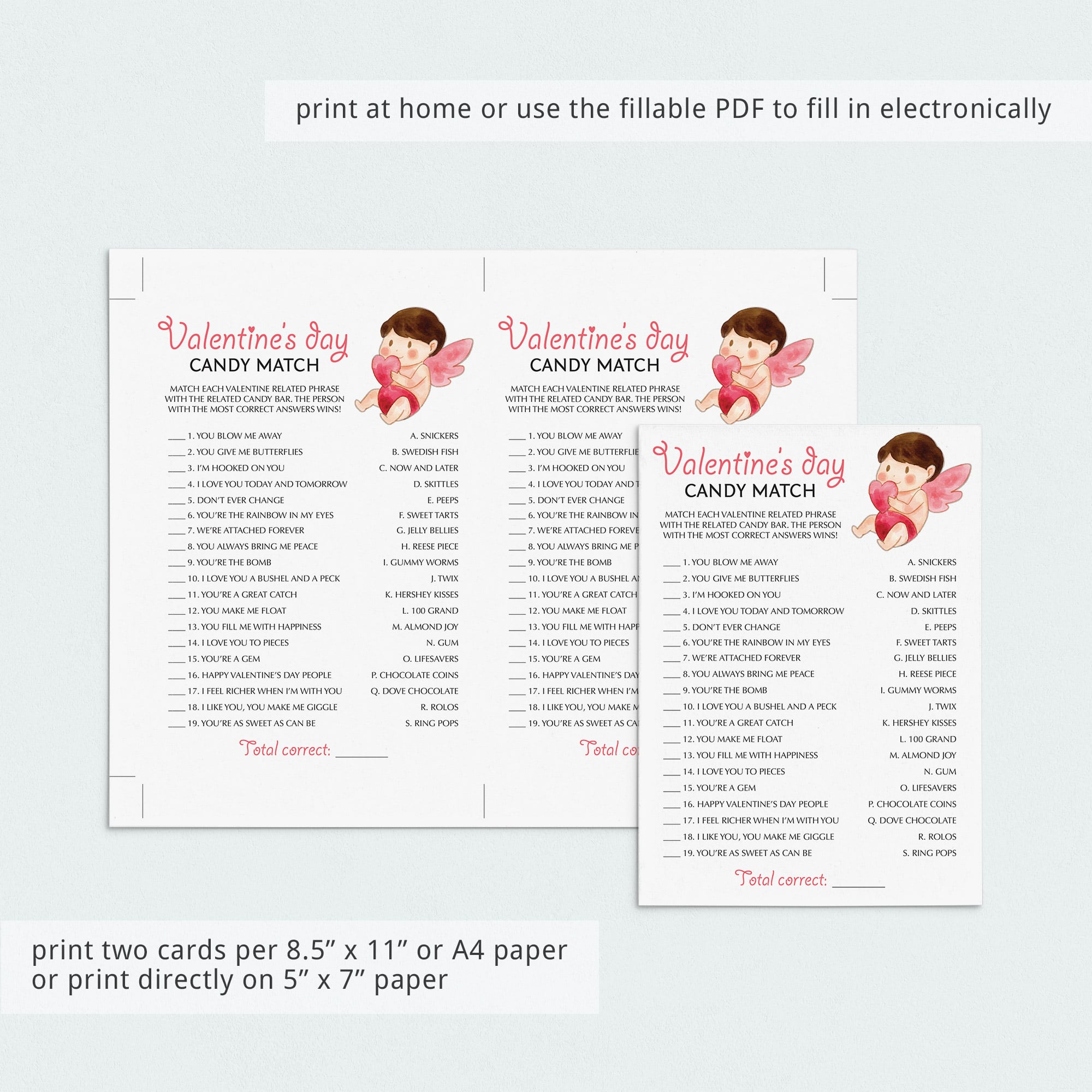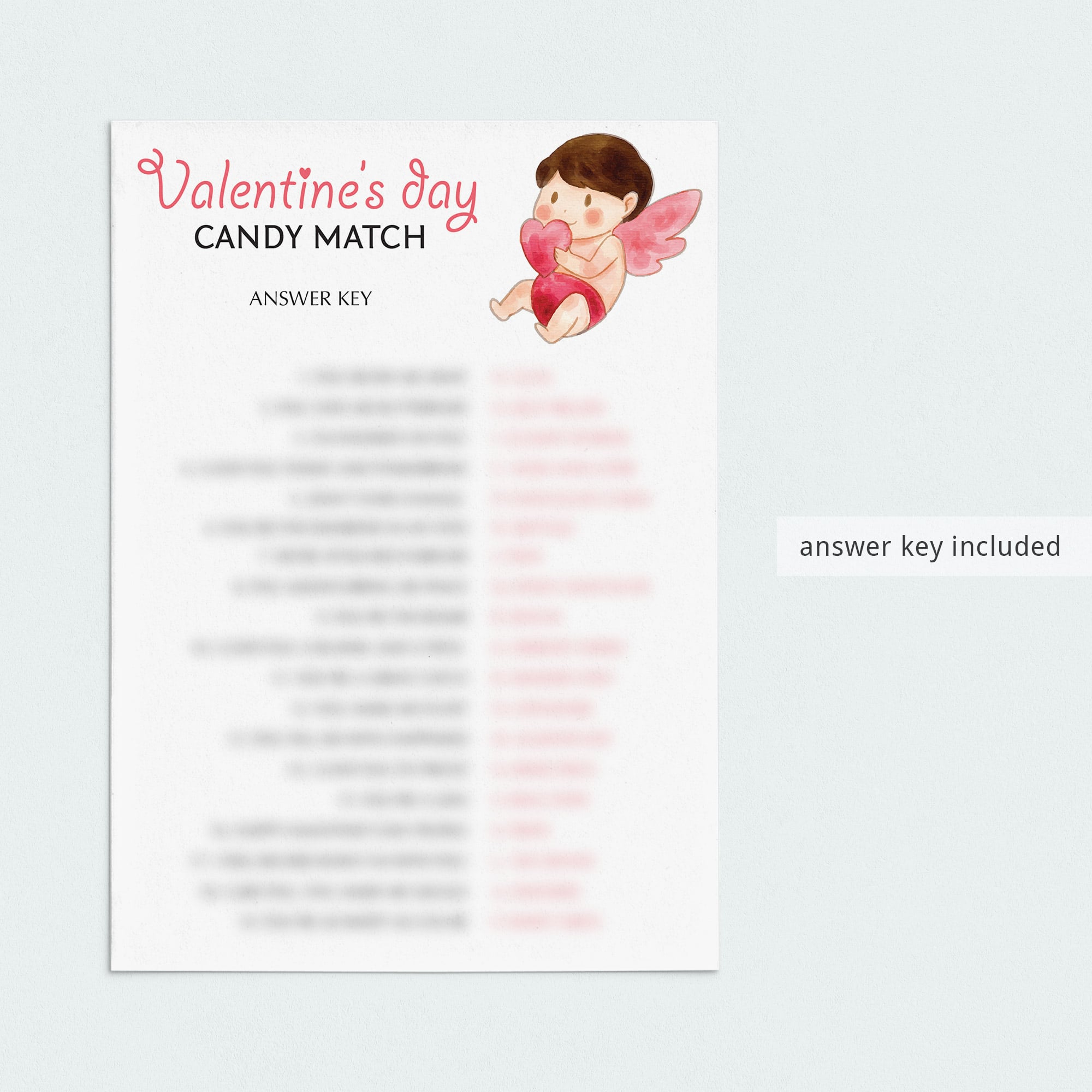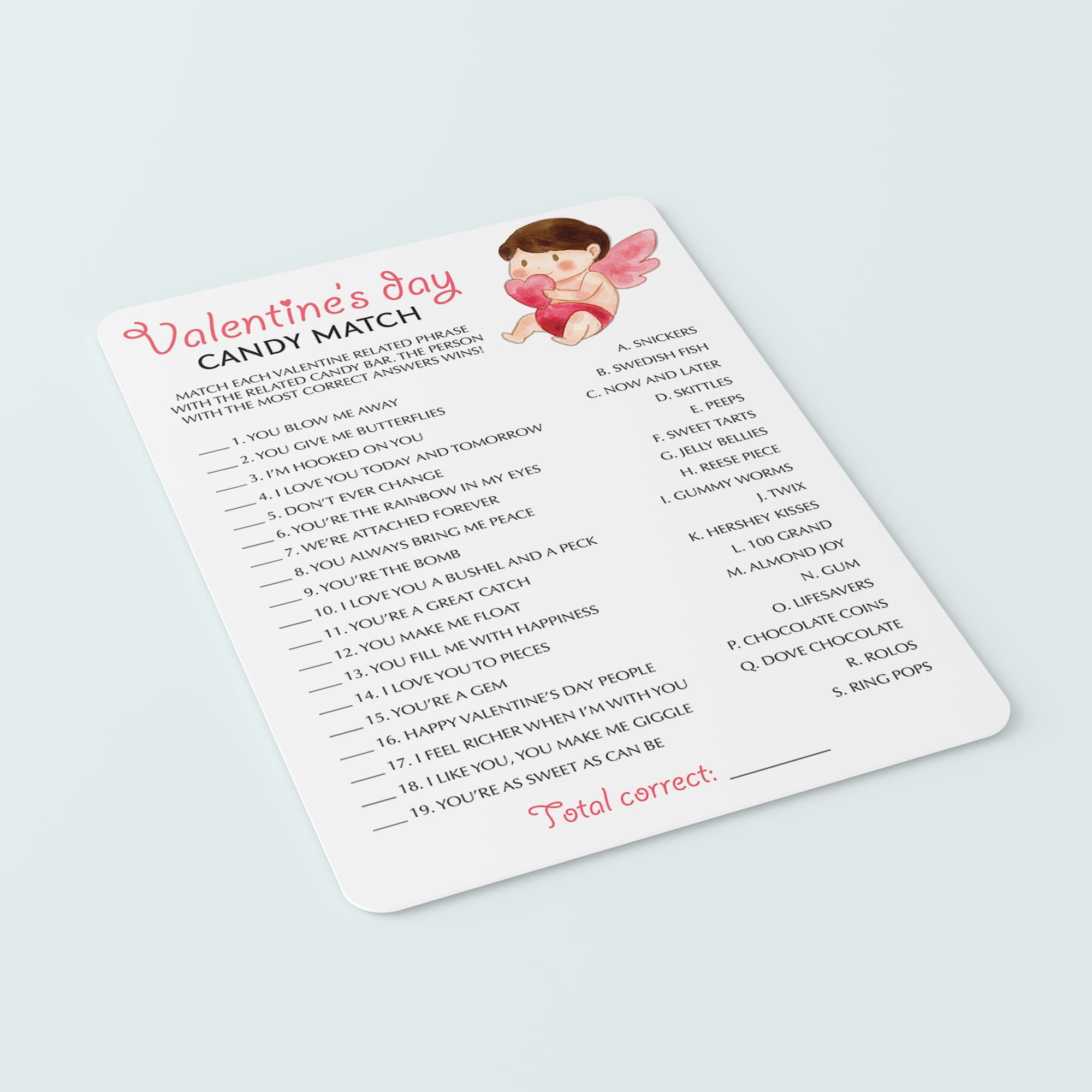 Are you hosting a (virtual) Valentine's Day party? Encourage talking and laughter with some popular Valentine's games. This Valentine's Day Candy Match game with cute cupid is a fun way to entertain your guests and get everyone involved. Guests will have to match popular candy bar names with Valentine's-related things. Printable and electronically fillable files to play on Zoom or Teams are included.