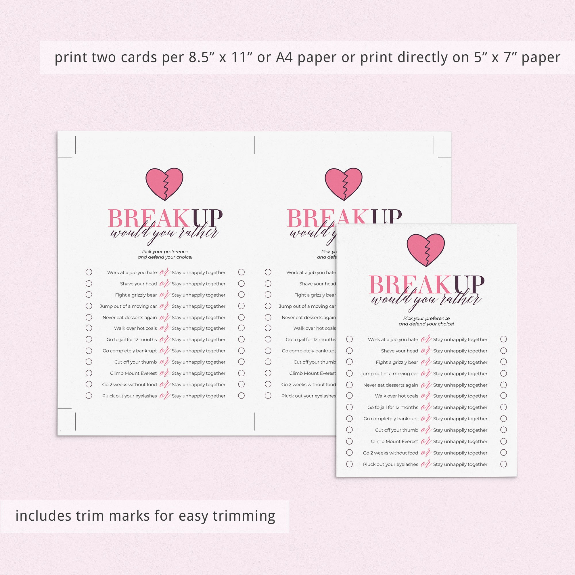This hilarious breakup party game is an instant download. After purchase you will receive a download link immediately on screen. Also within minutes of your order and payment, an e-mail will be sent to you with a link for your download.