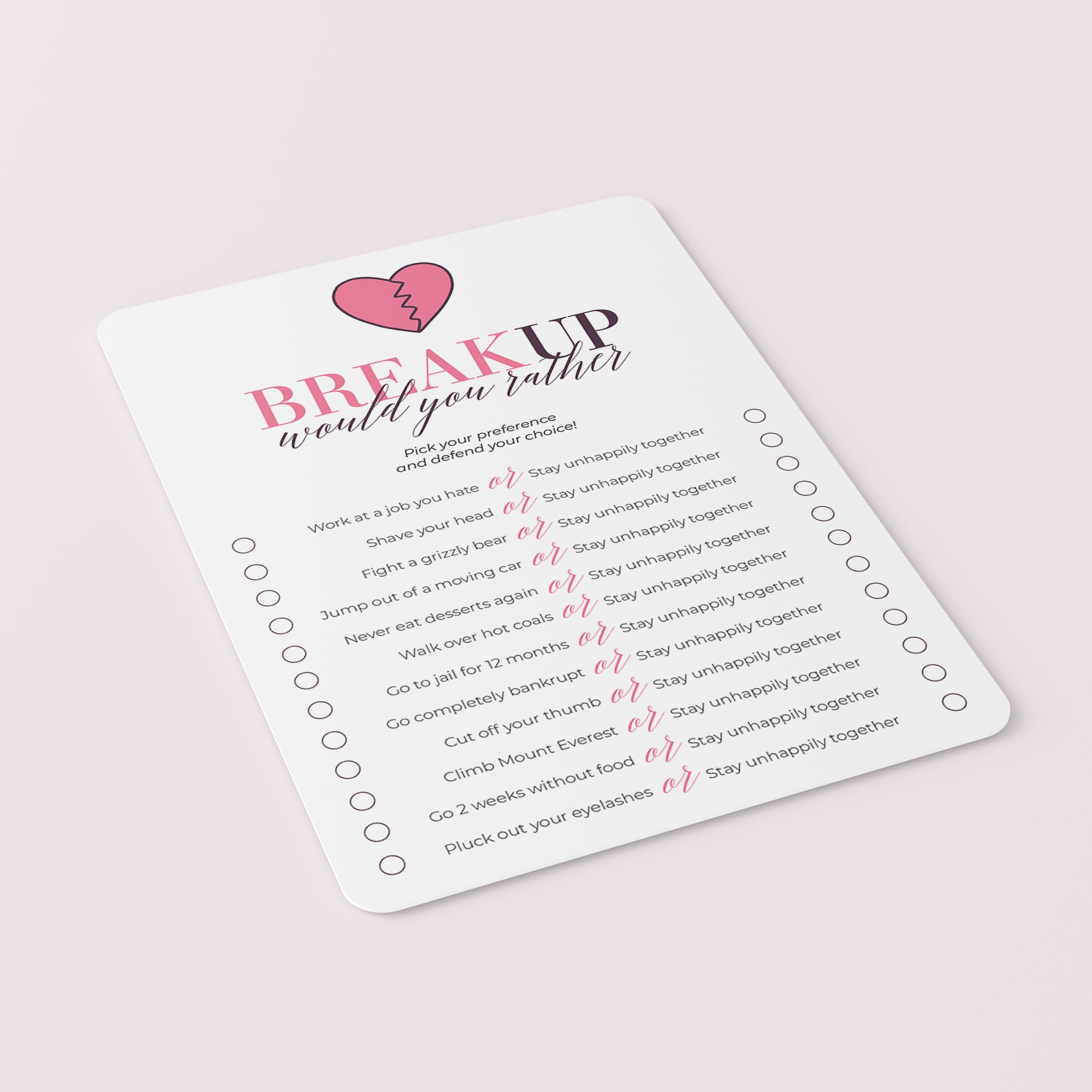 Are you looking for a funny icebreaker game for your breakup party? Play Would You Rather. It's is a great conversation starter for your breakup party. Would you rather pluck out your eyelashes or stay in an unhealthy relationship?