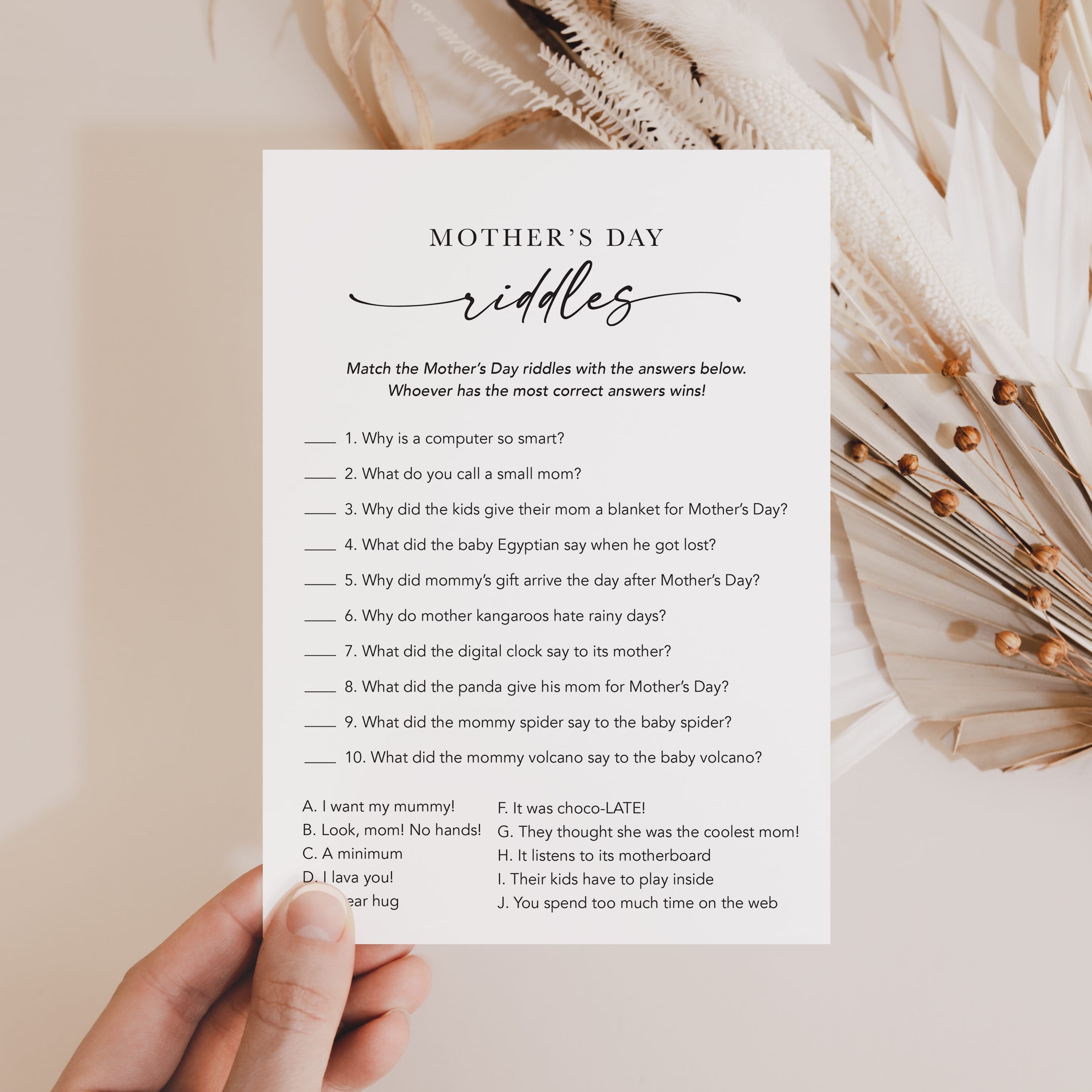Do you think you have what it takes to solve these 10 funny Mother's Day jokes and riddles? This elegant Mother's Day Riddle Me This card is the perfect addition to your Mother's Day Celebration. It's a great activity for the whole family, kids and adults of all ages will love it.