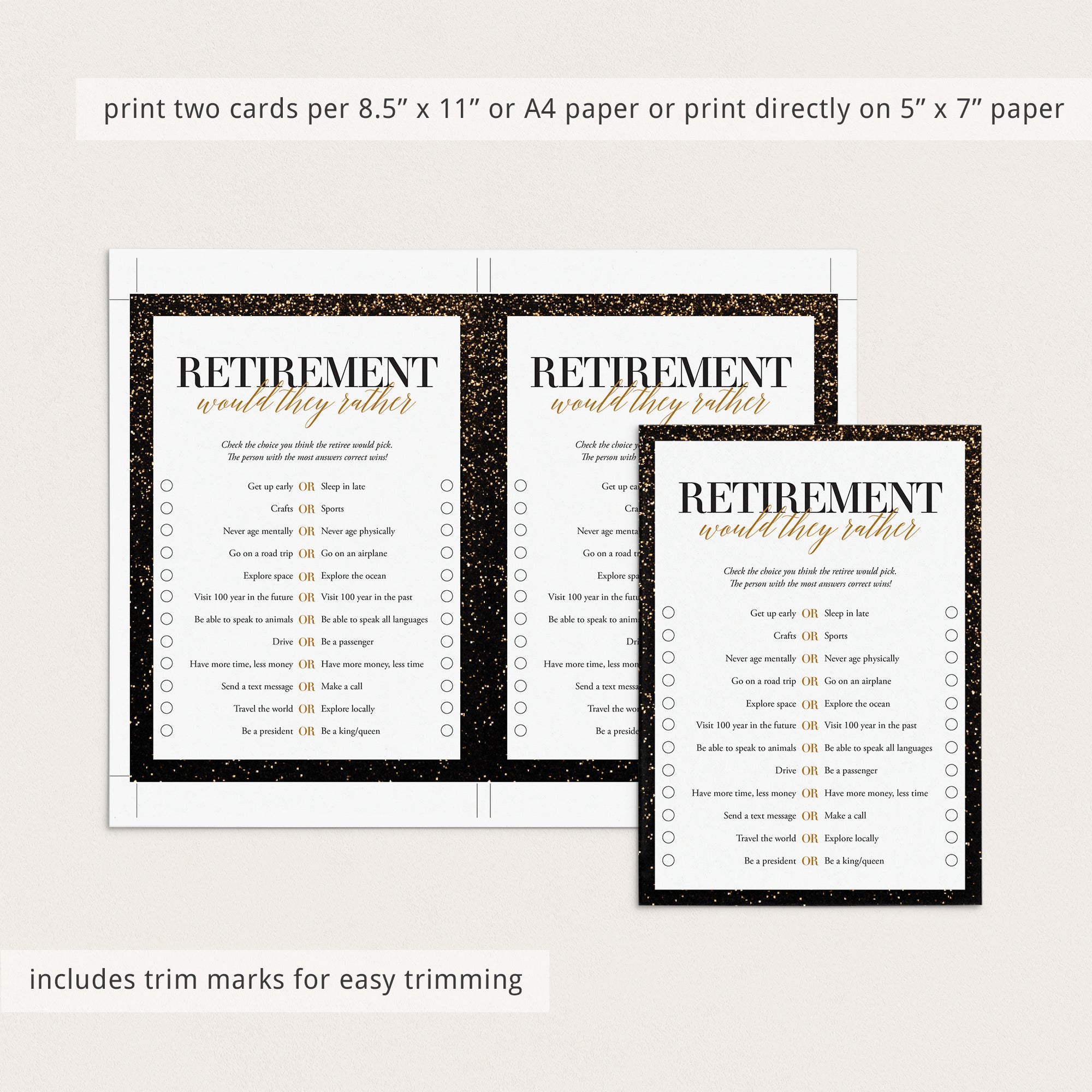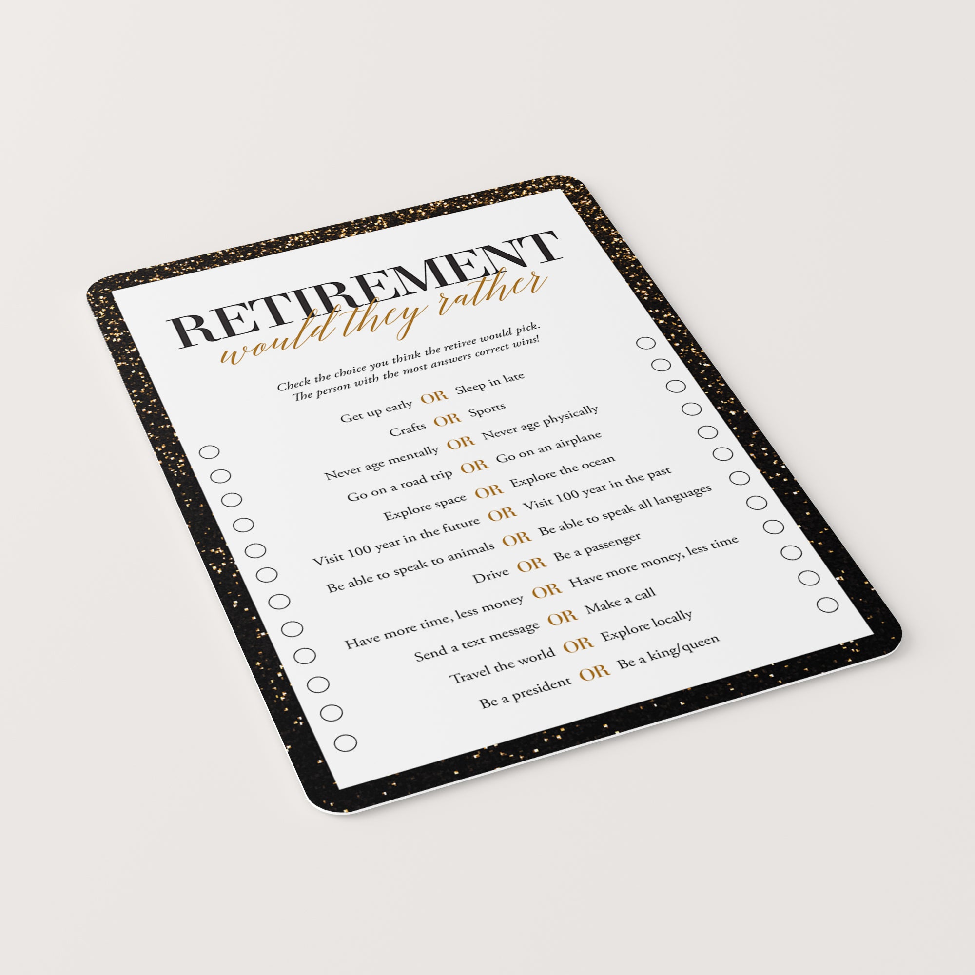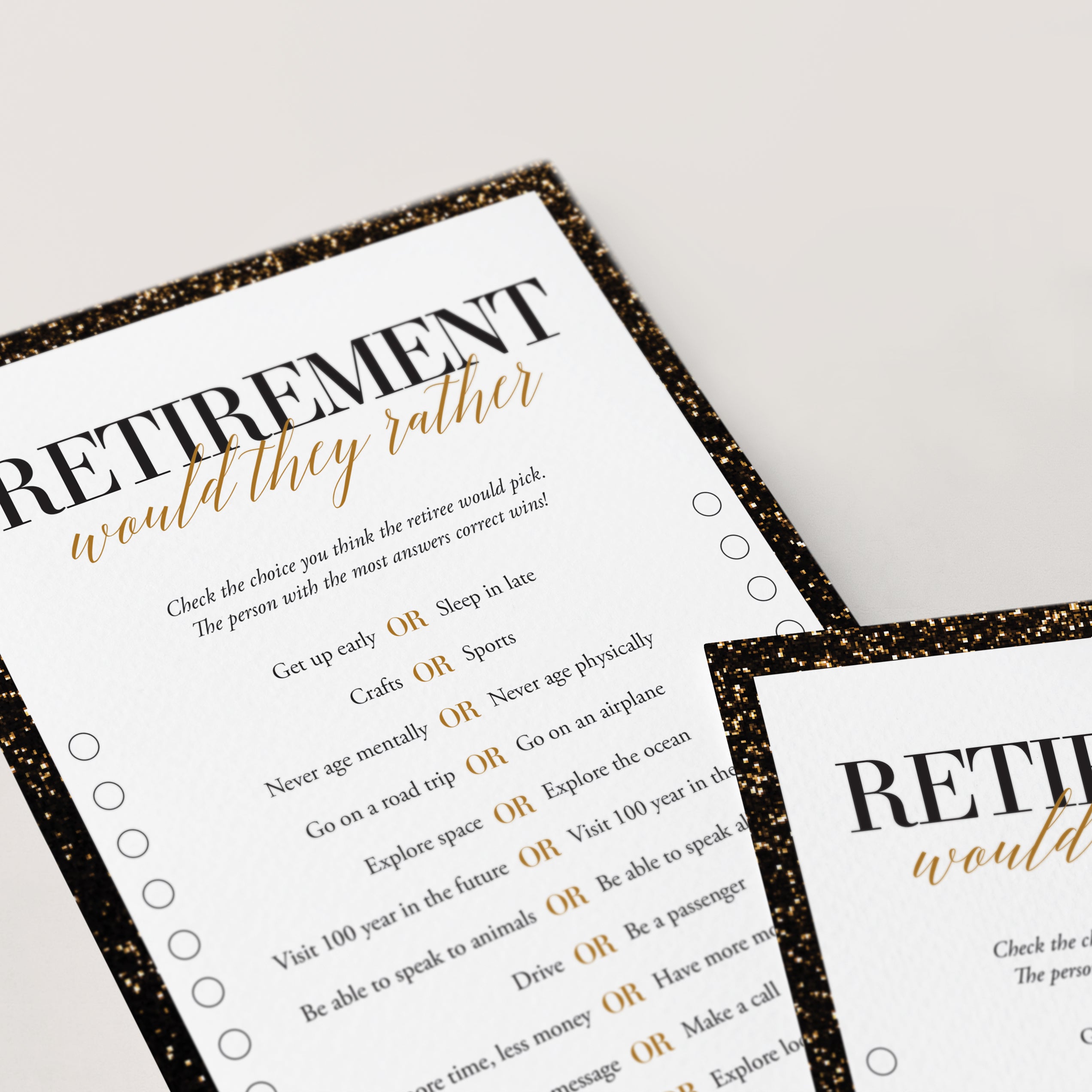 Are you looking for a funny game to get people talking and in the party mood for your retirement party? Play Retirement Would They Rather! After all, your guests have one thing in common: you know the retiree. This gorgeous black and gold glitter Would They Rather game is the perfect addition to any retirement party.
