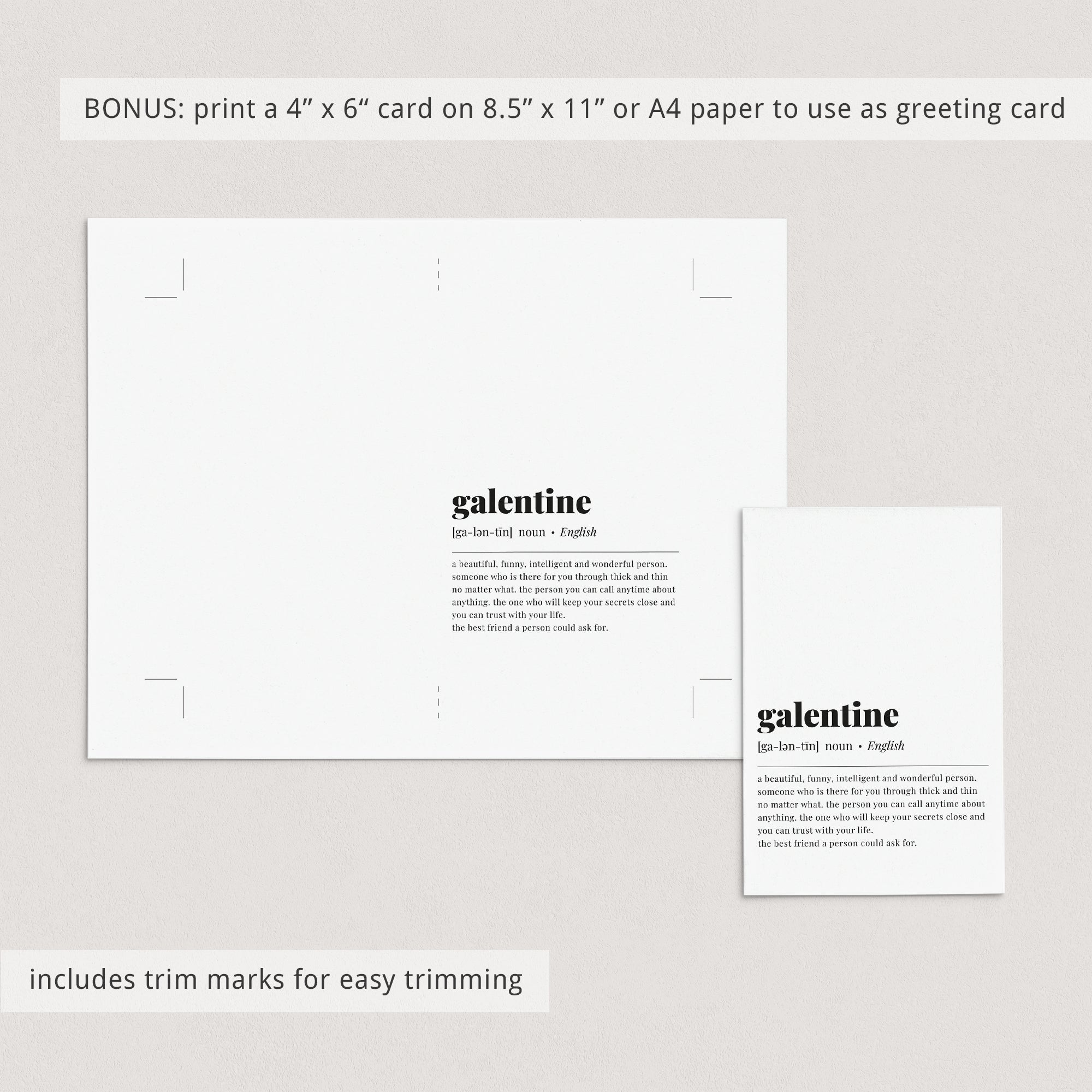This dictionary-style meaning of the word 'galentine' print is an instant download. After purchase you will receive a download link immediately on screen. Also within minutes of your order and payment, an e-mail will be sent to you with a link for your download.