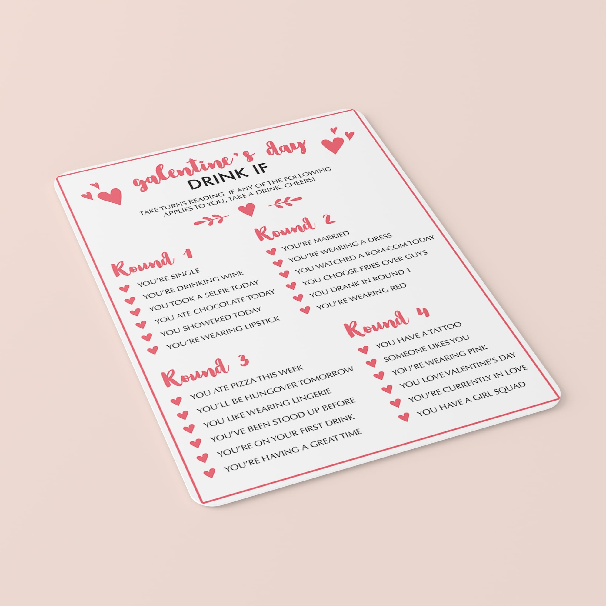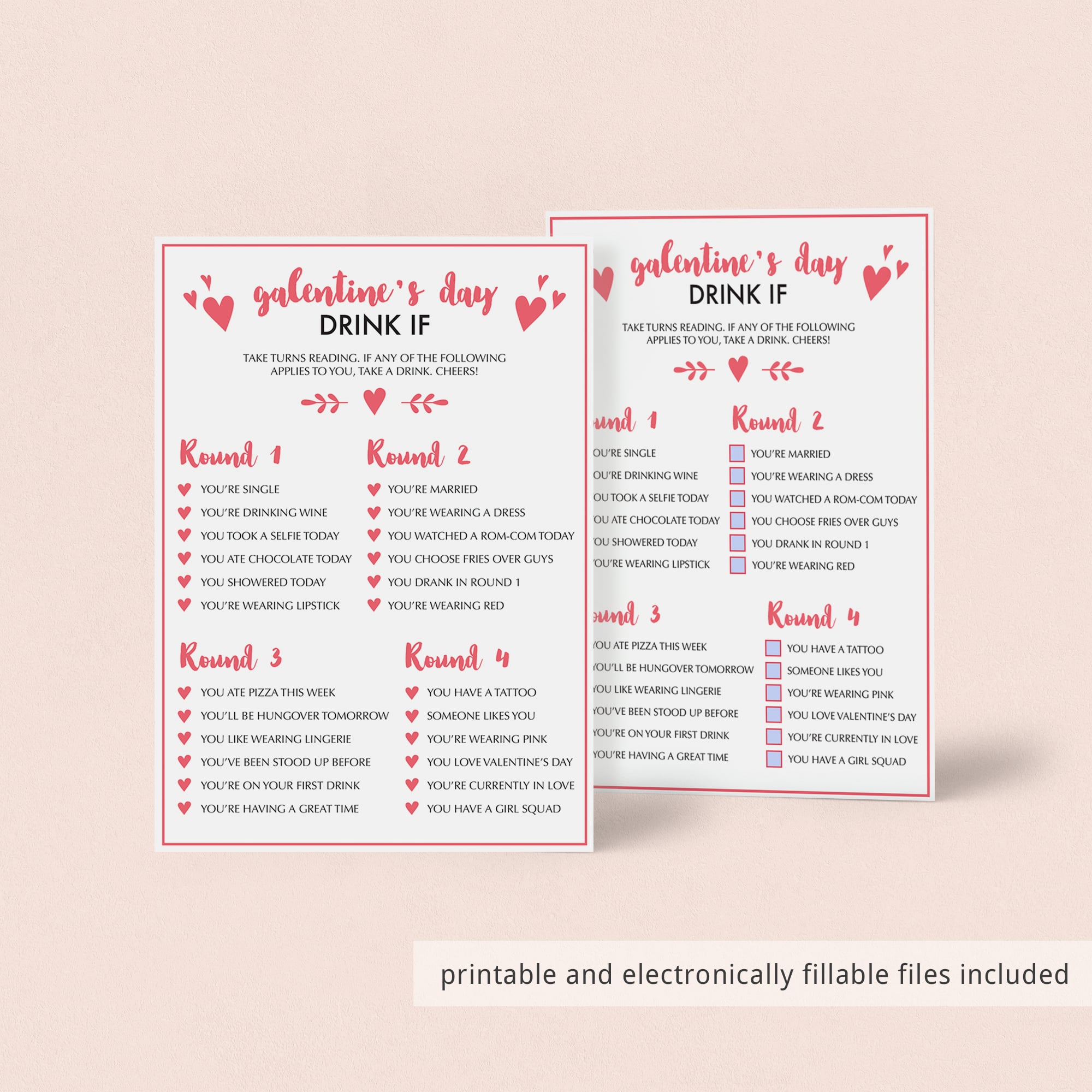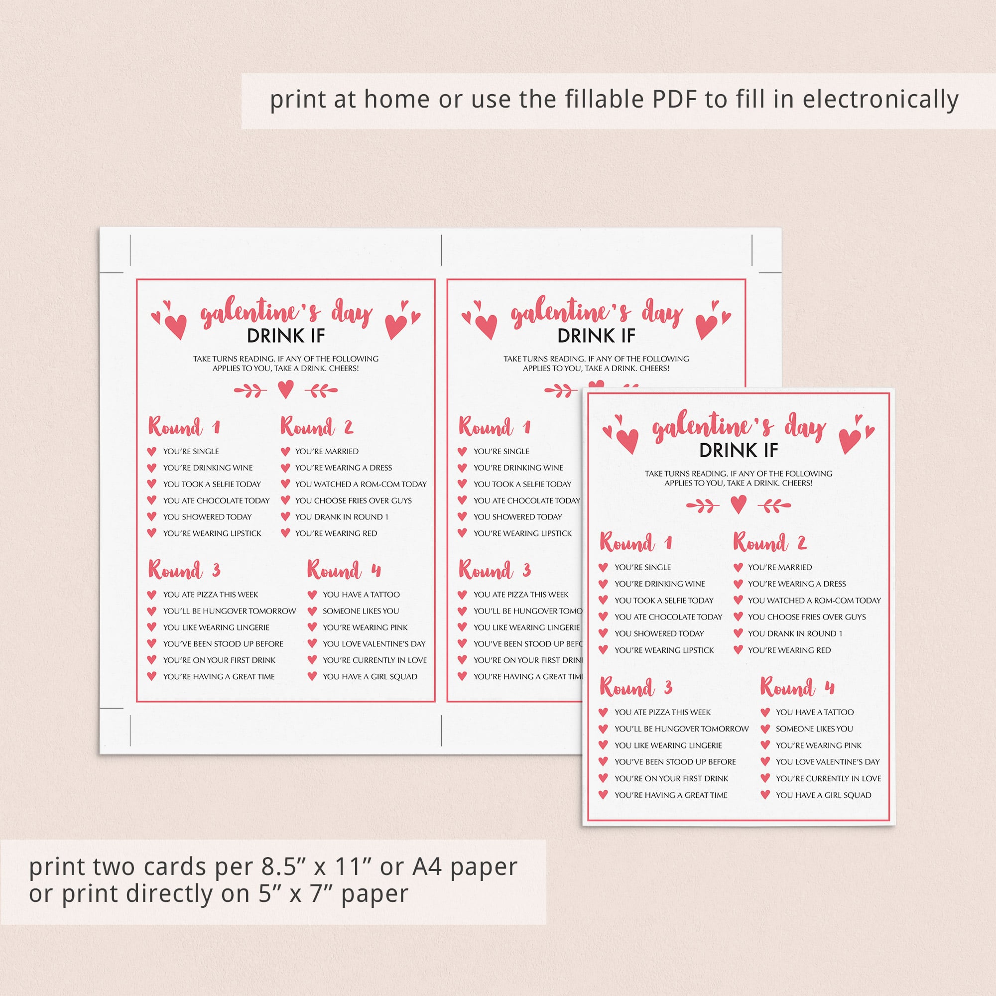 For an in-person Galentine's Day party, download and print the drinking game cards as many times as you need. We recommend printing on a nice heavy card stock for highest quality feel. Print right from your computer in a matter of minutes or have the cards printed at your favorite print shop.