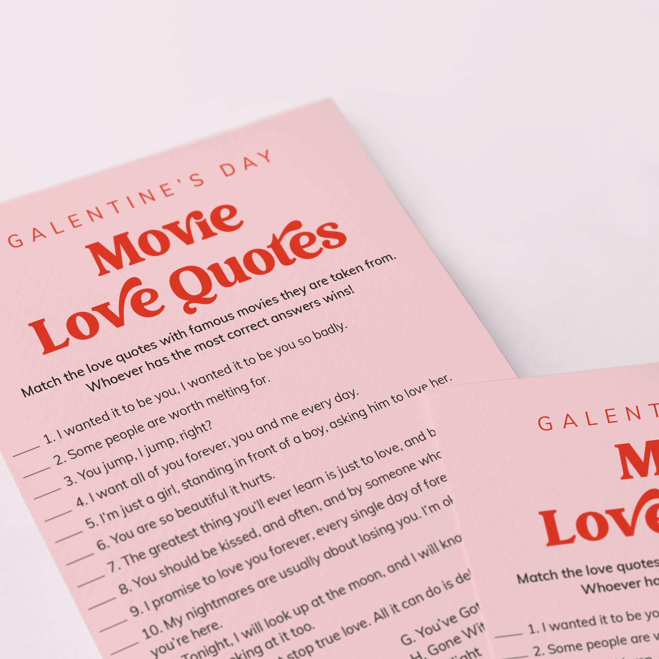 You think you know your romantic movies? This fun Galentine's Day Movie Love Quotes game will put you to the test. It's the perfect game for romantic movie fans and will sure get everyone at your party interacting, laughing and enjoying the thrill of competition.
