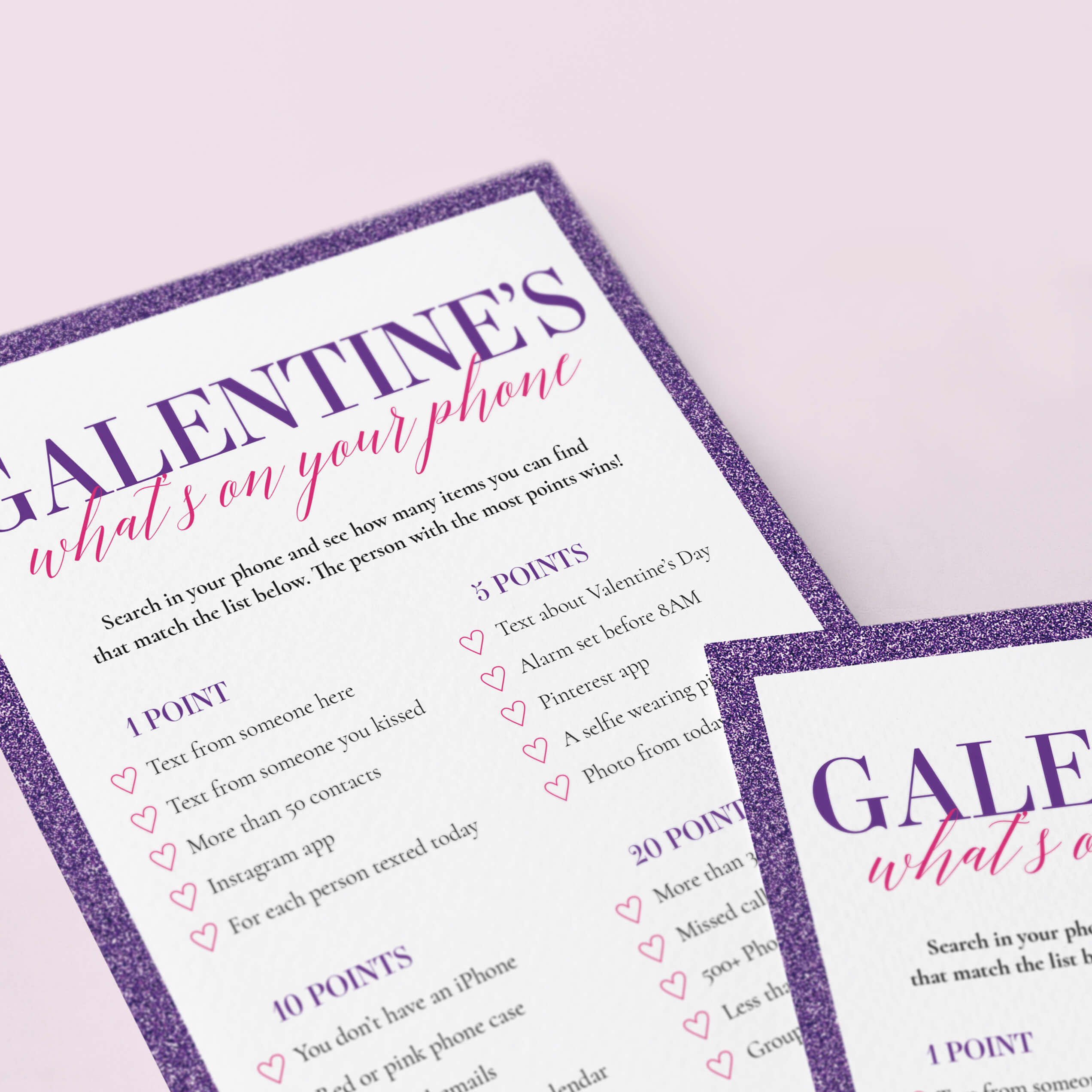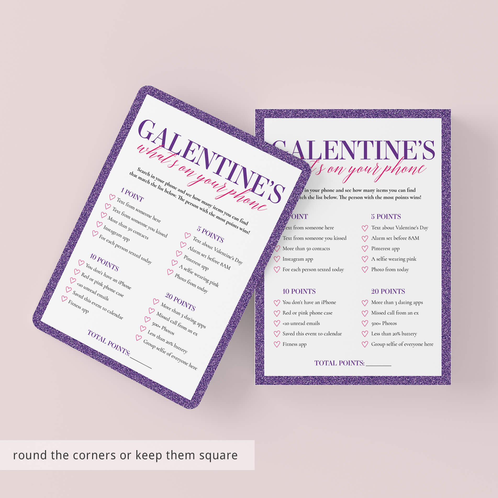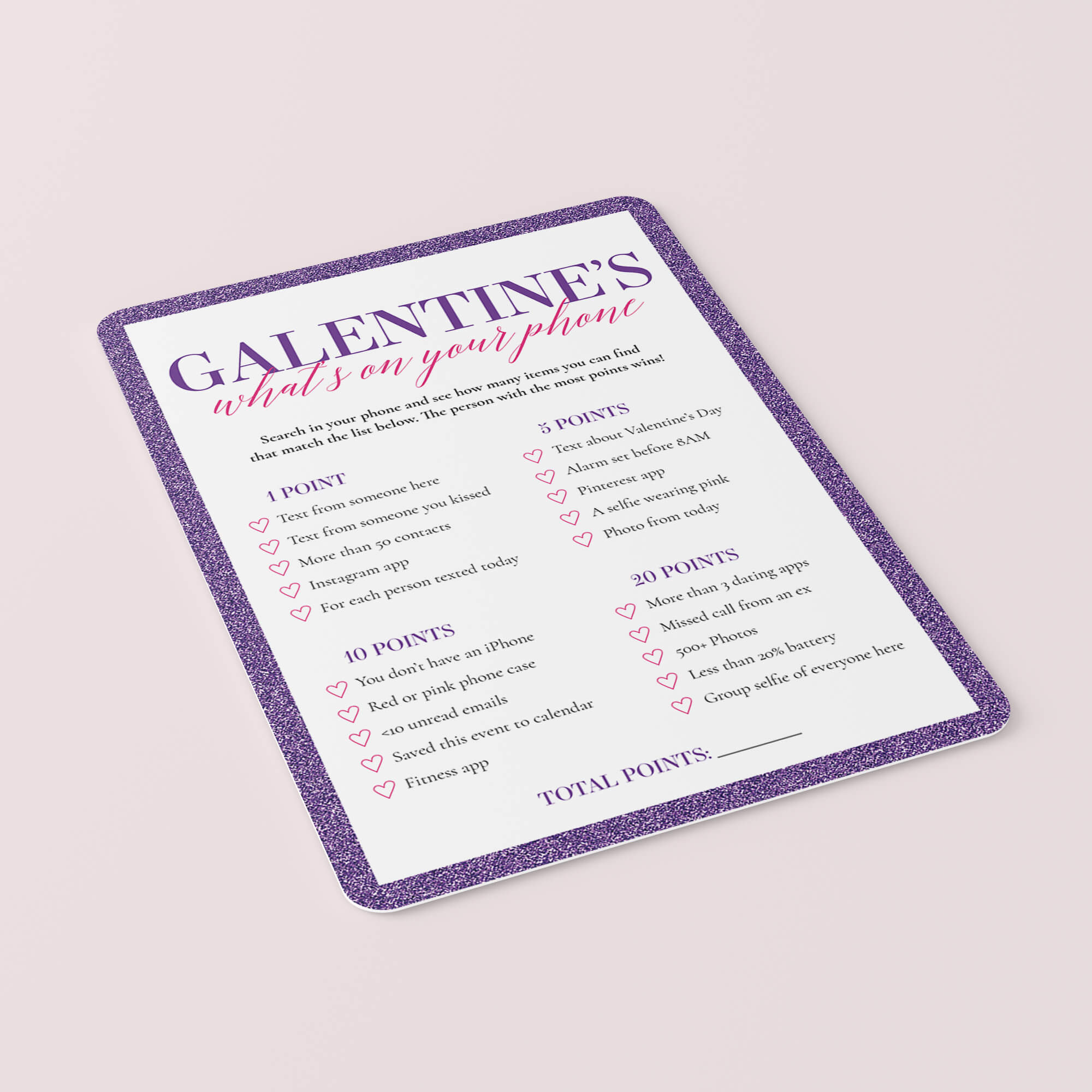 All guests need to play is a smartphone and one of these purple glittery What's On Your Phone game cards.