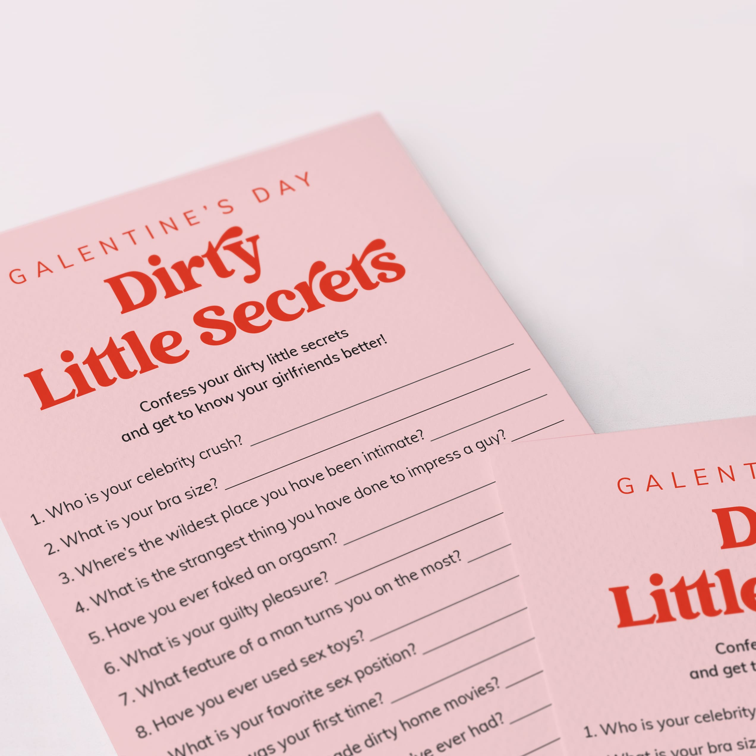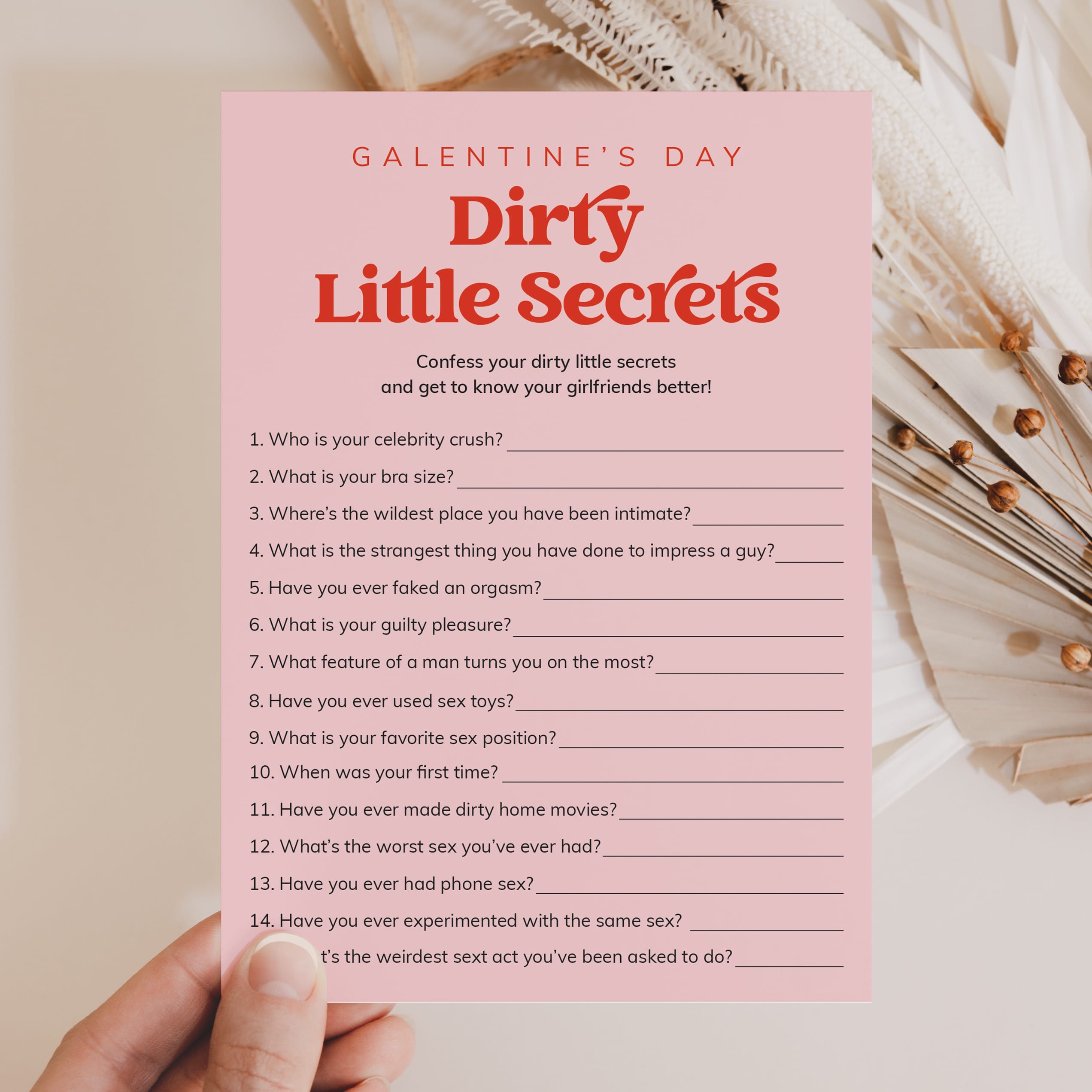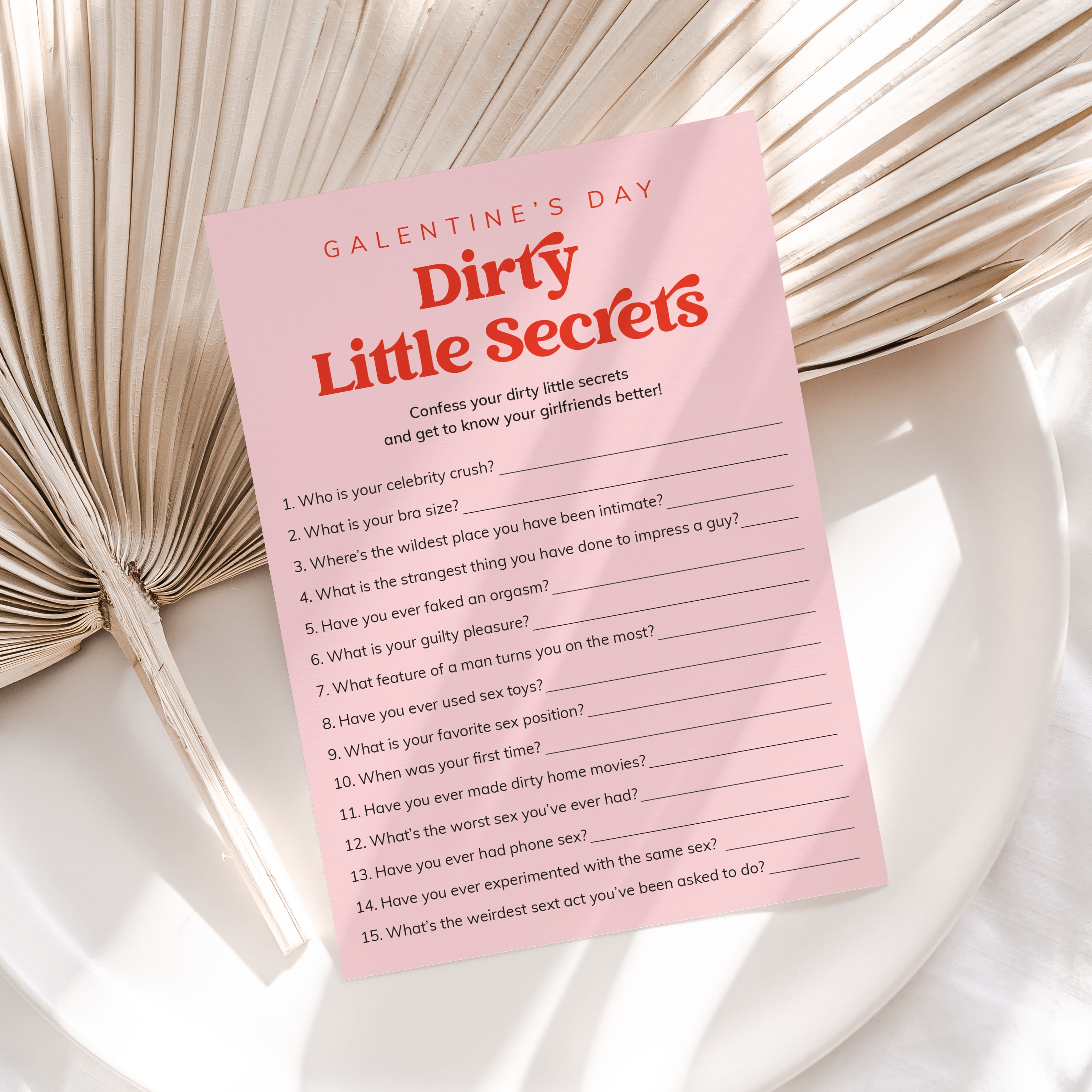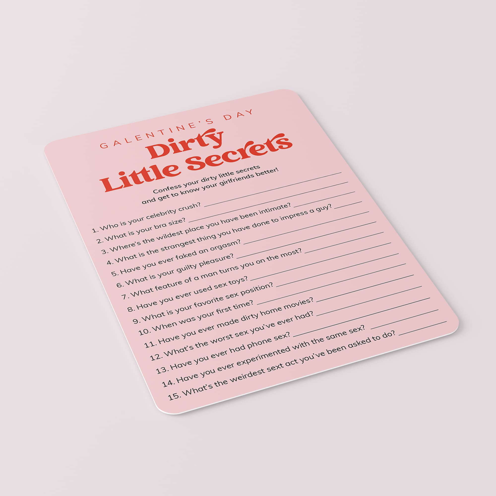 The questions on this vibrant game card reveal a saucier side to your girlfriends you might not recognize. It is a hilarious addition to your Galentine's Day Party.