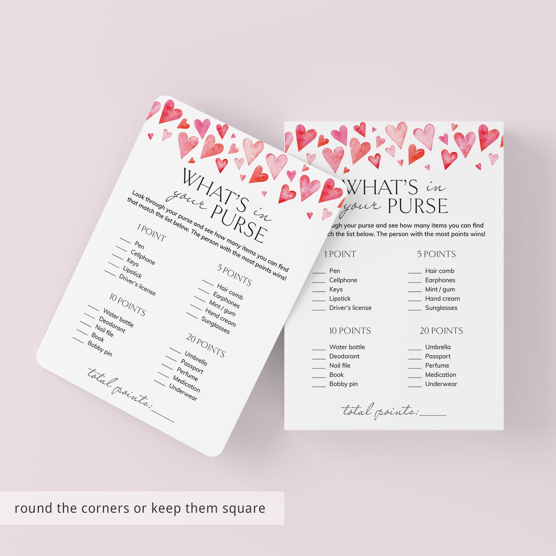 The cute game card with watercolor hearts lists common and not-so-common items found in handbags, including lipstick, keys, sunglasses and underwear.