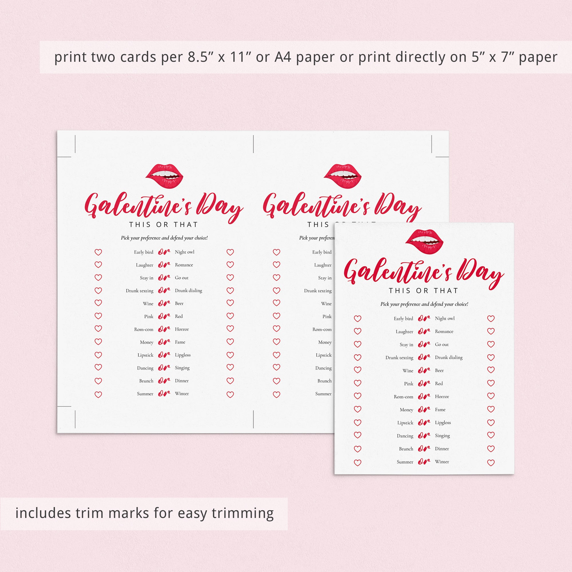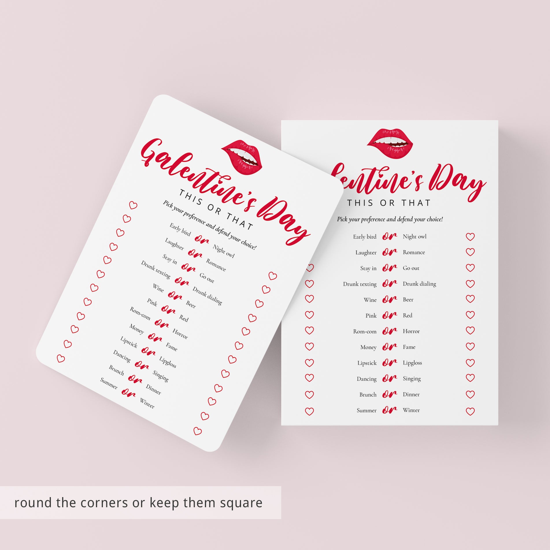 Are you looking for a fun icebreaker game for your Galentines party? Play This or That. It's is a great conversation starter for your party. This red Galentine's Day game has 14 Would You Rather questions. Have all the ladies pick their preferences and defend their choice.
