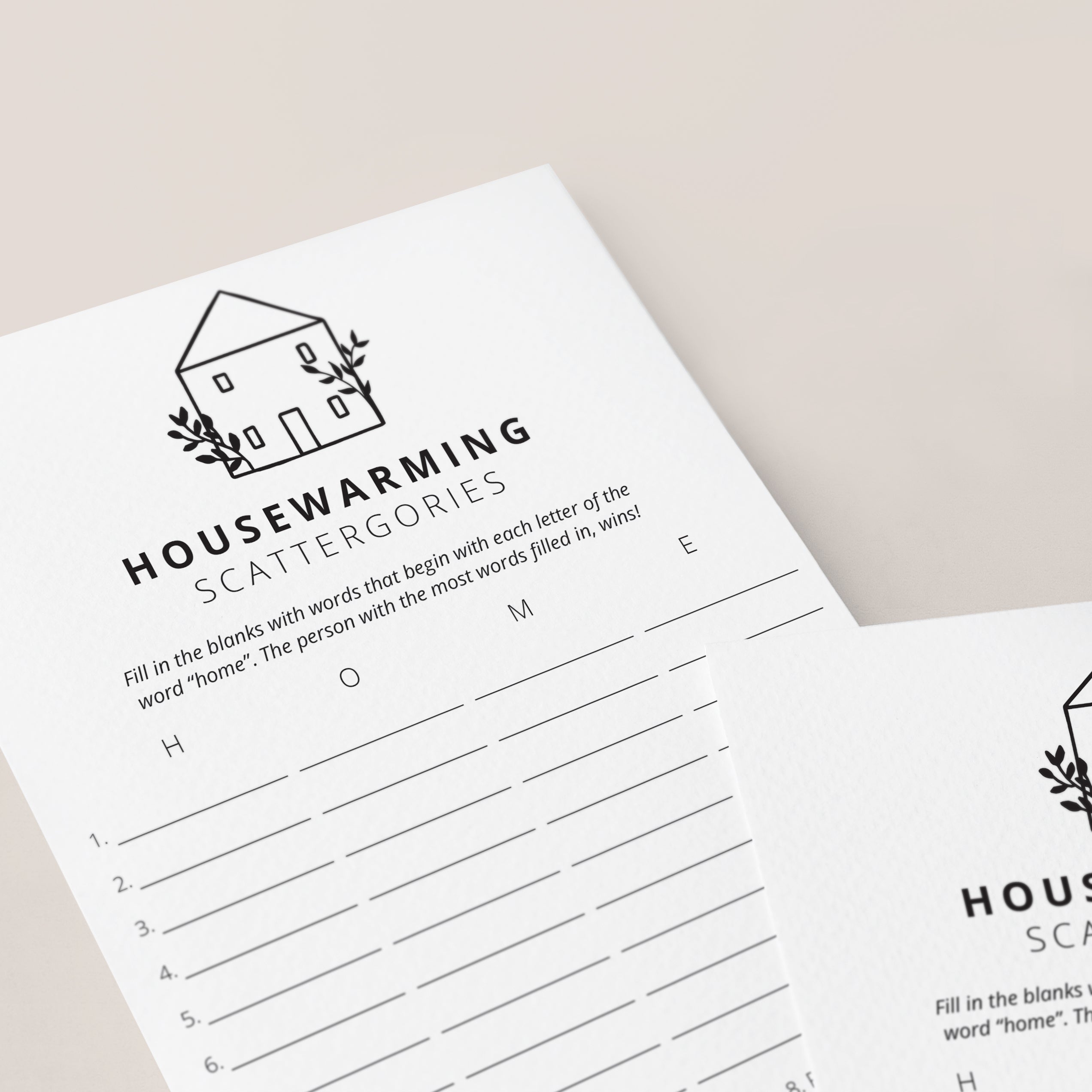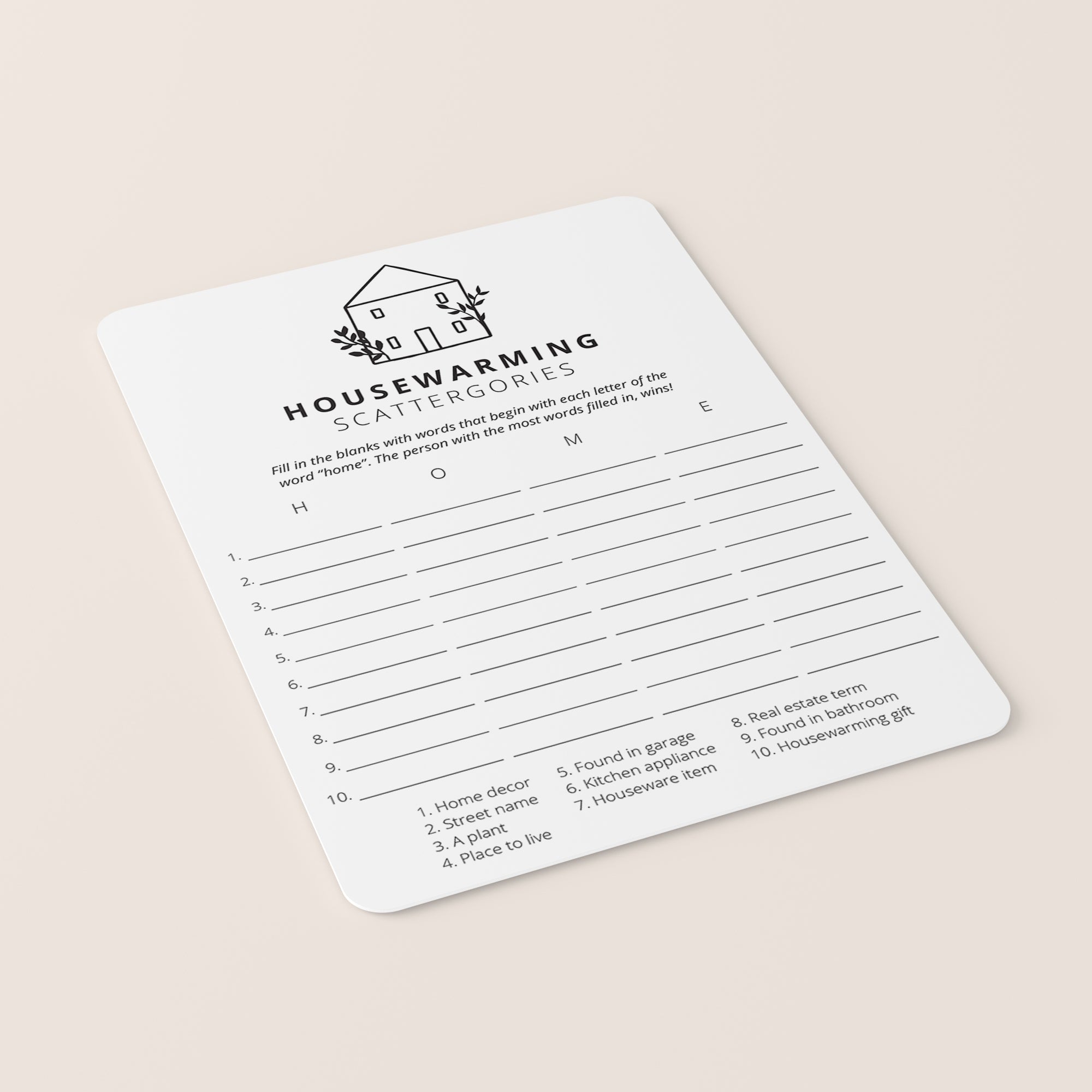 How many words can you fill in with the letters "H", "O", "M" and "E"? Play Scattergories at your housewarming party with these modern minimalist game cards. It's a great game for all ages and the black and white design will fit any housewarming party theme.