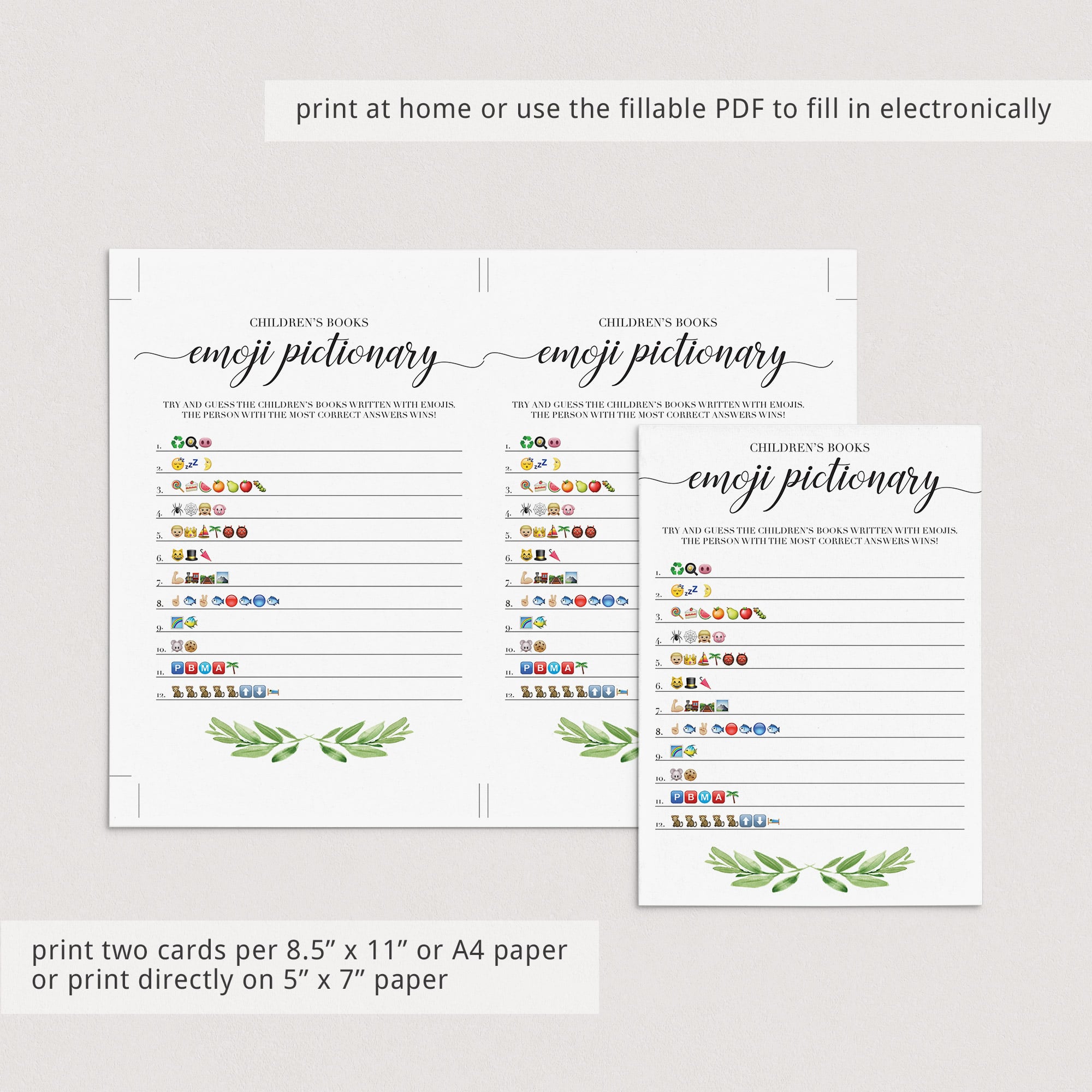 Are you looking for a unique game to play at your (virtual) baby shower? Play Children's Books Emoji Pictionary with this gorgeous greenery game card. The game is perfect for a gender neutral or greenery themed baby shower. Printable and electronically fillable files are included.