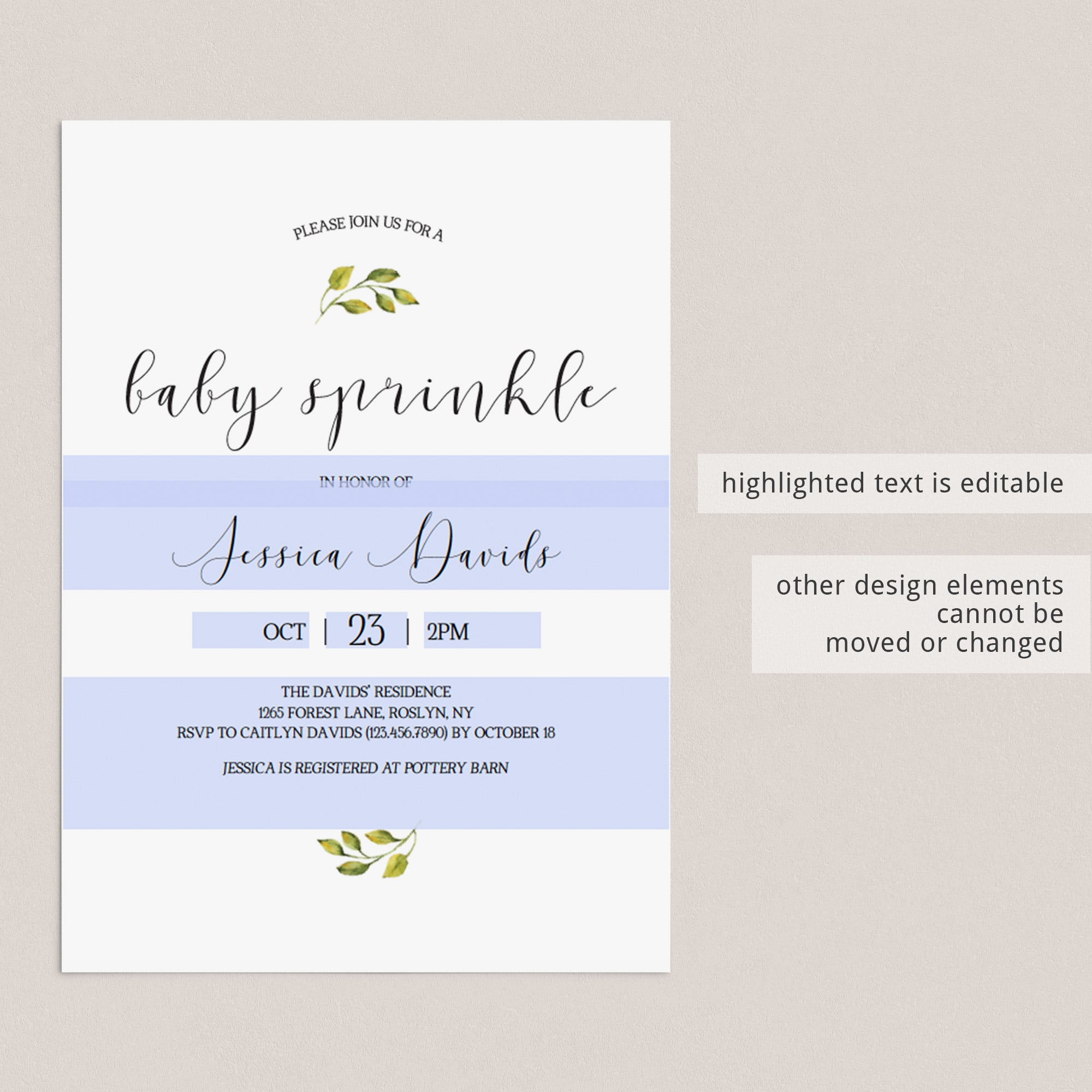 Print the invites right from your computer or have them printed at your favorite print shop. Or use the included baby sprinkle evite template to invite your guests by email.