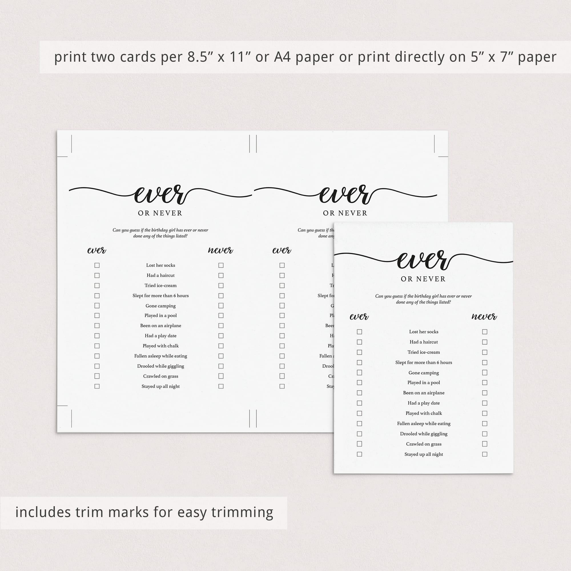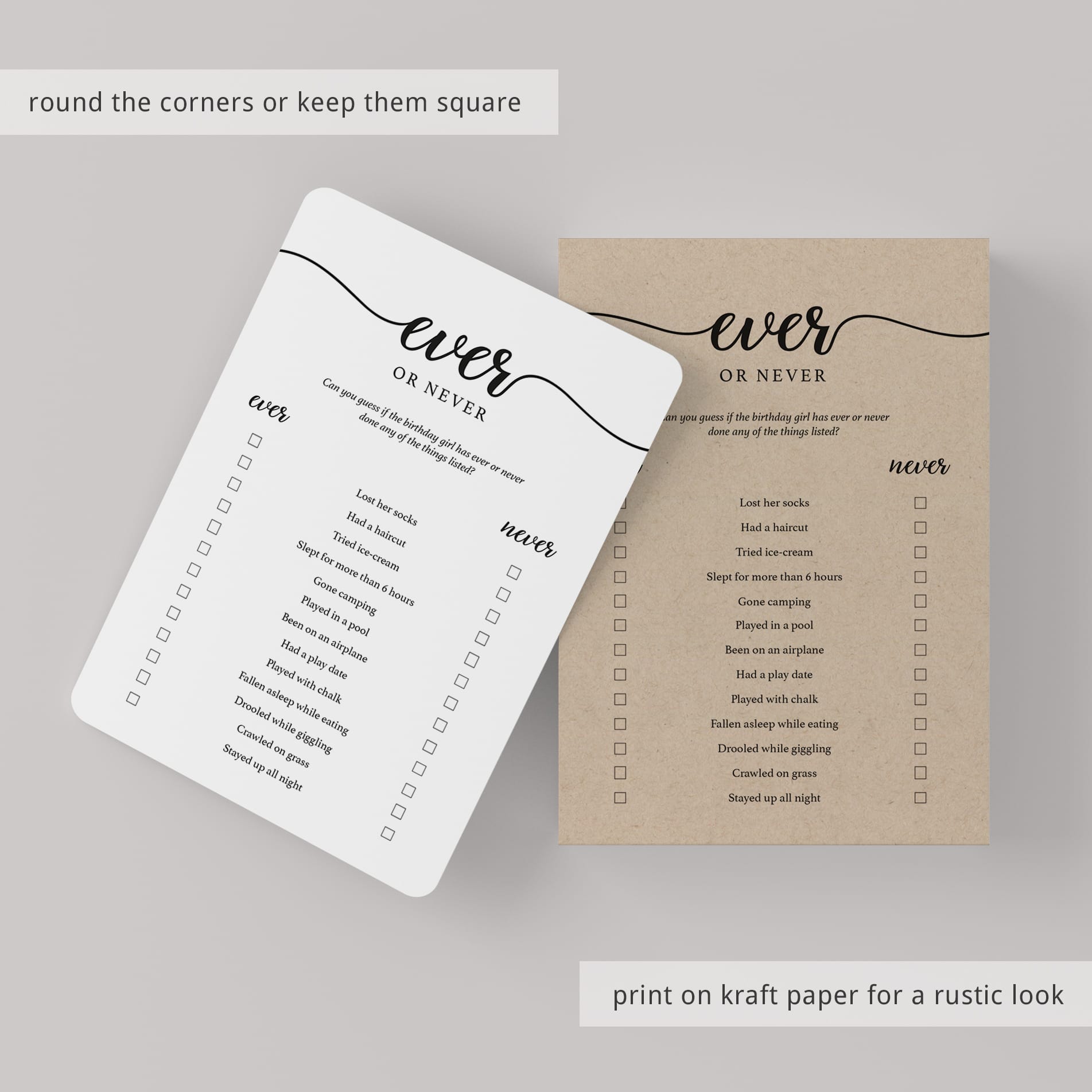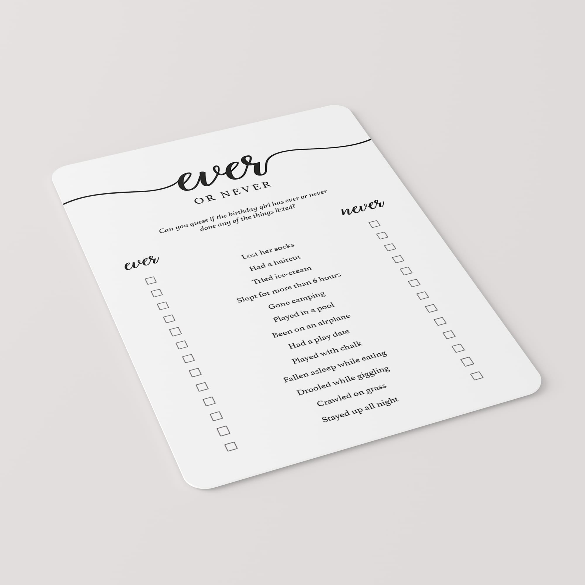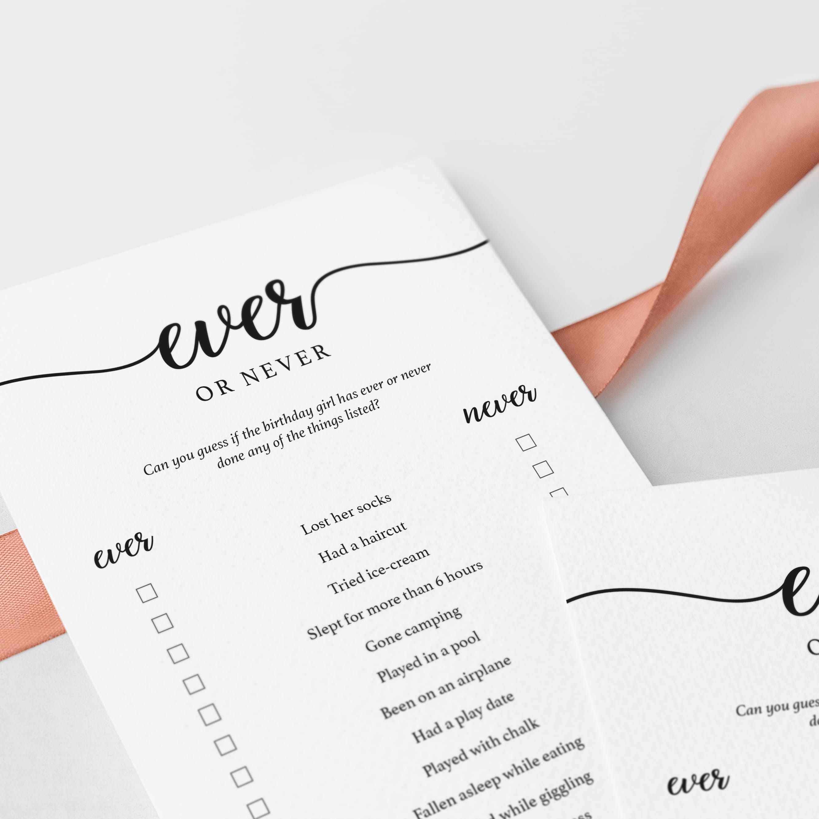 Are you looking for a fun birthday party game for your daughter's first birthday? Play Ever or Never with these gorgeous calligraphy game cards. The minimalist cards will fit any first birthday party theme.