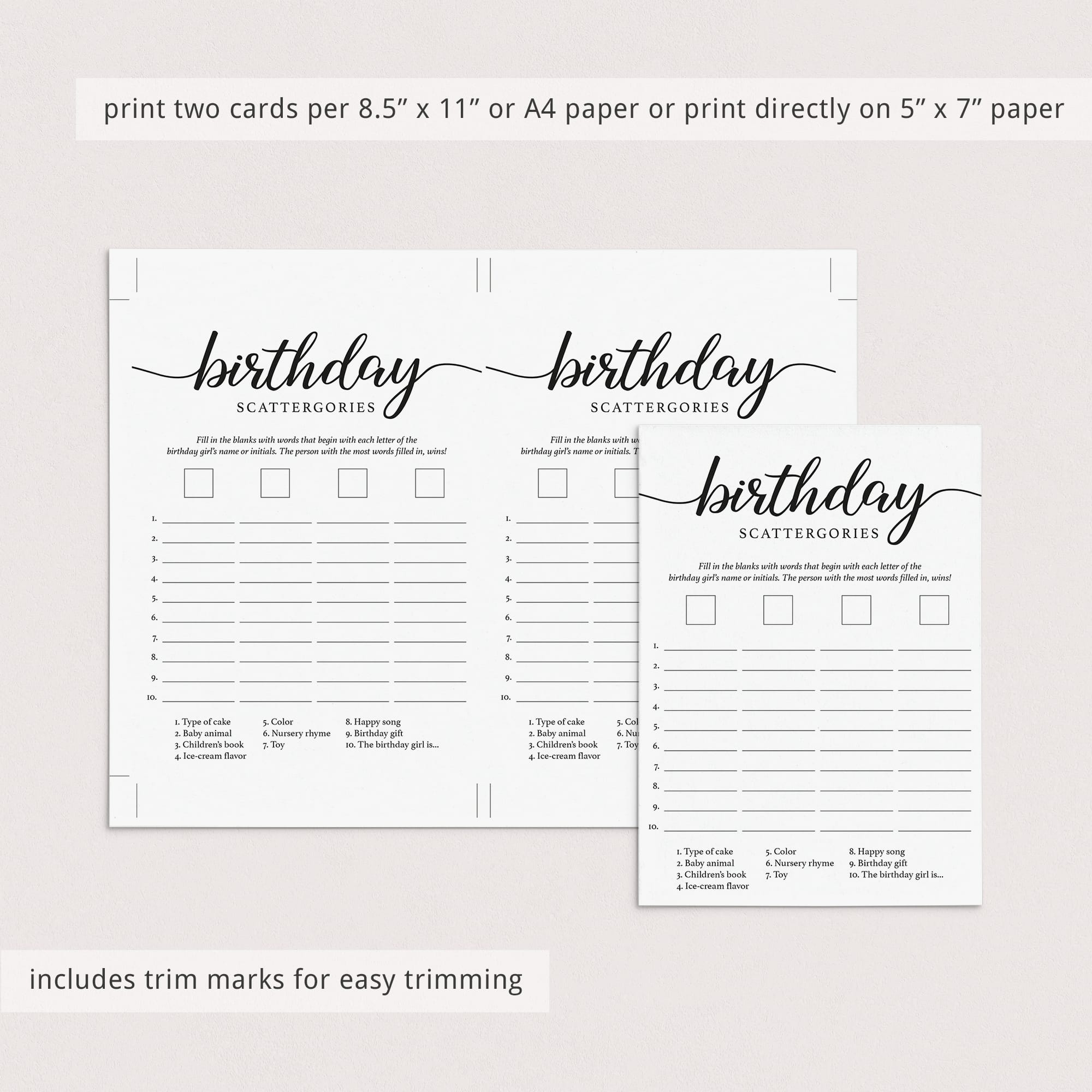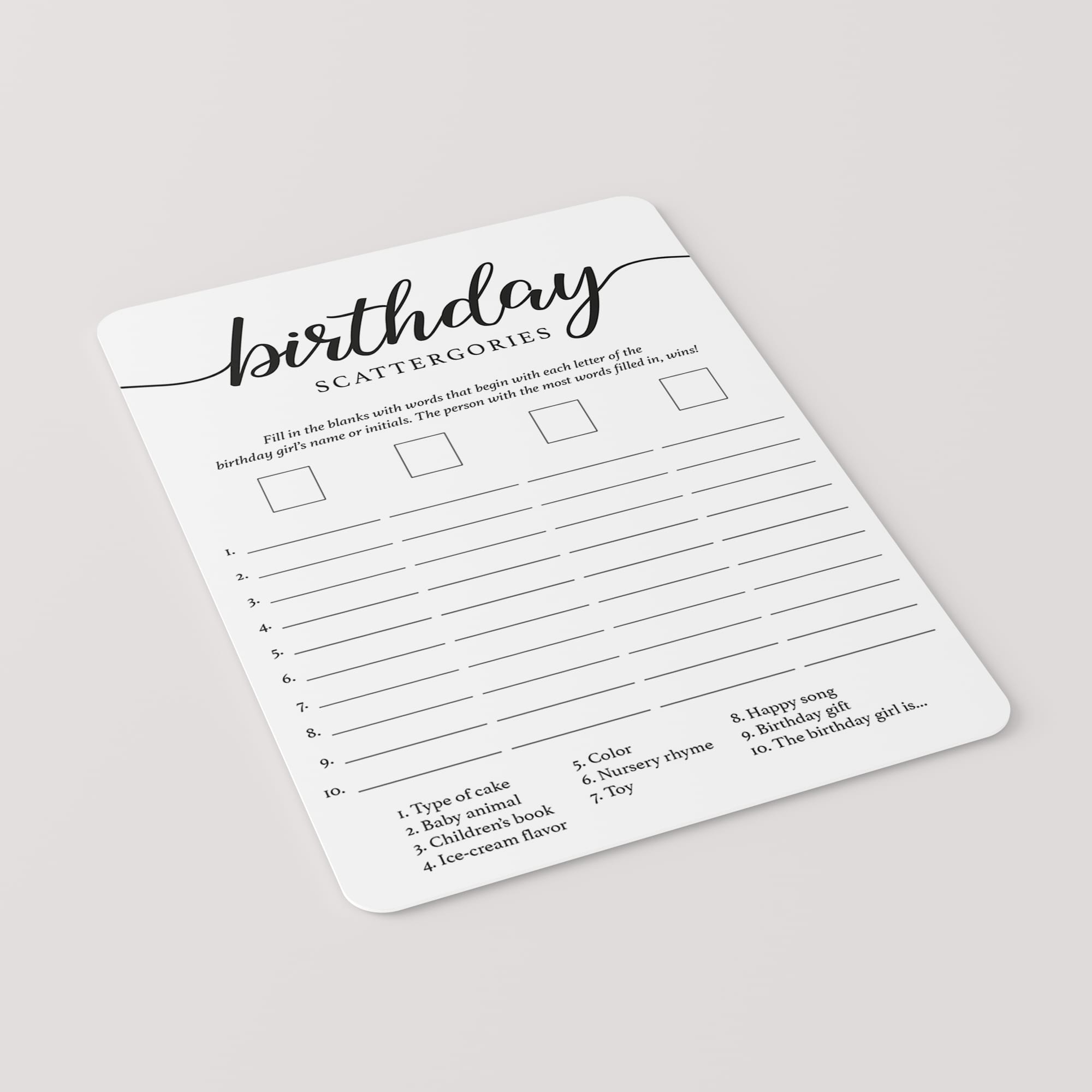 How to play the Birthday Scattergories game? Simply hand out a game sheet and a pen to your guests. Let them fill in the letters of your girl's name (or her initials) in the squares. Then they will have to come up with as many words related to the categories at the bottom of the sheet. The difficulty is that the words must begin with the letters in the squares. The person that gets the most answers filled in within the set time, wins!