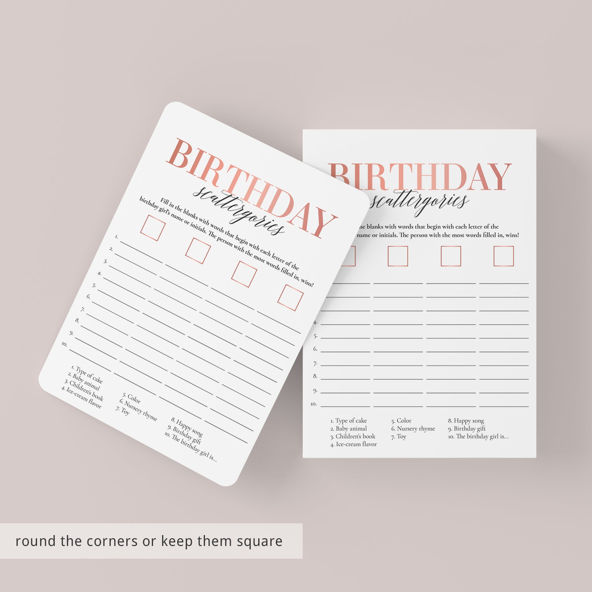 How to play the Birthday Scattergories game? Simply hand out a game sheet and a pen to your guests. Let them fill in the letters of your girl's name (or her initials) in the squares. Then they will have to come up with as many words related to the categories at the bottom of the sheet. The difficulty is that the words must begin with the letters in the squares. The person that gets the most answers filled in within the set time, wins!