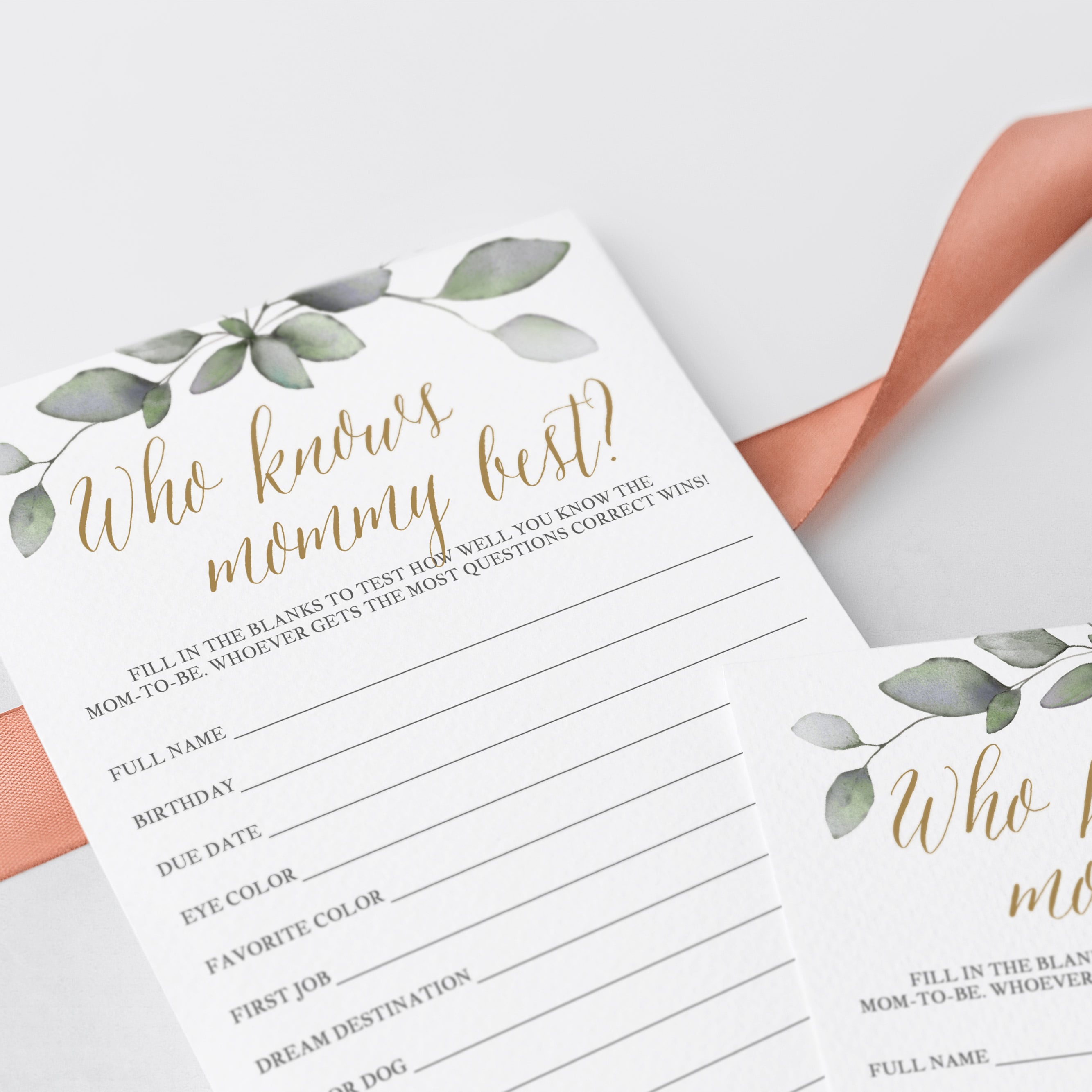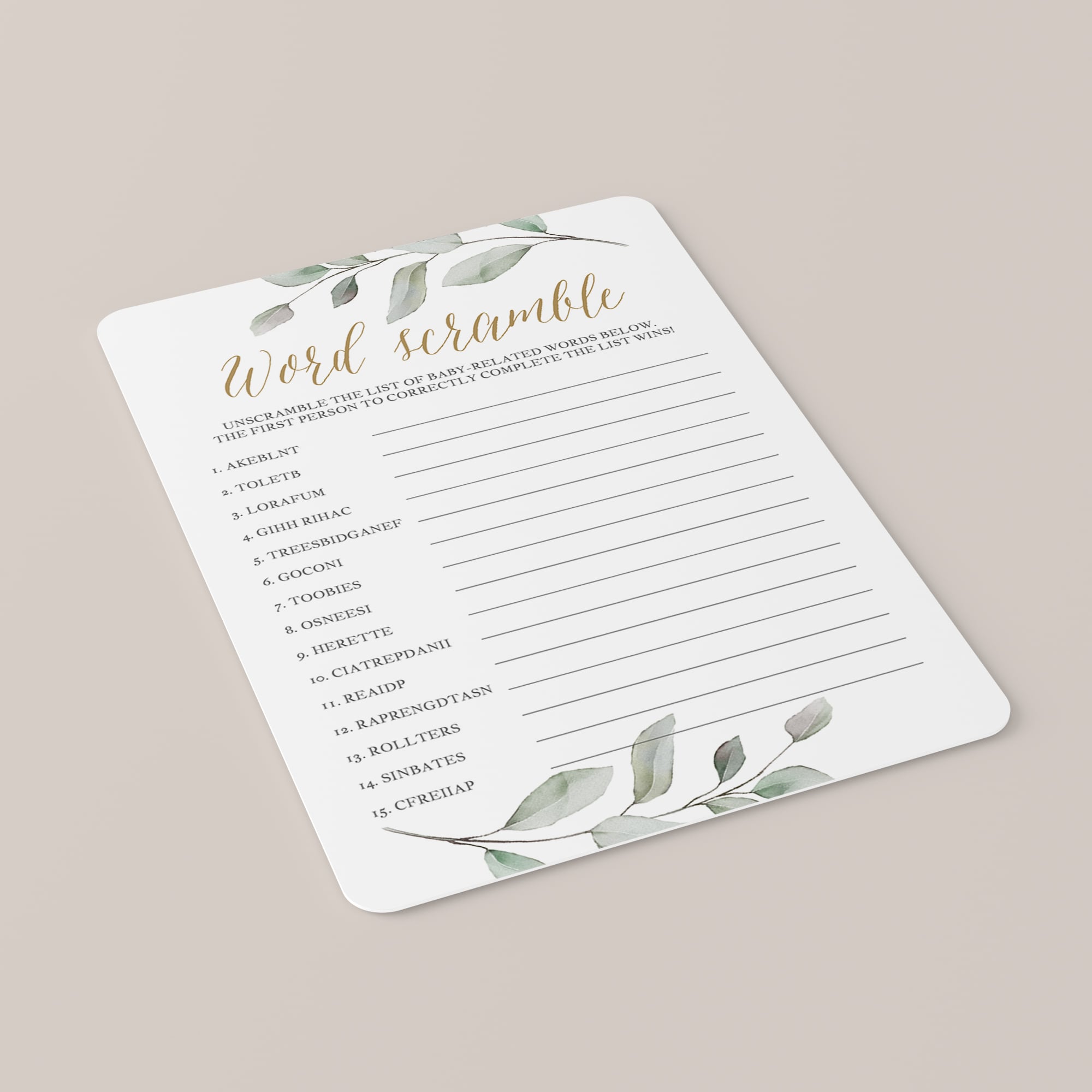 This gold and greenery baby shower games pack includes the following 4 popular games: