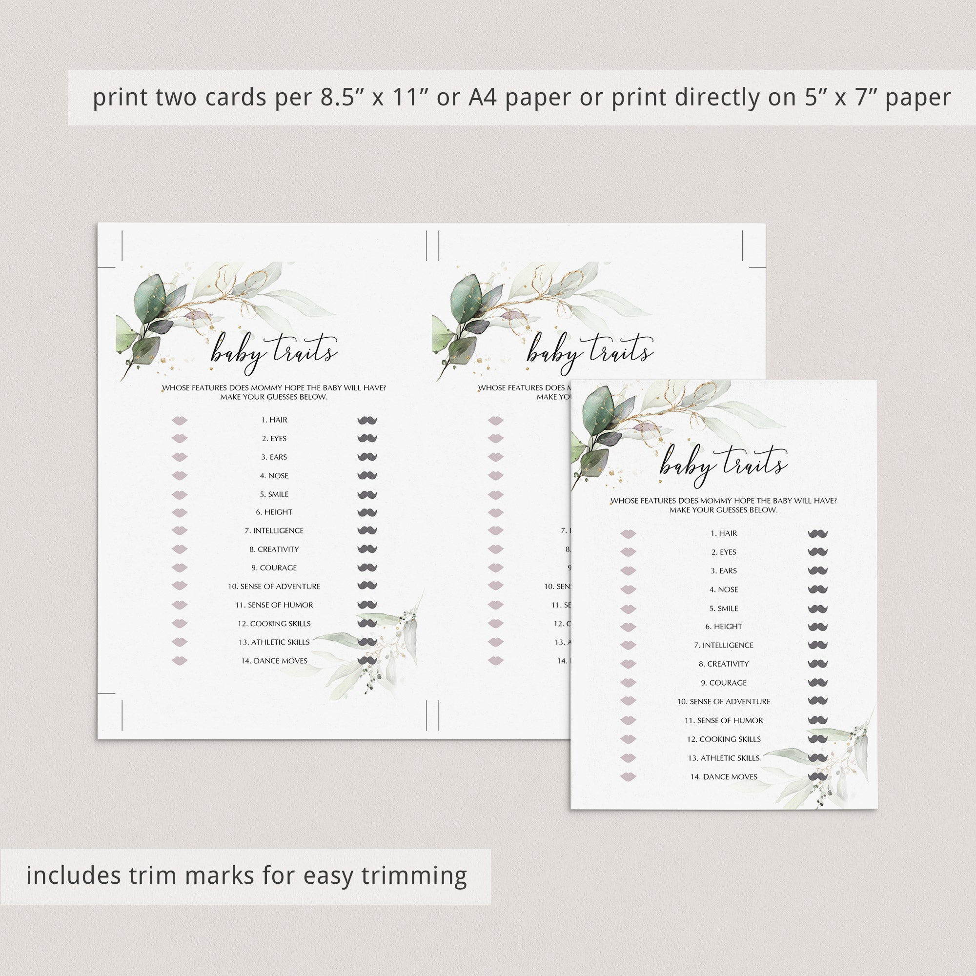Most new mom’s wonder who their baby will look like and who the baby gets a particular skill from. Play this fun Baby Traits game and find out what features the mom-to-be would like the baby to get from her and what features from the expecting dad. This elegant game card with gold foil and watercolor green leaves is perfect for a gold and greenery themed baby shower.
