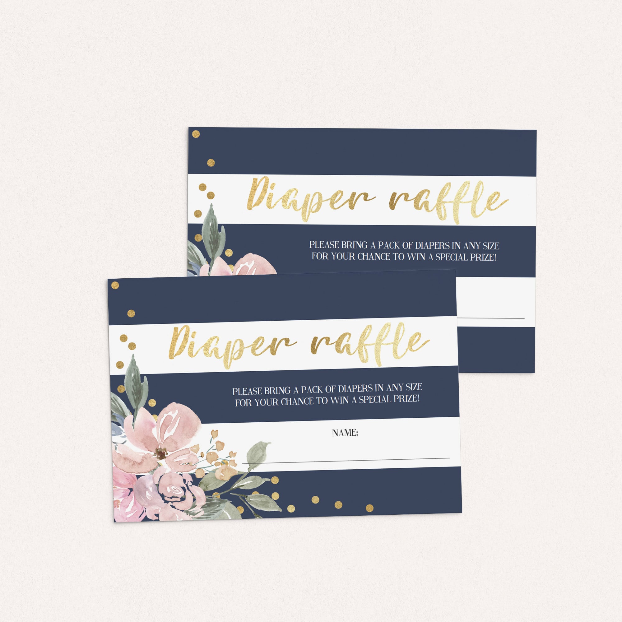 Who doesn't love a diaper raffle during a baby shower? Use this gorgeous floral, gold and navy diaper raffle ticket to let your guests know they can win a great prize by bringing a pack of diapers. Include the inserts in your baby shower invitations before sending them out.