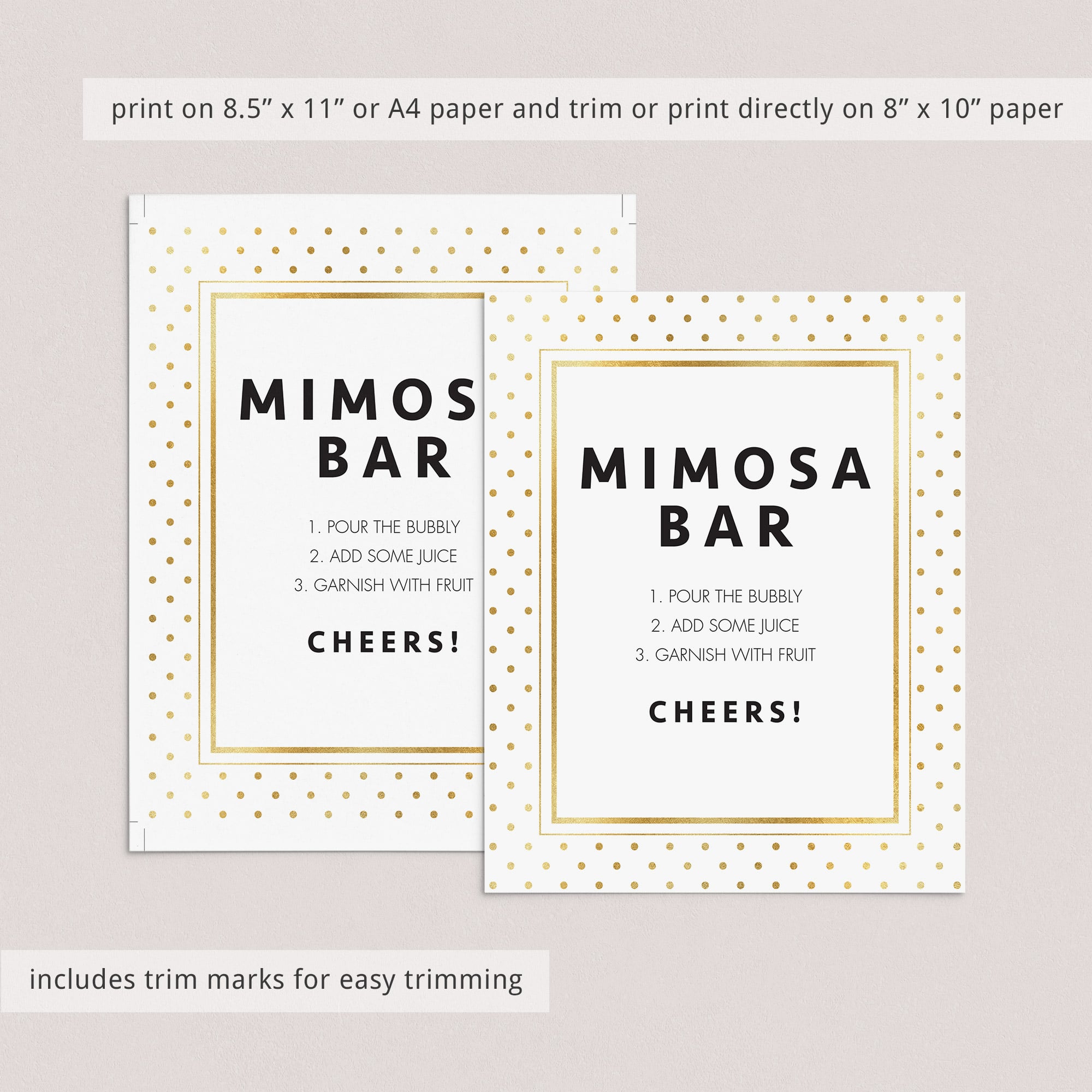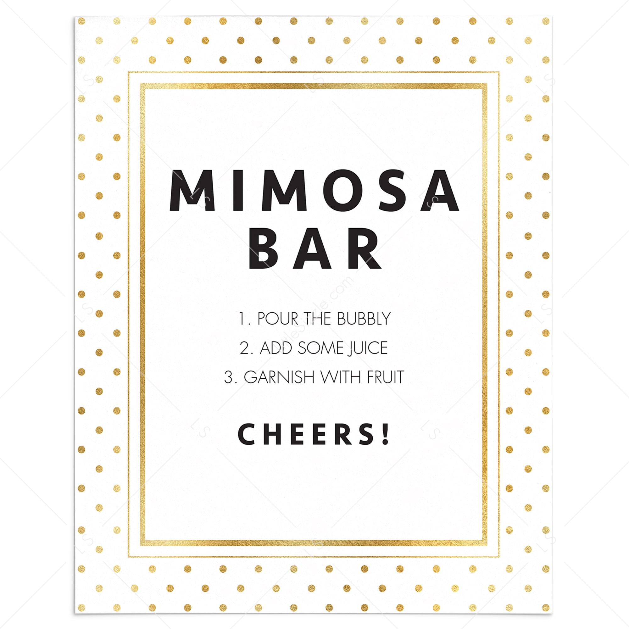 This printable Mimosa Bar sign is an instant download, so simply download and print the sign right from your computer in a matter of minutes. Frame the sign in a cute frame and you’ll create a wonderful looking Mimosa Bar table.