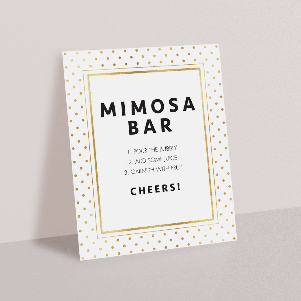 A Mimosa Bar will take your shower to the next level. Use this gold glitter Mimosa Bar sign to decorate your Mimosa Table and help guests know how to prepare their drinks. You'll easily add a modern touch to your shower.