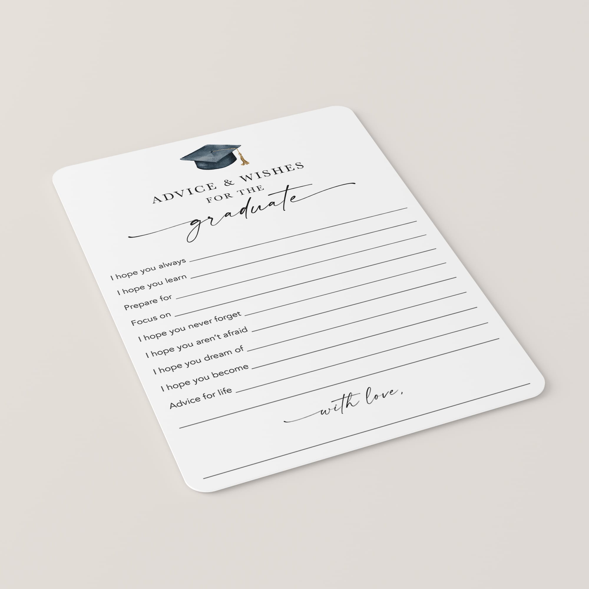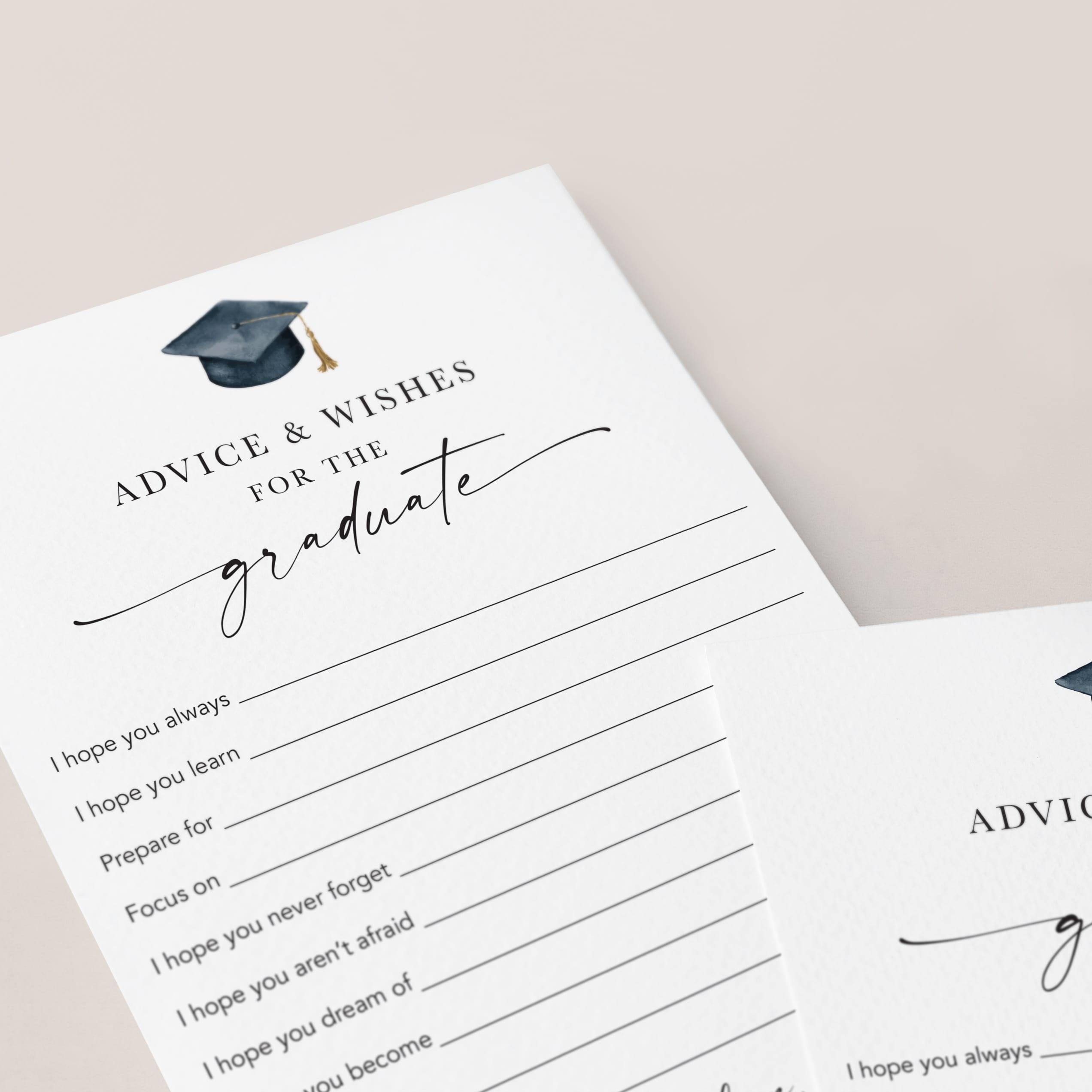 Give the graduate a heartfelt keepsake with these elegant 'Advice & Wishes for the Graduate' cards. Featuring a modern script and a stylish watercolor graduation cap, these cards seamlessly complement any graduation party theme. Invite guests to share their best wishes and advice, creating a treasured collection of memories for the graduate to cherish.