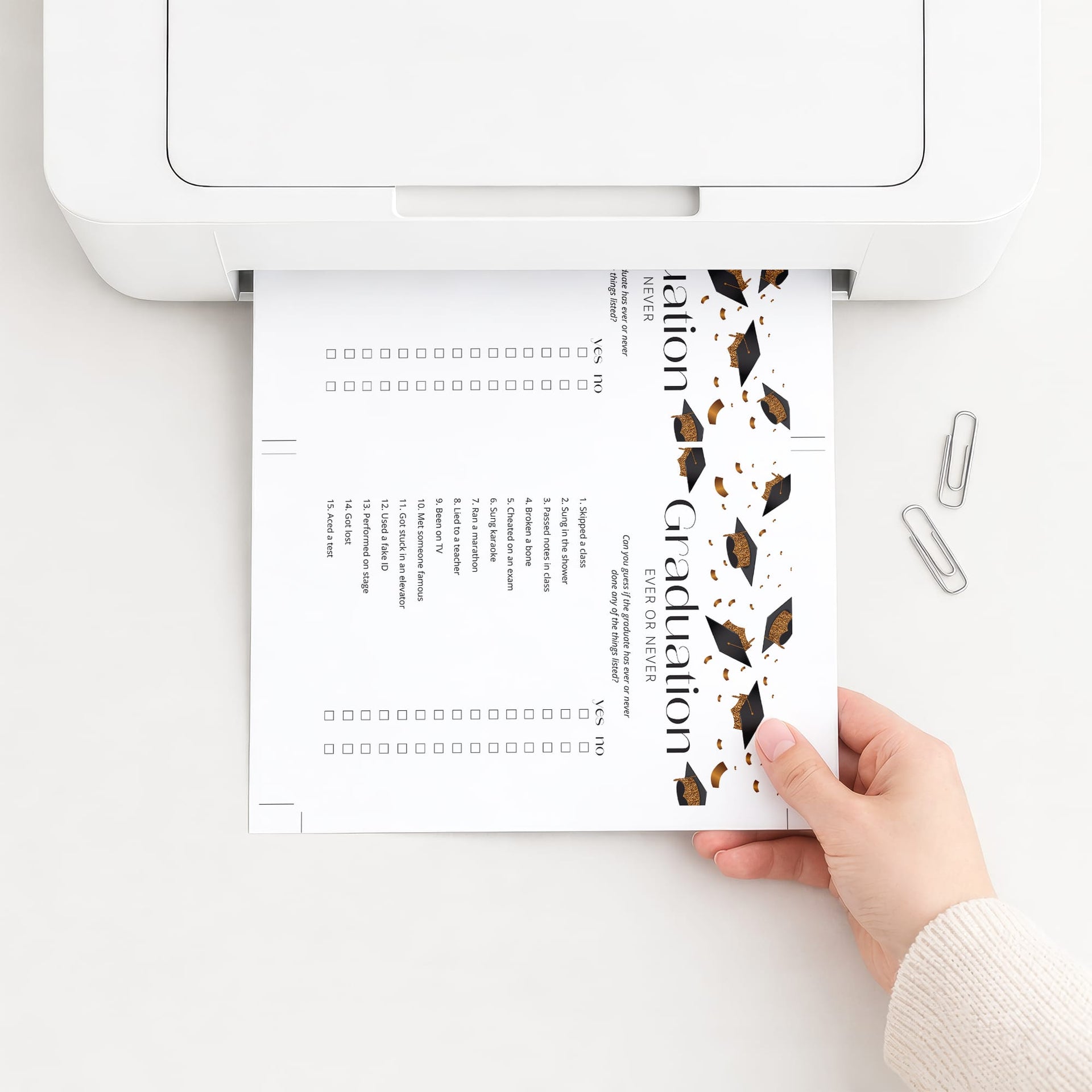 Are you looking for a fun Graduation Party game? Play Ever or Never! This black and gold grad party game with tossing caps and confetti will have guests reminiscing of college years gone by.