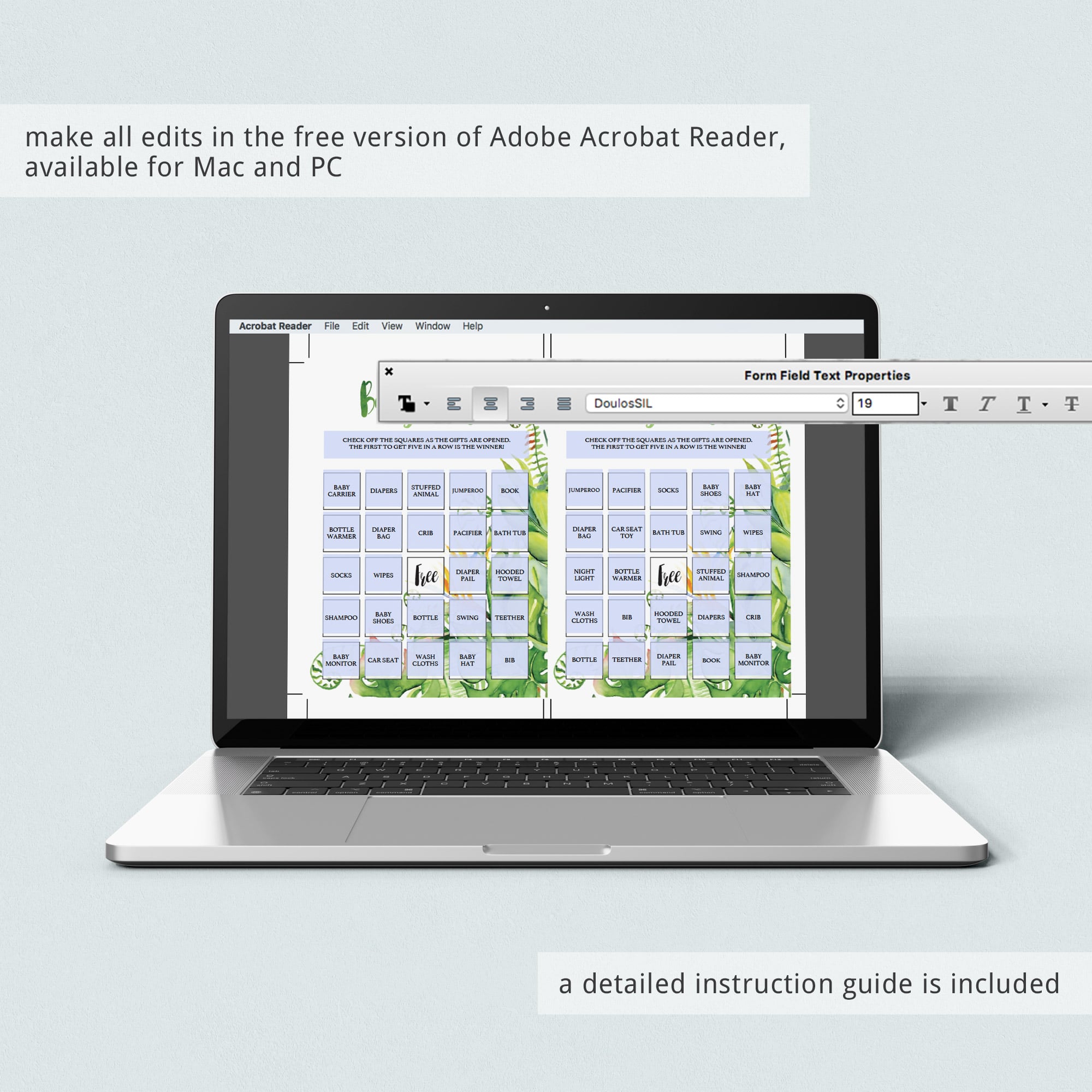 The baby shower bingo cards are instant downloadable files that can be printed right from your computer in a matter of minutes. Or you can have them printed by your favorite print shop. We recommend printing on a nice heavy card stock for the highest quality feel. A detailed instruction guide, with tips & tricks on editing, printing, trimming and more is included.