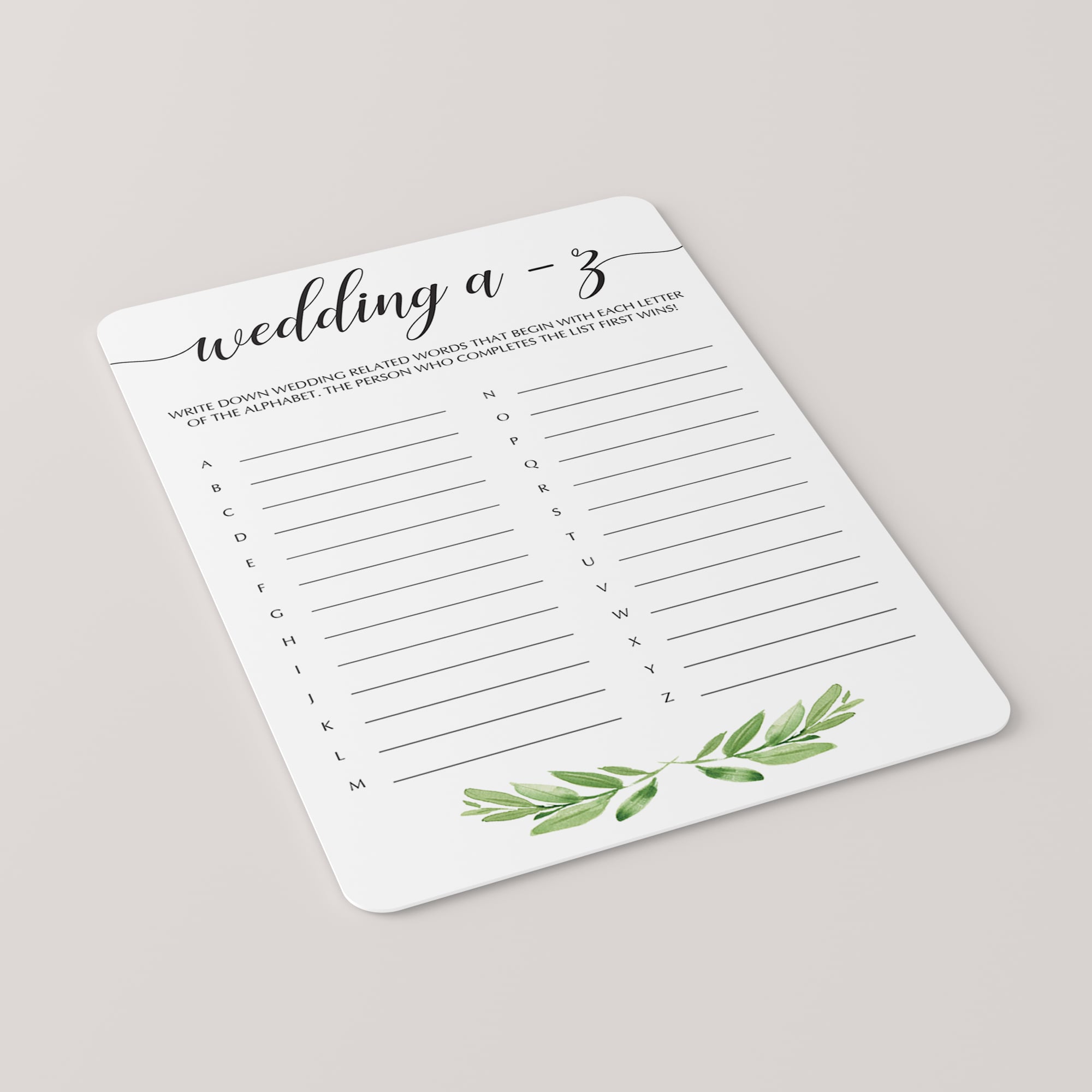 How many wedding related words do you know? Play Wedding A-Z with these gorgeous greenery game cards.