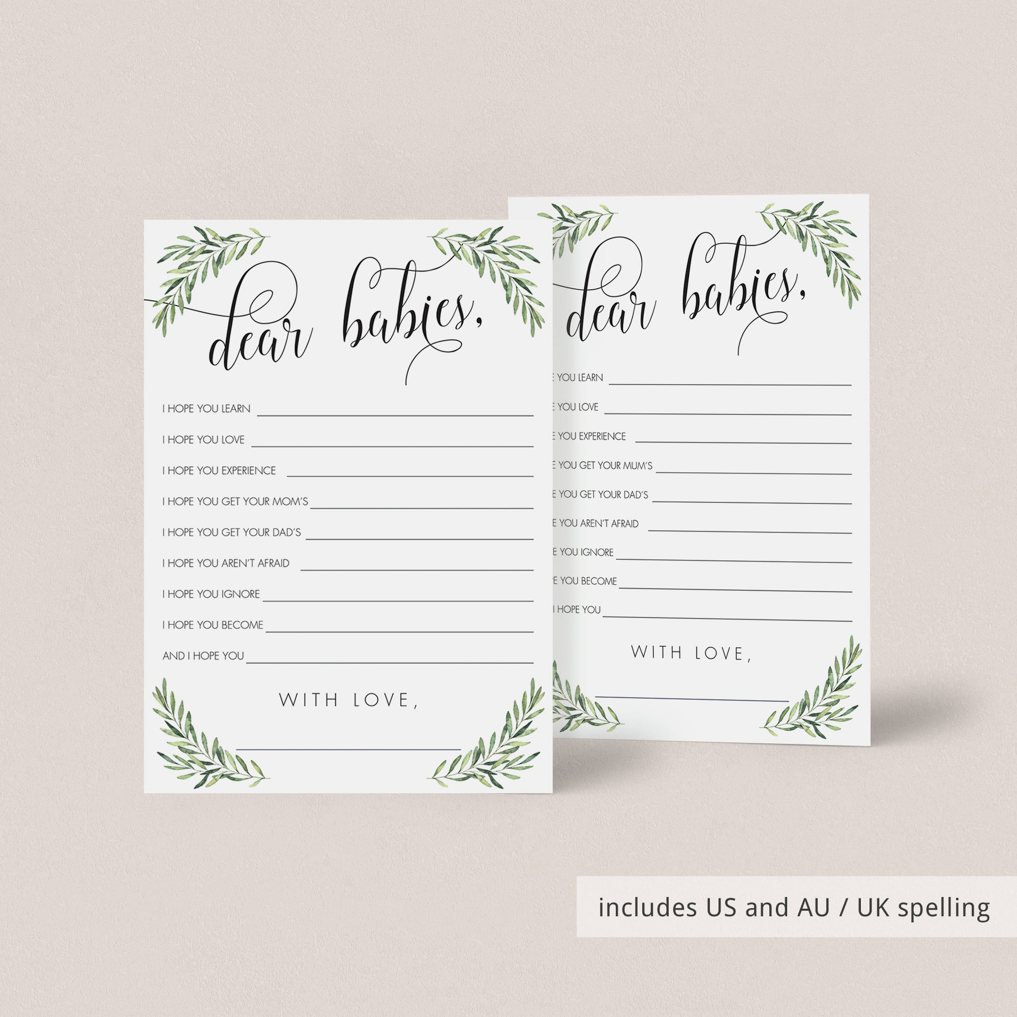 Oh baby baby! Precious twins are on the way! Create a beautiful keepsake with these greenery baby shower wishes for twins cards. Let every baby shower guest write down their wishes for the new babies and collect the greenery cards for the lucky mom-to-be.