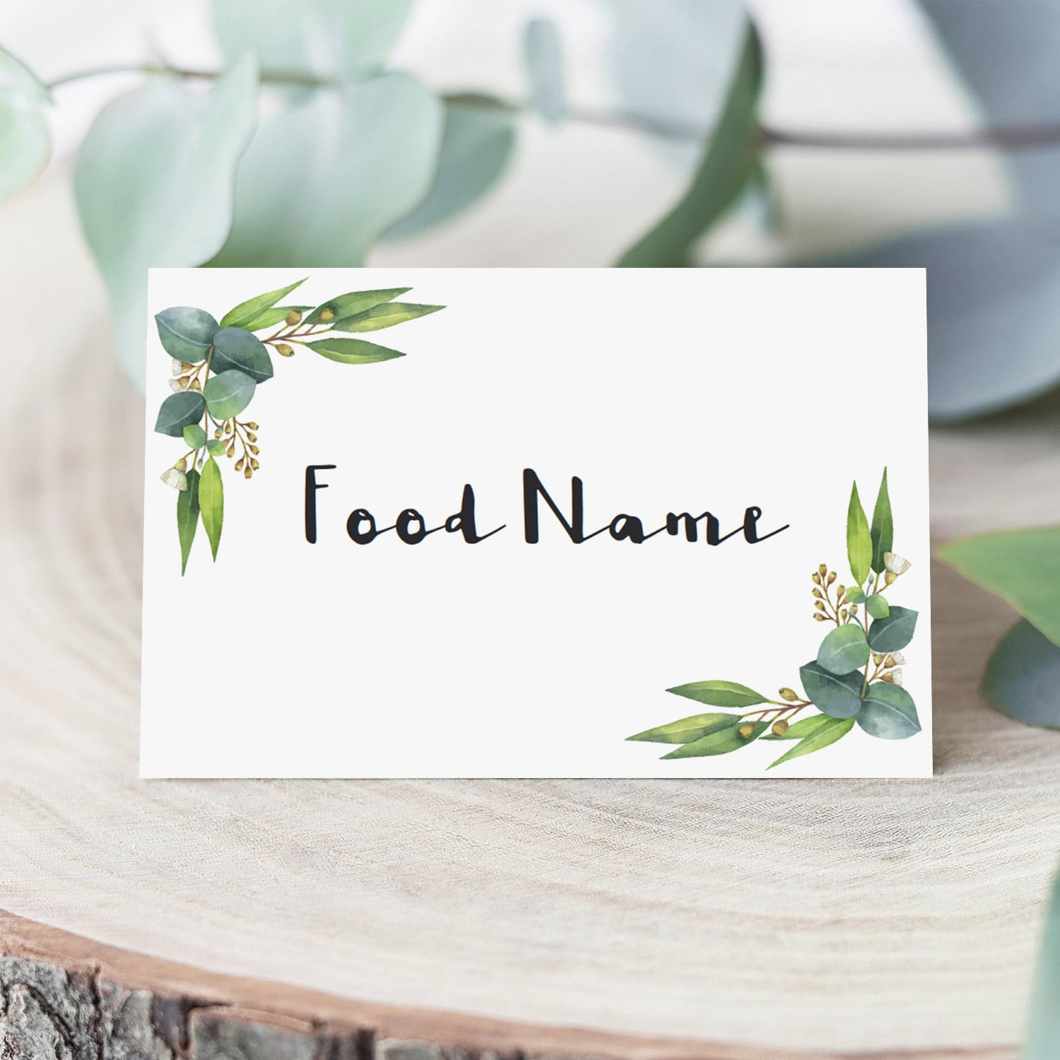 Decorate your buffet table with these greenery food cards with watercolor eucalyptus leaves. The editable food cards are perfect to label desserts or serve as place cards at any green themed event.