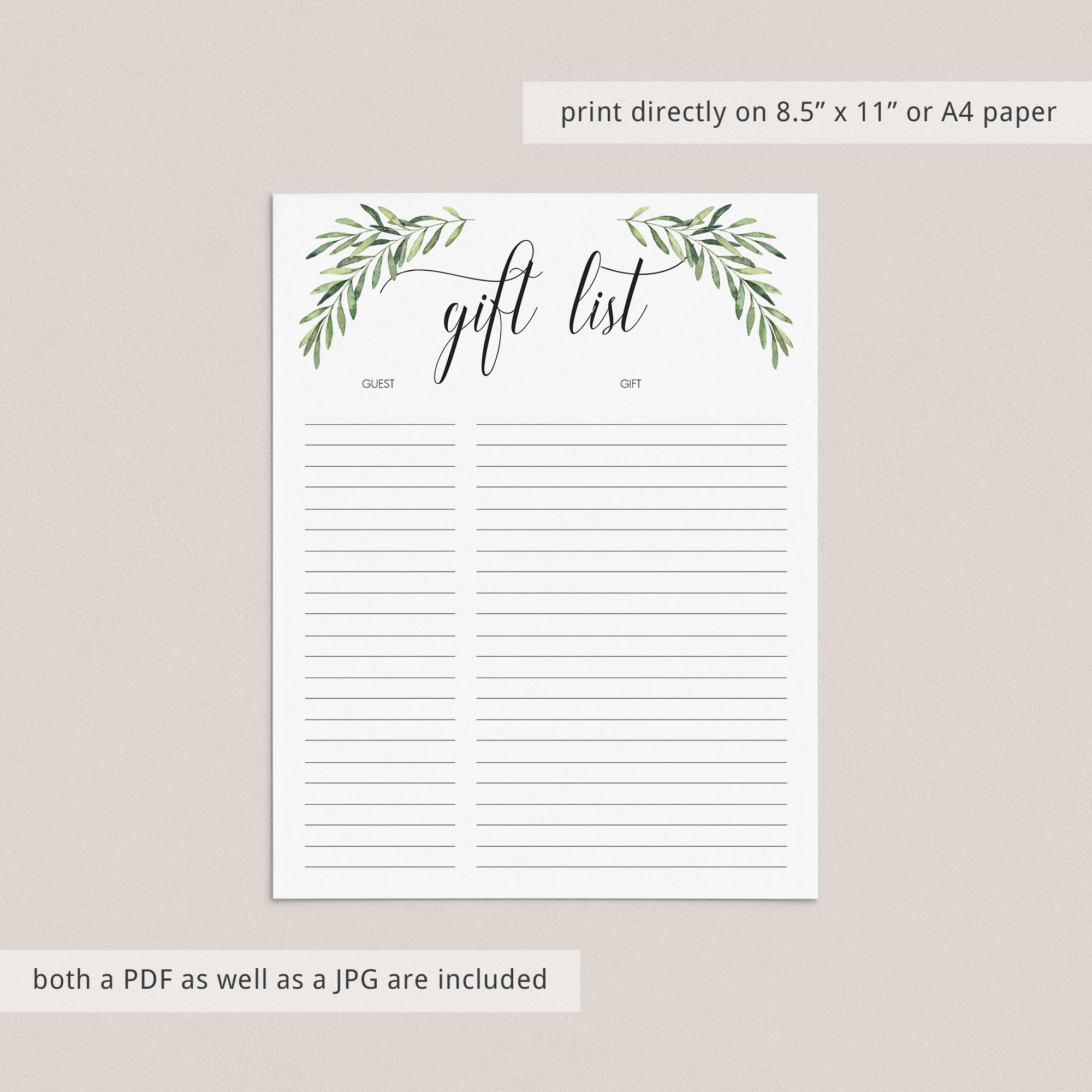 Greenery Guest & Gift List Instant Download by LittleSizzle