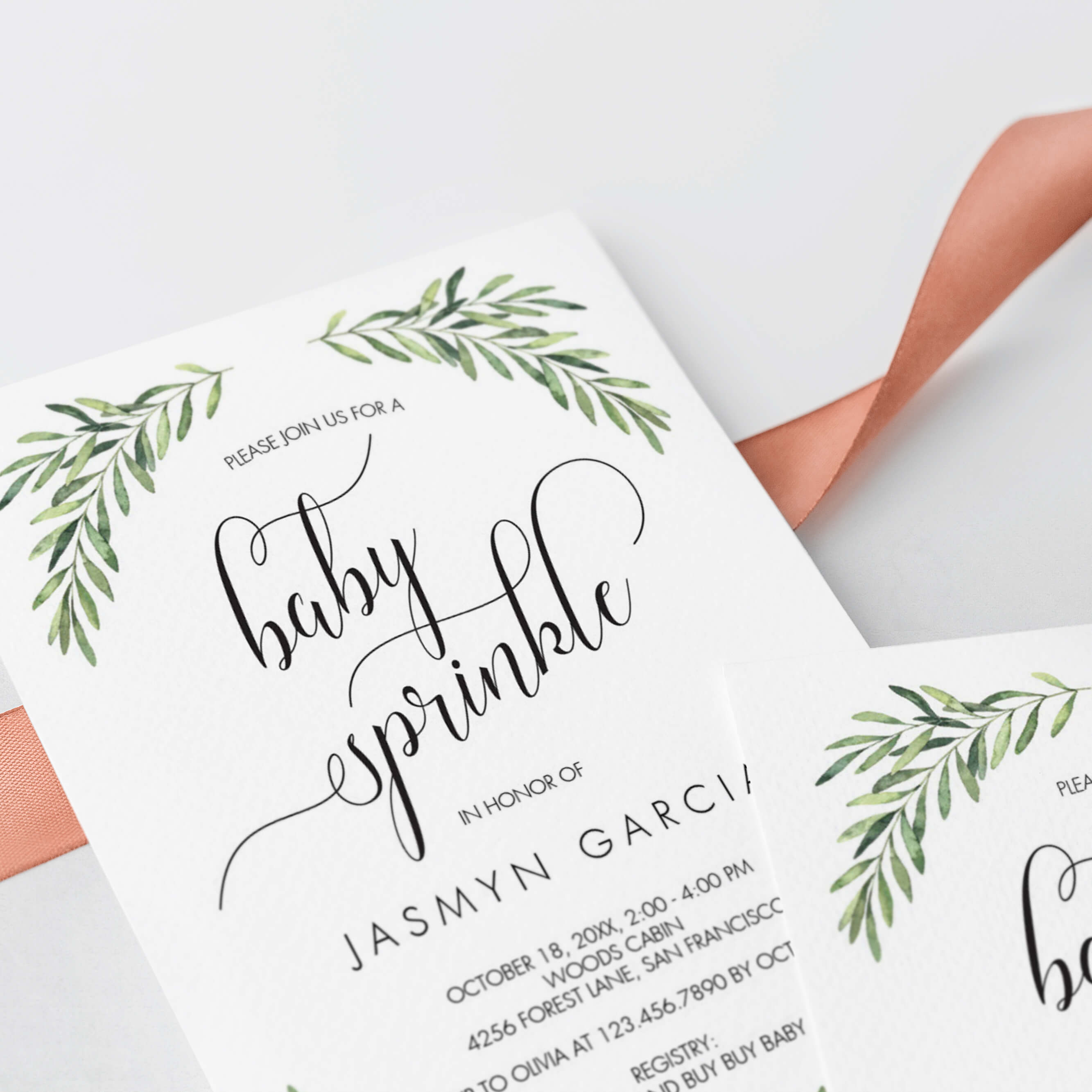 Celebrate the arrival of the new baby and WOW your guests with this beautiful greenery baby sprinkle invite!