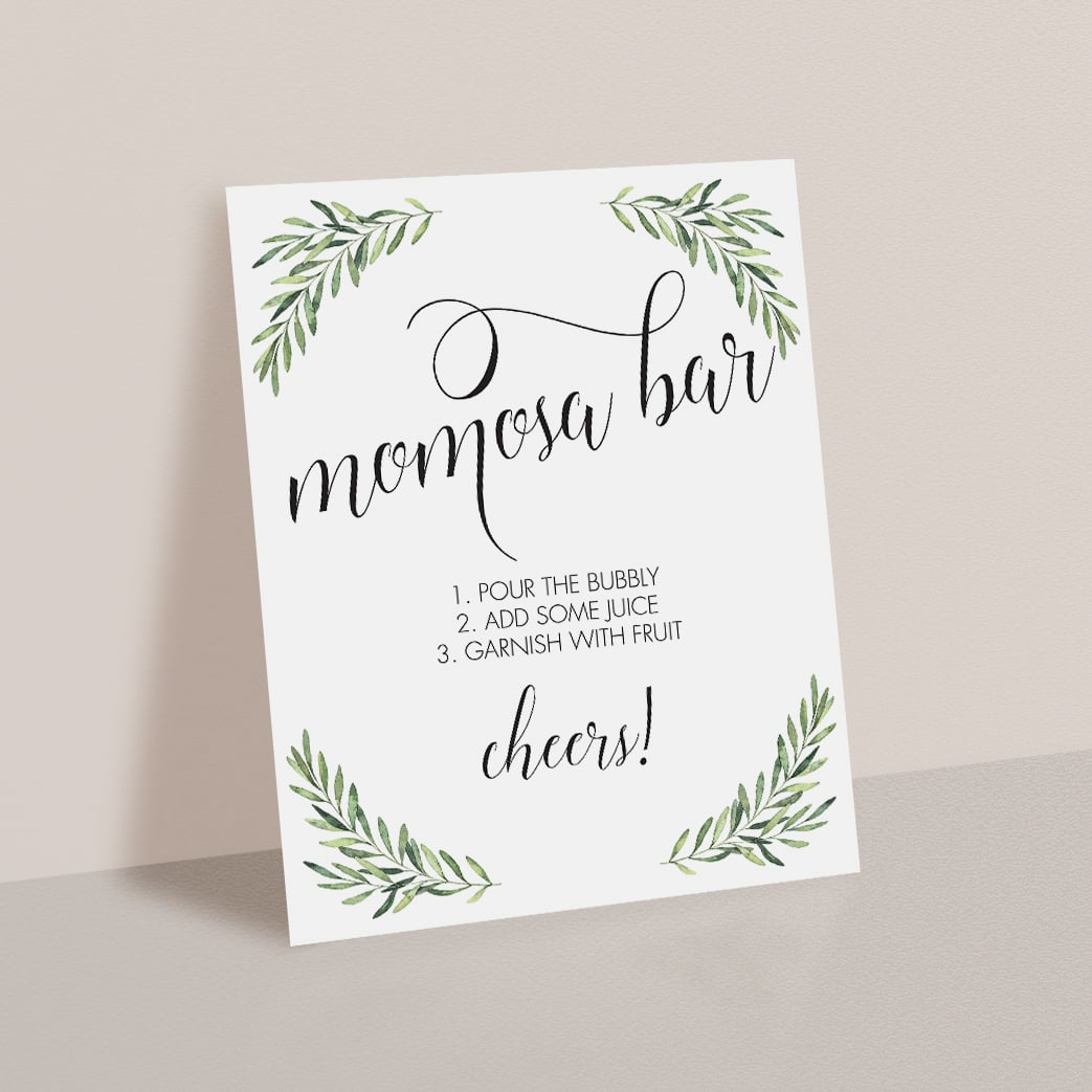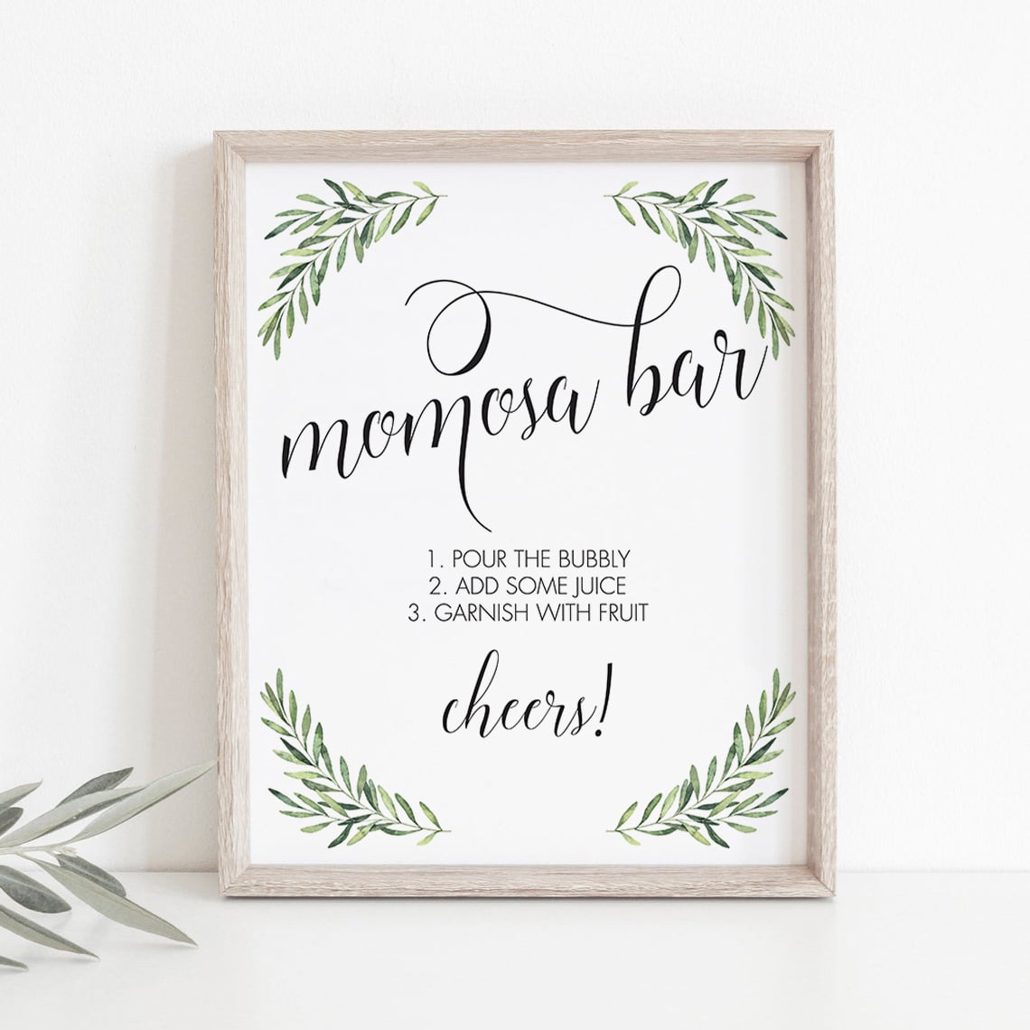 A Mimosa Bar (or as we'd like to call it, a MOM-osa Bar) will take your baby shower to the next level. Use this greenery Momosa Bar sign with olive branches and calligraphy font to decorate your Momosa Bar Table and help guests know how to prepare their drinks. You'll easily add an elegant touch to any baby shower.