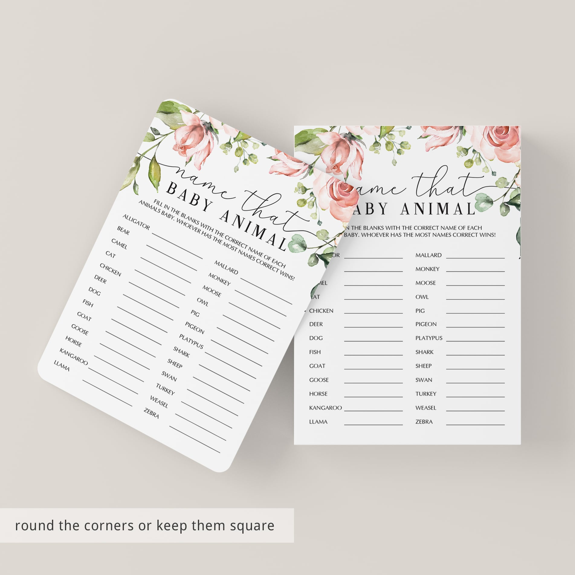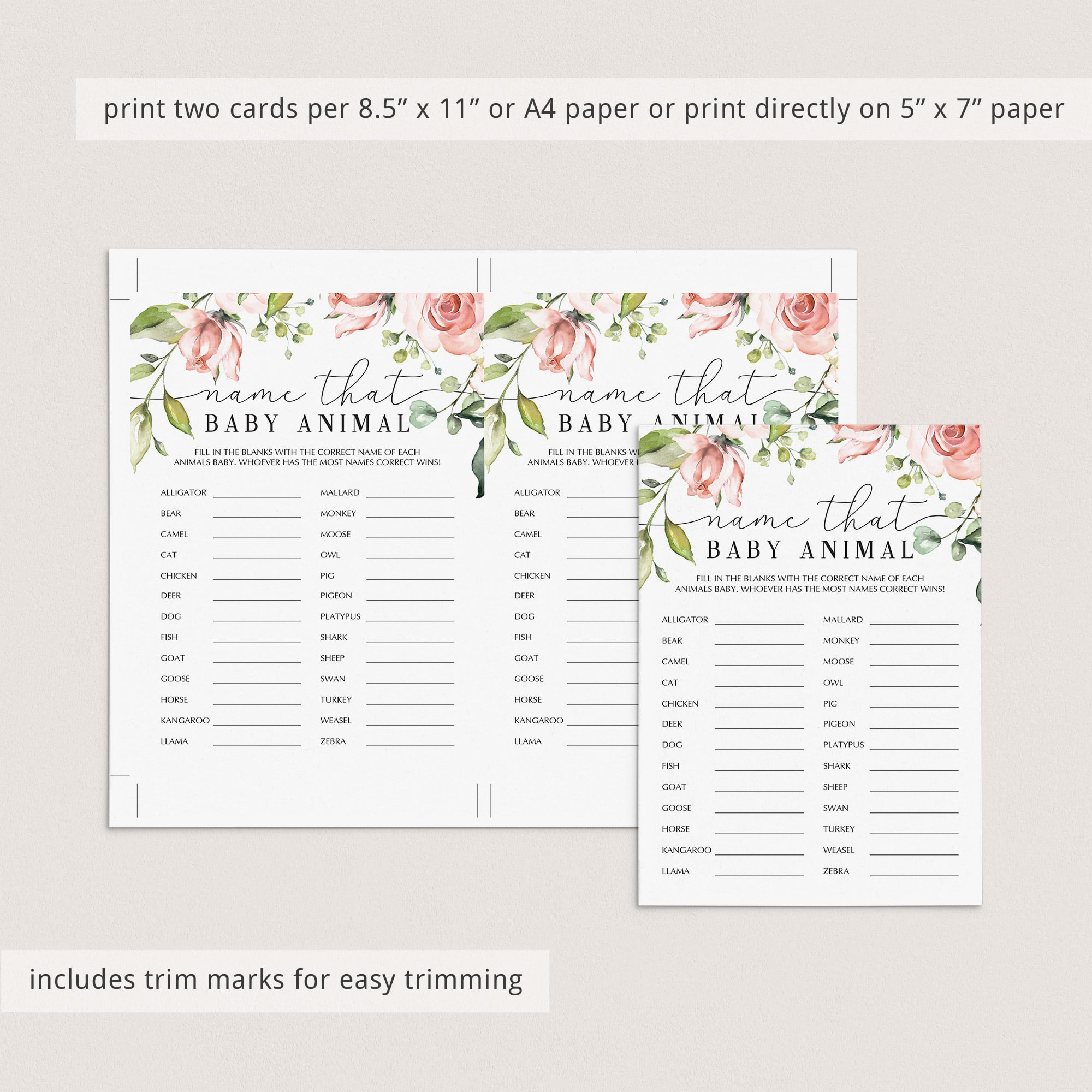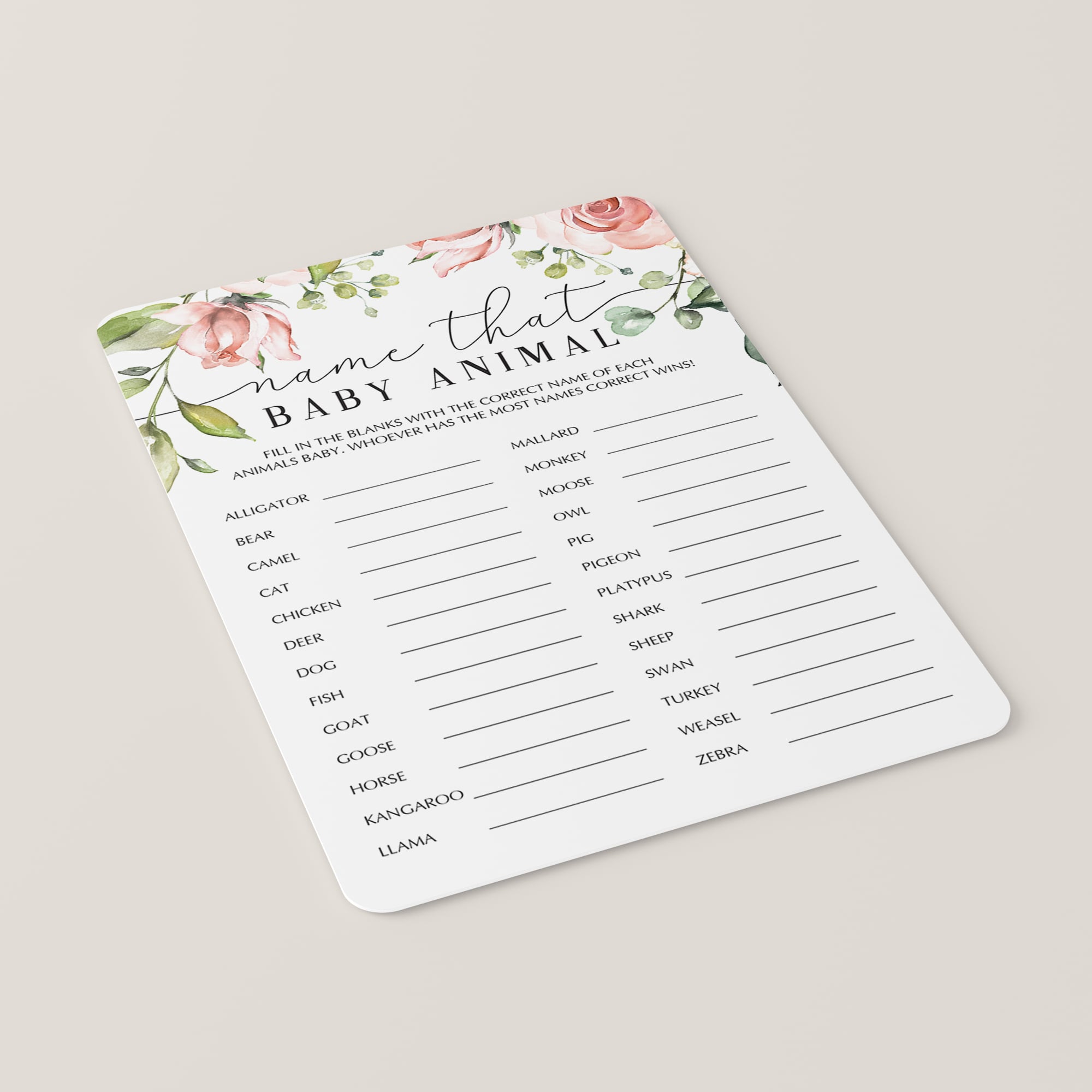 This floral themed baby shower Name the Baby Animal game has a list of 26 animals and a space for your guests to write on. Ask your guests to write the proper name for the animal’s baby opposite the animal name. Whoever has the most names correct wins. The game card is perfect for a garden baby shower.